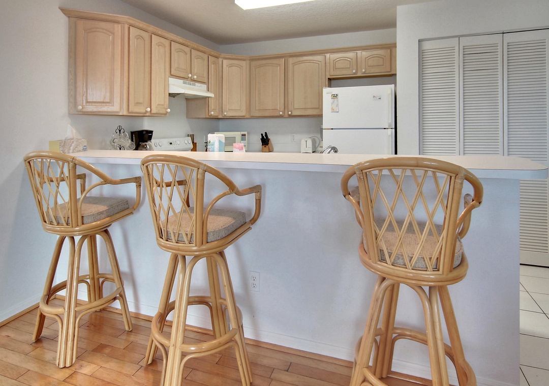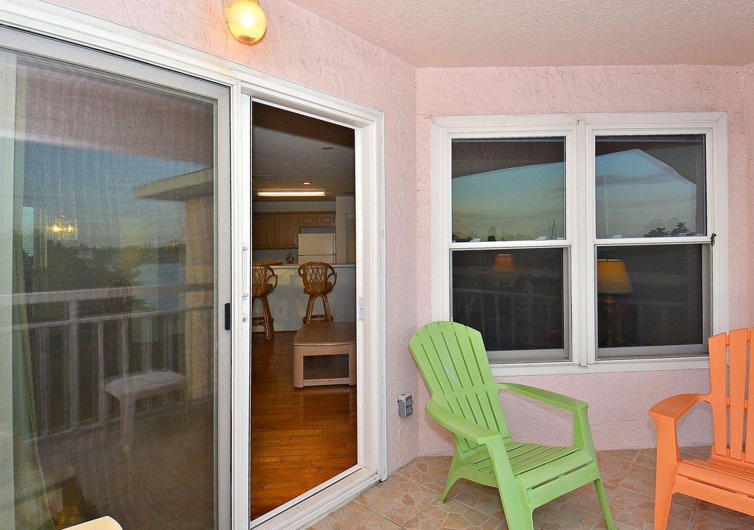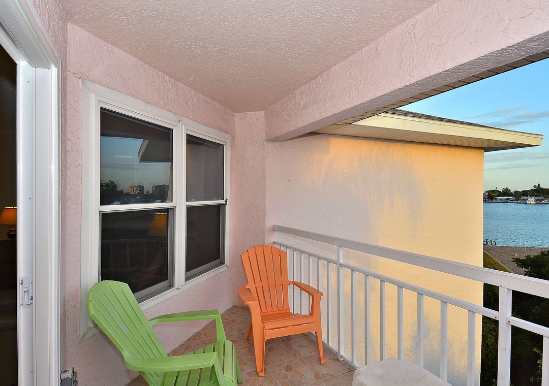 This upper floor, 2 bedroom/2 bath condo has a comfortable and traditional décor throughout. Fully stocked and equipped kitchen, open living room and dining area, hard wood and tile floors through the living areas with carpeting in the bedrooms and a private balcony with seating. A perfectly simple condo at a great value with a perfect location! PLEASE NOTE: The private balcony from this condo has an obstructed view of the water. There is no elevator at this property, only stairs for access.