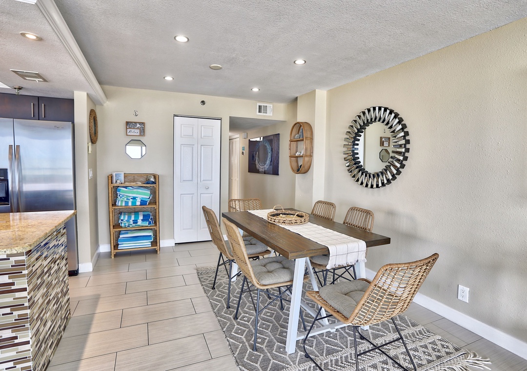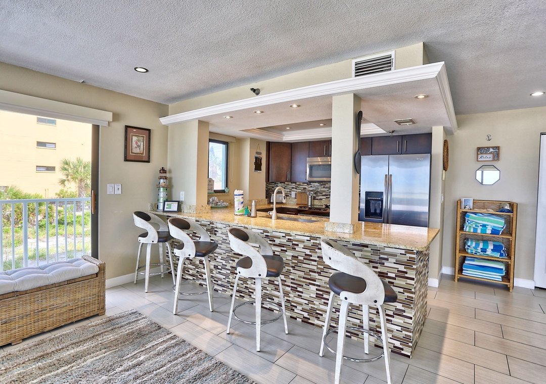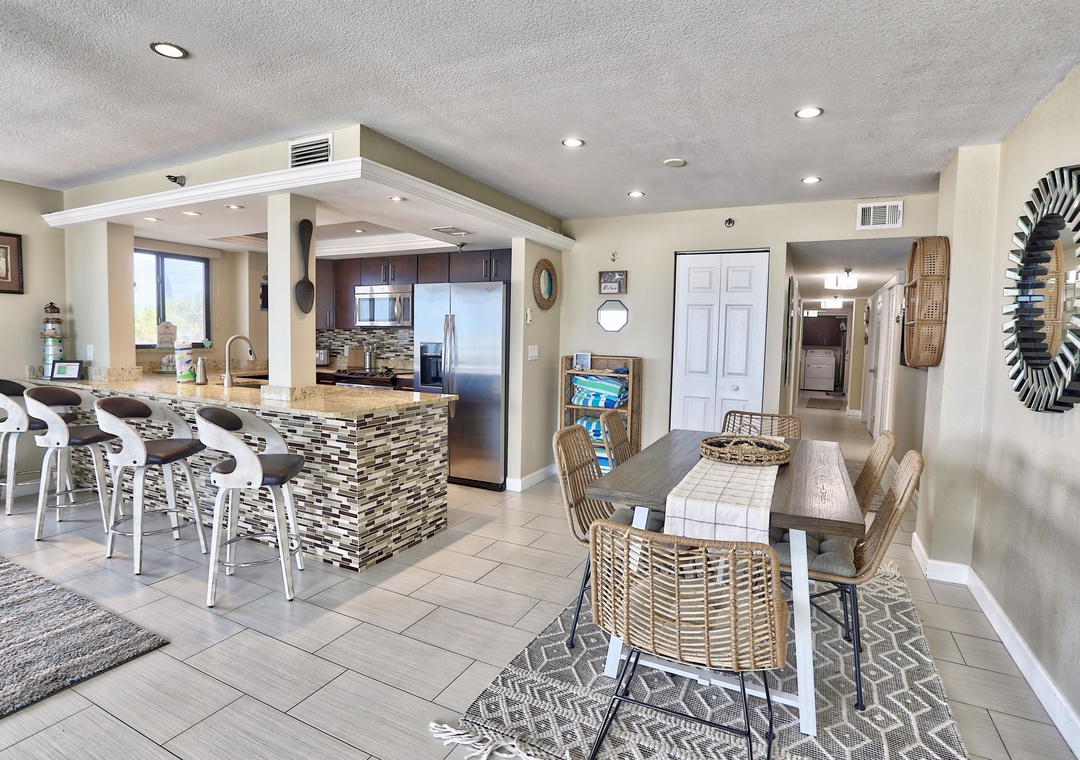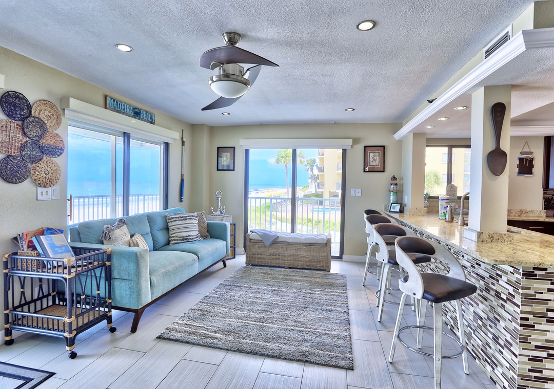 Welcome to Arena De Madeira! This exquisite 3-bedroom, 2-full bathroom condo offers breathtaking views of the Gulf of Mexico where you can watch an unforgettable sunset every night! The open-plan living and dining area is perfect for gatherings, with dining for 6 and extra counter seating with chic, comfy chairs. The beautiful kitchen is equipped with classy finishes and updated appliances. Fully stocked with dishes, utensils, cookware, and even a George Foreman grill, it’s ready for you to whip up delicious meals. An awesome modern amenity that you will enjoy is the convenience of a whole-home commercial-grade water filtration and purification system—no need for bottled drinking water!