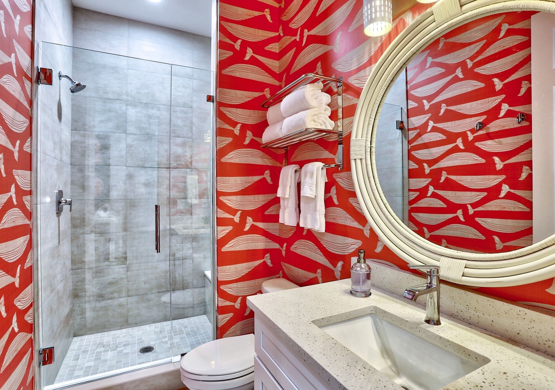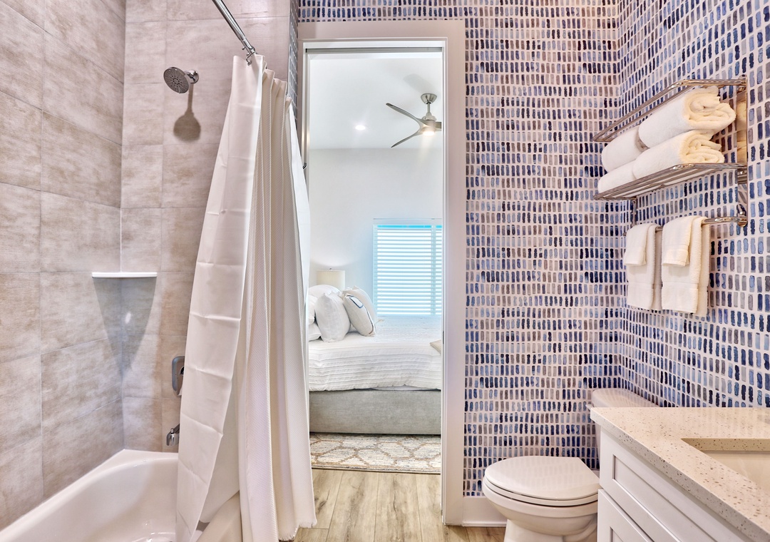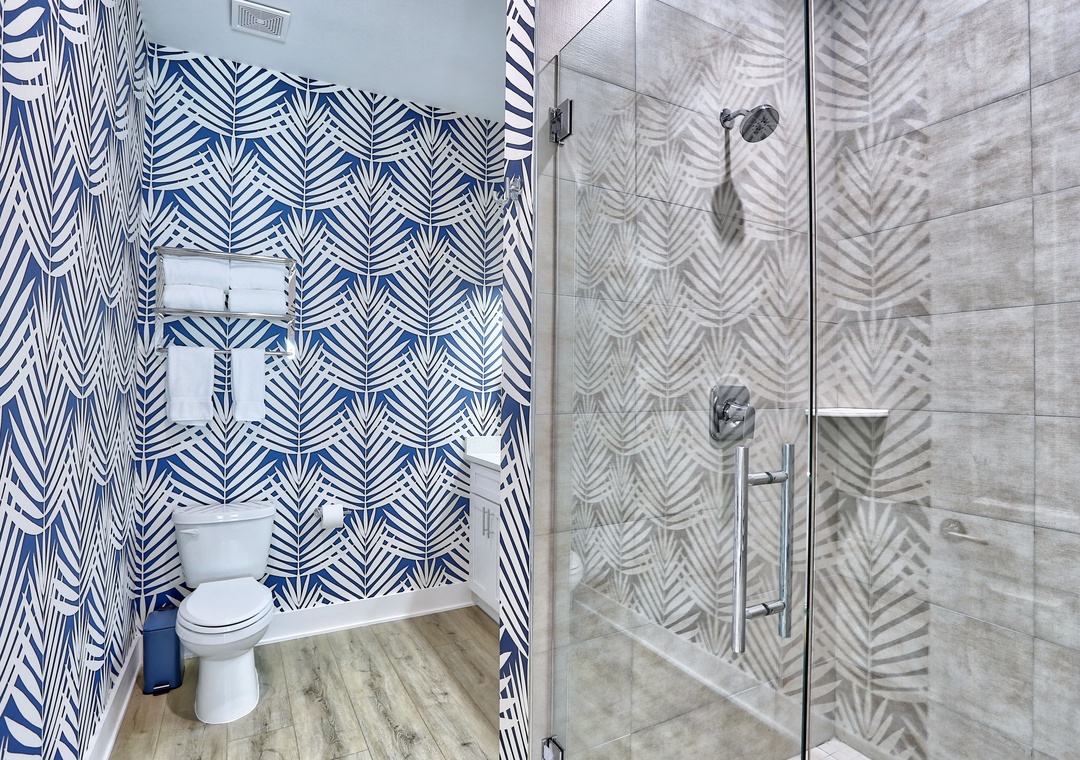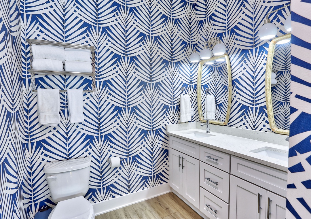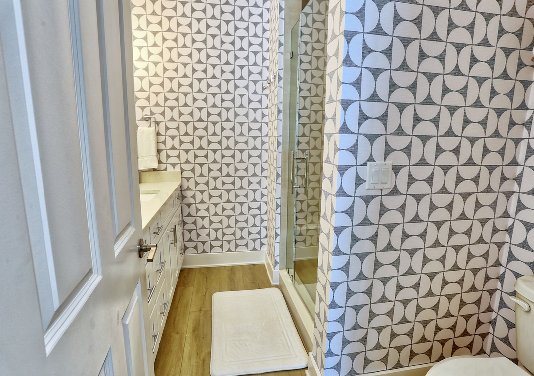 On the 2nd level, relax in the spacious living room with a large-screen TV, a cozy couch, and two chairs. Step out onto the private balcony with seating for outdoor dining. The gourmet kitchen boasts top-of-the-line upgrades and appliances, fully stocked with dishes, utensils and cookware; perfect for creating meals together. A large dining table and extra seating at the kitchen counter provide plenty of space for gathering and playing games with family and friends. This level also includes a bedroom with a King bed and TV, plus a full bathroom.