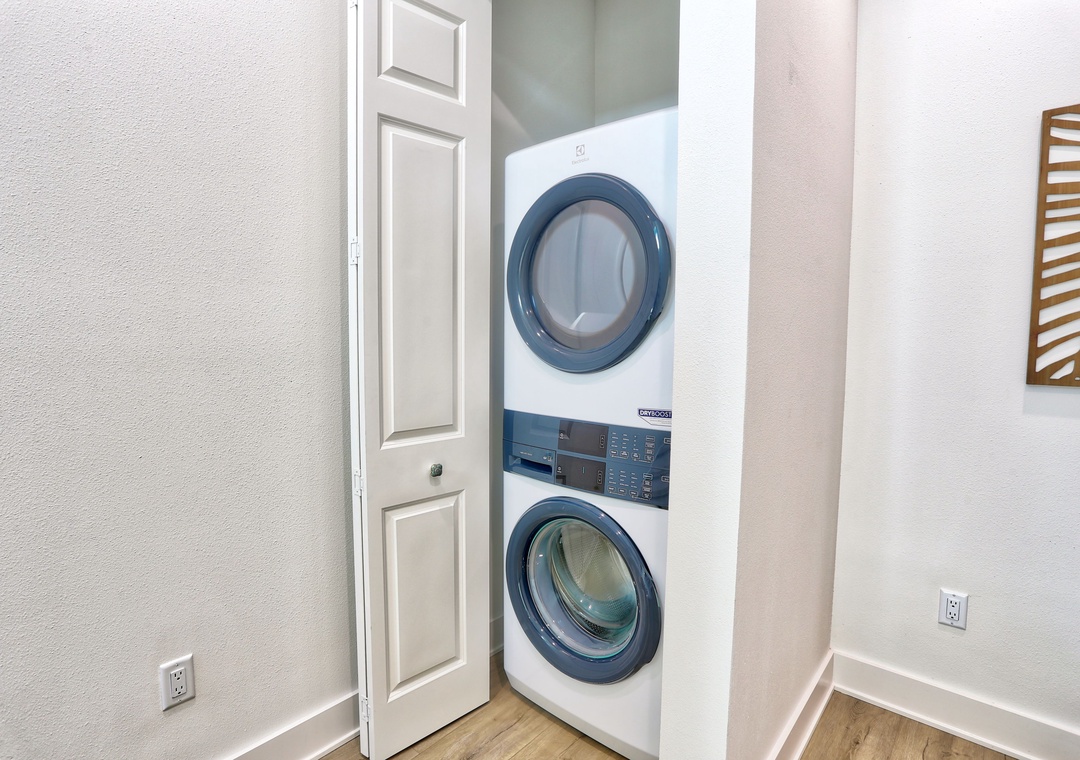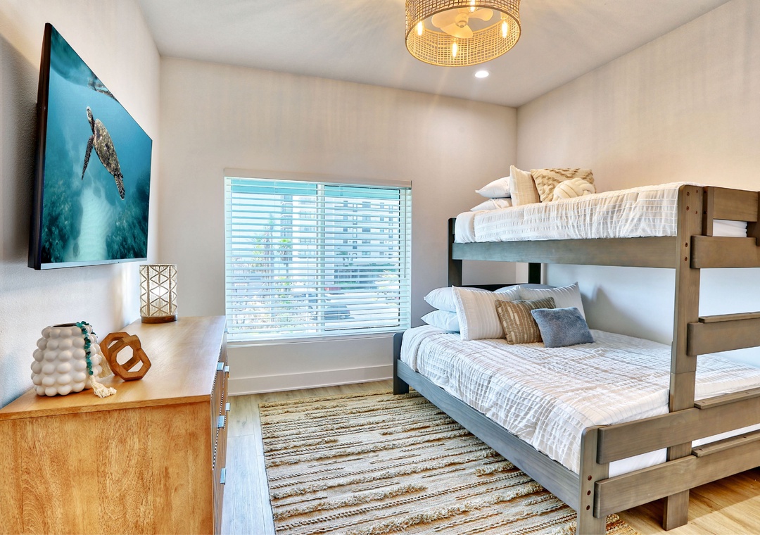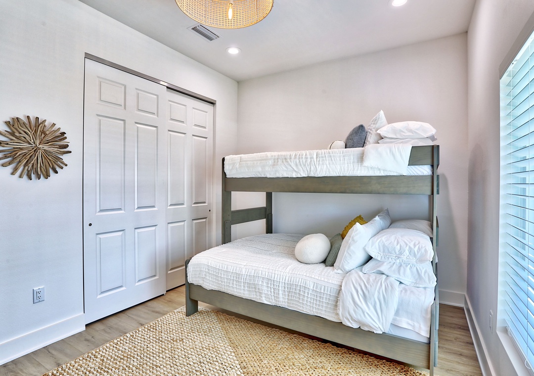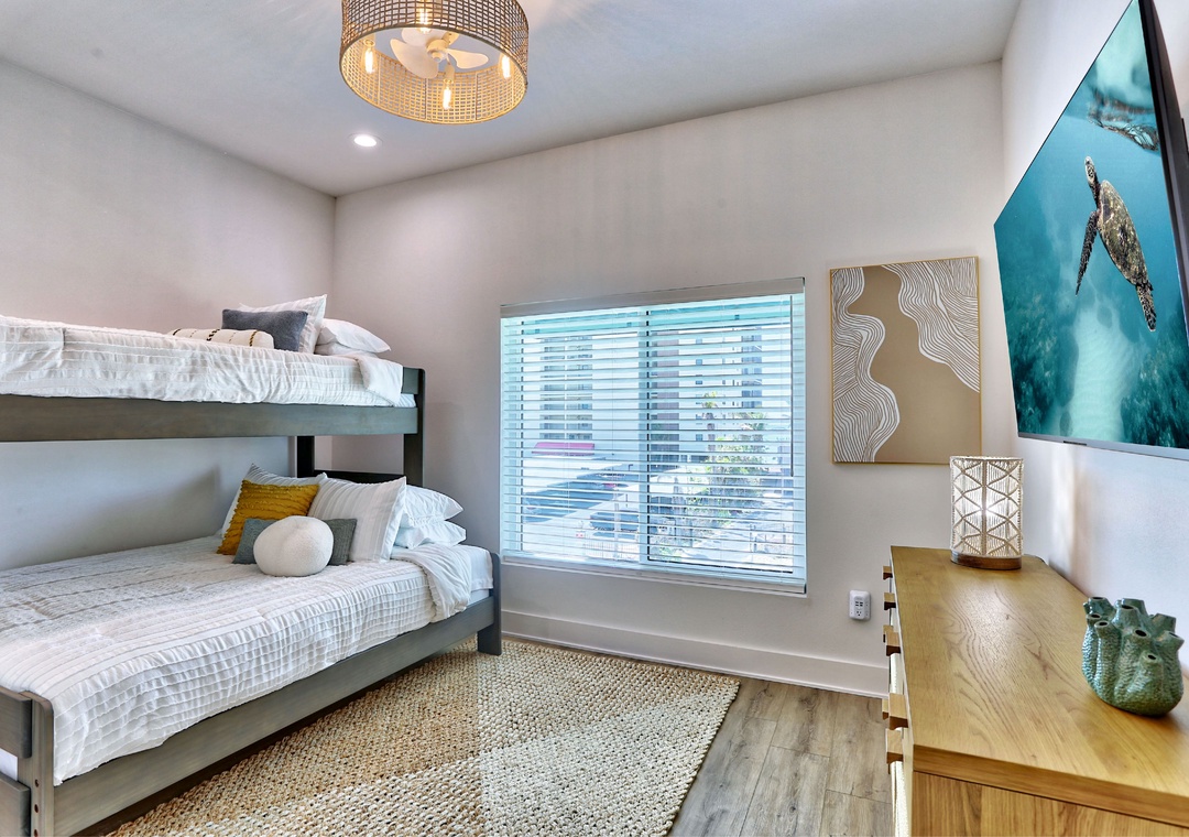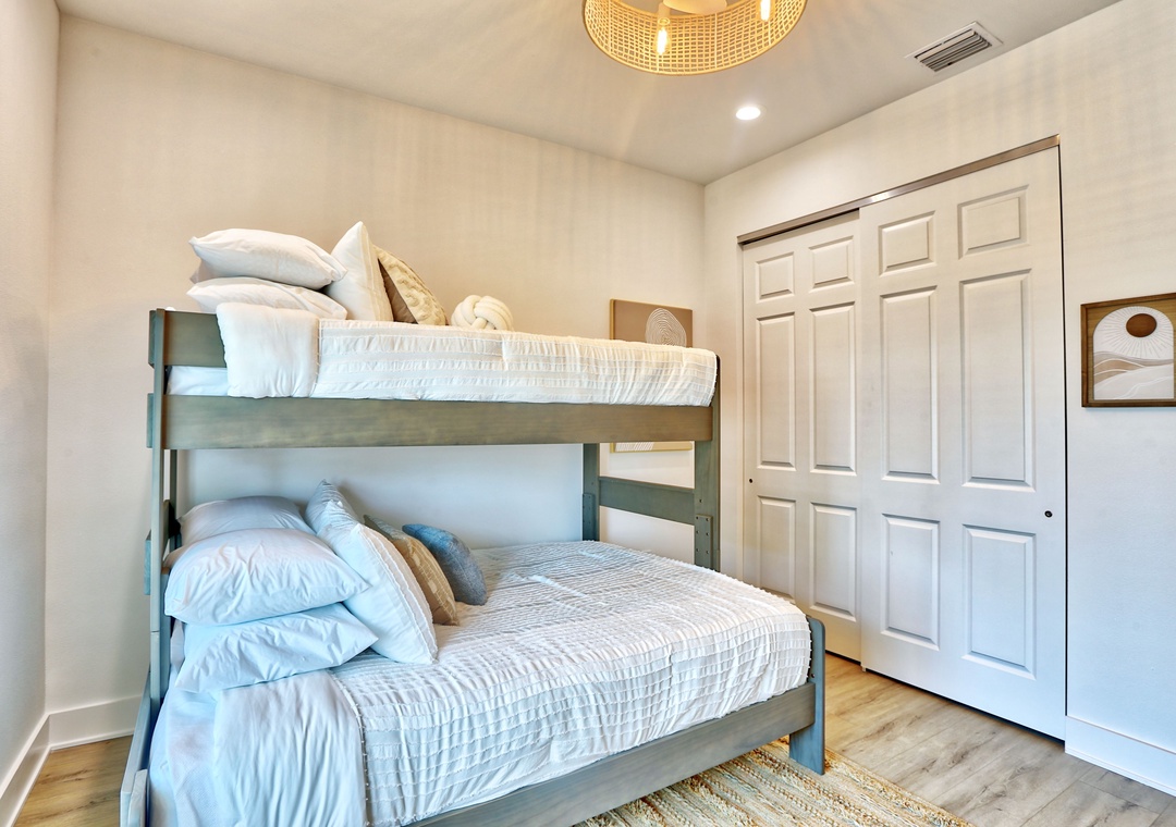 Head on up to the 3rd level where you will find three bedrooms and two full bathrooms. The Master Bedroom features a King bed, TV, and an attached bath. Two additional bedrooms each have XL twin over queen bunk beds and TVs, perfect for kids or friends. A washer/dryer is conveniently located on this floor.