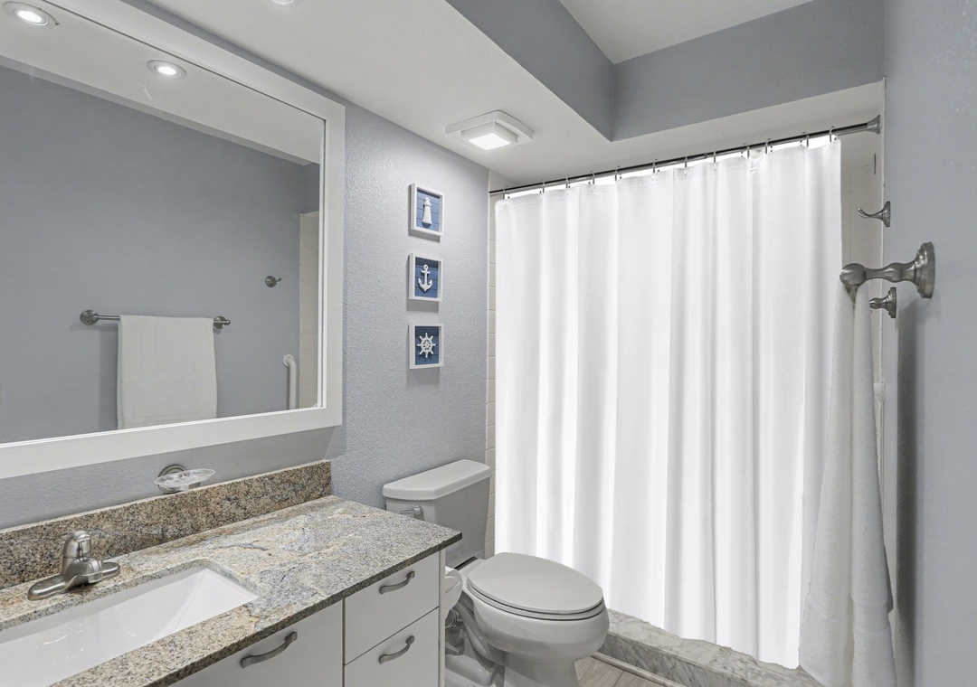 The master bedroom offers a king bed, TV, private attached bathroom, and balcony access, while the guest bedroom features a queen bed and TV. Both bathrooms are spacious and updated; you will find a large walk in shower in the master bathroom and a step in jetted tub in the guest bathroom. The condo includes comfortable bedding and an in-unit washer and dryer for added convenience, and you will have one assigned parking space, along with the security and amenities of this gated community.