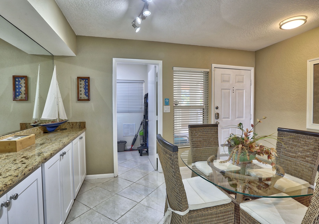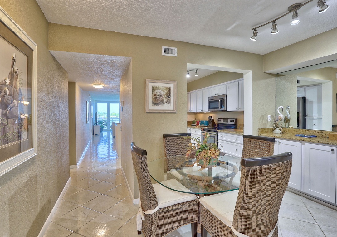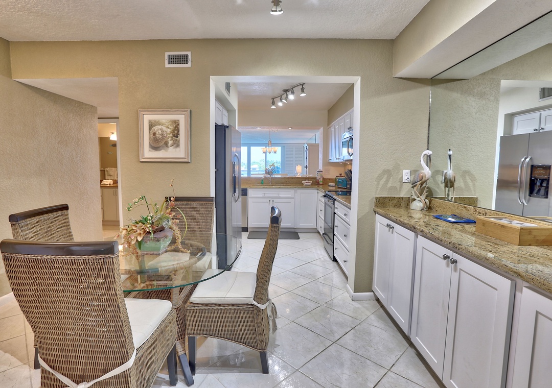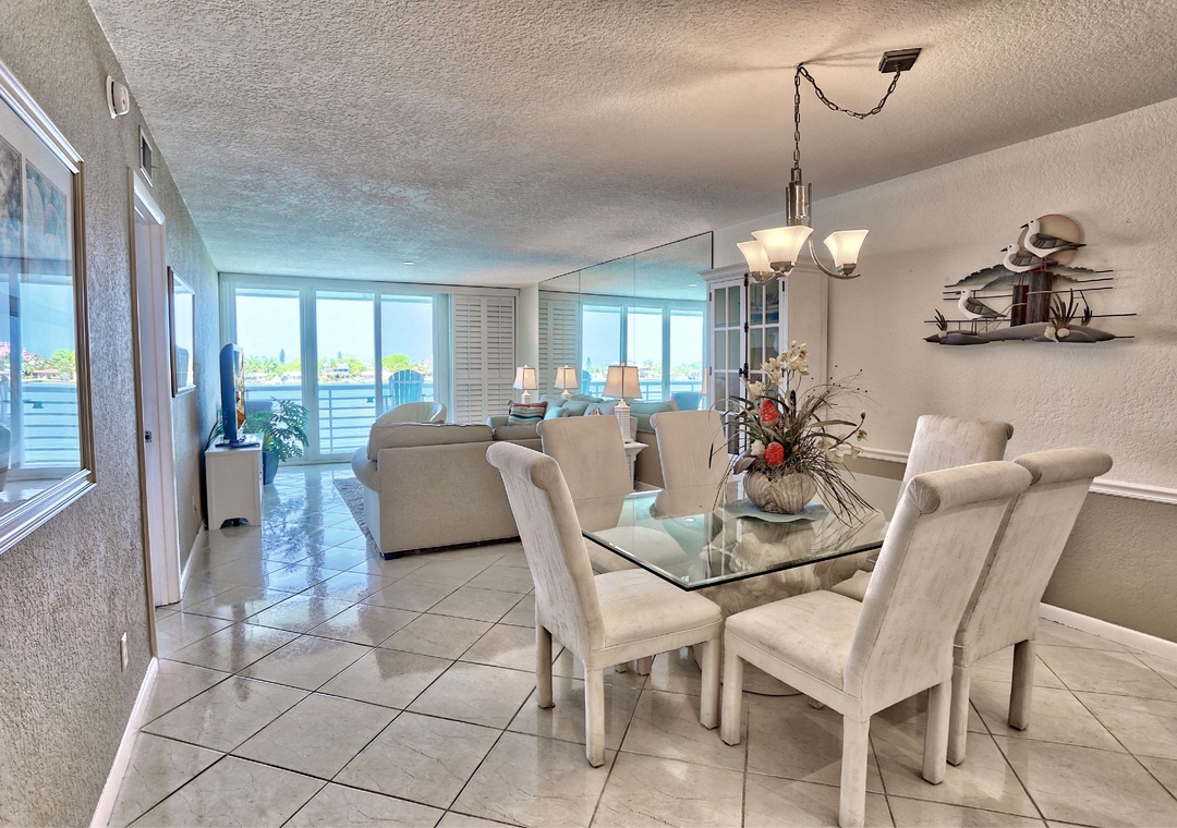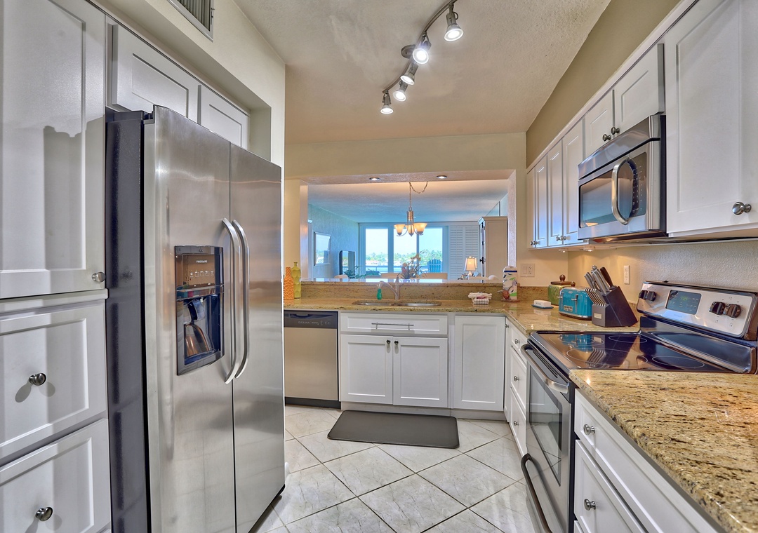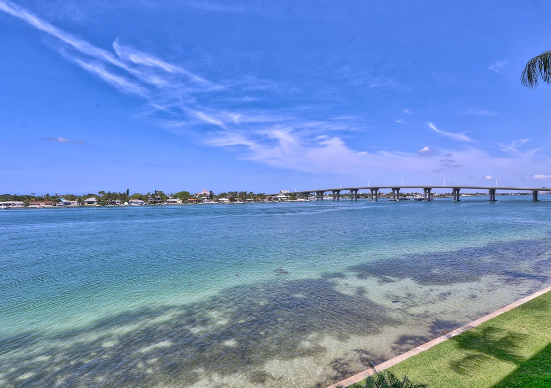 When you decide you don’t want to spend the energy shopping, you can relax on the patio and view beautiful sunsets or dramatic storms. Dolphins are an almost daily occurrence. Occasionally you may see a baby shark or manatee. In cooler weather, you can open the sliding glass door and be lulled to sleep by waves hitting the seawall. Standing in the kitchen you feel like you are on a yacht with full water view before you. During holidays or celebrations, you’ll have a close up view of boat parades or fireworks.