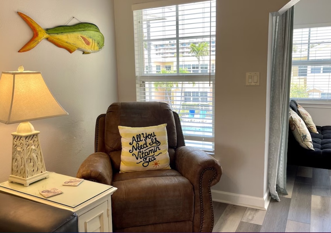 The property = easy to find, the condo is pretty, decorated well, great use of space, good storage, the shower is really nice... great water pressure. The bed is comfy, a little small for my giant man and I, but we slept like babies. There is a view of palm trees, the harbor and the pool from the bed. I sleep with a white noise app for my weird habits... but regardless, it was quiet when we were ready for bed. Everything you need to stay is here, I about fell over when I opened the cabinet under the sink in the bathroom... anything you forgot, they have it in the unit. All the beach gear in the closet was so handy to have... they even provided a drying rack for all your pool & beach wetness. There are outlets in the top of the bedside table drawers . My 11 year old daughter made the bistro nook her personal domain with the pullout couch and loved the curtains pulled for privacy... IT IS close quarters and hard to get your sexy on with the offspring present... but that's an us problem, not the condo's. Owners were so very friendly, accessible and quick to reply with any questions on the area or concerns, but not the least bit intrusive. We drove 20.5 hours and got in really late on our arrival date so I Door Dashed Bonefish Grill while we were getting settled and showering off... order was perfect, delicious (the crab cakes made me want to weep with delight) and delivery was easy. We found a Planet Fitness 8 minutes away and the grocery was close. I was going to order grocery delivery, but the hubs is picky and drove there himself. Everyone has been delightful. The area, it's quieter than I was expecting... not a lot to walk to other than the beach (that was beautiful...and the water was insanely clear), Indian Shores Coffee (highly recommended) & Salt Rock Grille (I had the bacon wrapped scallop pasta and the beet and goat cheese salad... both were amazing!)... we did not use the trolley, but it looked adorable. We had a car and definitely needed it. I am used to Ft. Myers and Clearwater Beach, which is mostly walkable... this was our first time to the area and the hubs is obsessed. If I HAD to list a complaint... one of the kitchen utensil drawers doesn't open with the oven door closed, so you have to open the oven to get the ice cream scooper out...and sometimes when I walk around all day barefoot... my feet get a little sandy. 🤣 We literally have no complaints, thank you for a successful 2023 Spring Break! See you again soon! 😘- Reviewed On: 3/24/2023