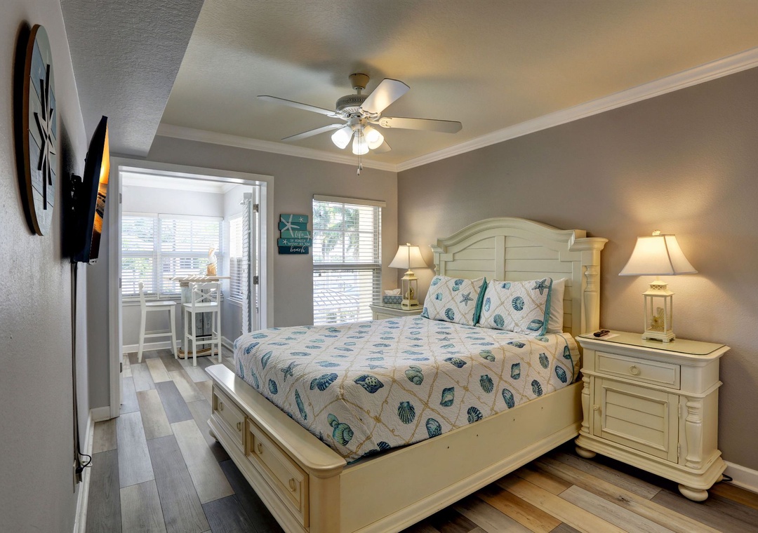 Welcome to Barefoot On The Shores I, a newly renovated coastal retreat at Barefoot Beach Resort. This one-bedroom, one-bathroom getaway boasts a fresh decor with beach-inspired accents. The open living area includes a dining table, sleeper sofa, a recliner, and a flat-screen TV. The smaller area of the living room has another couch and high top table, a great reading nook area! The master bedroom offers a queen bed with luxurious linens, along with a dresser, closet, and wall-mounted TV. The bathroom features a modern walk-in shower and updated vanity. Experience the charm and convenience of Barefoot On The Shores I for your next vacation.