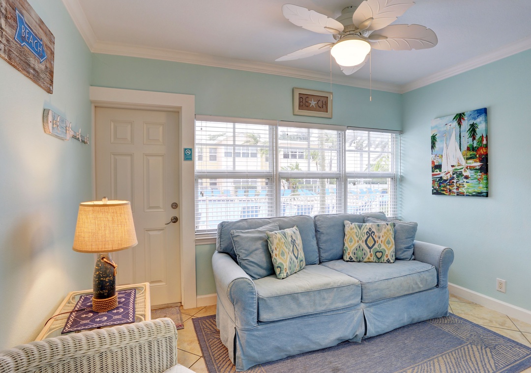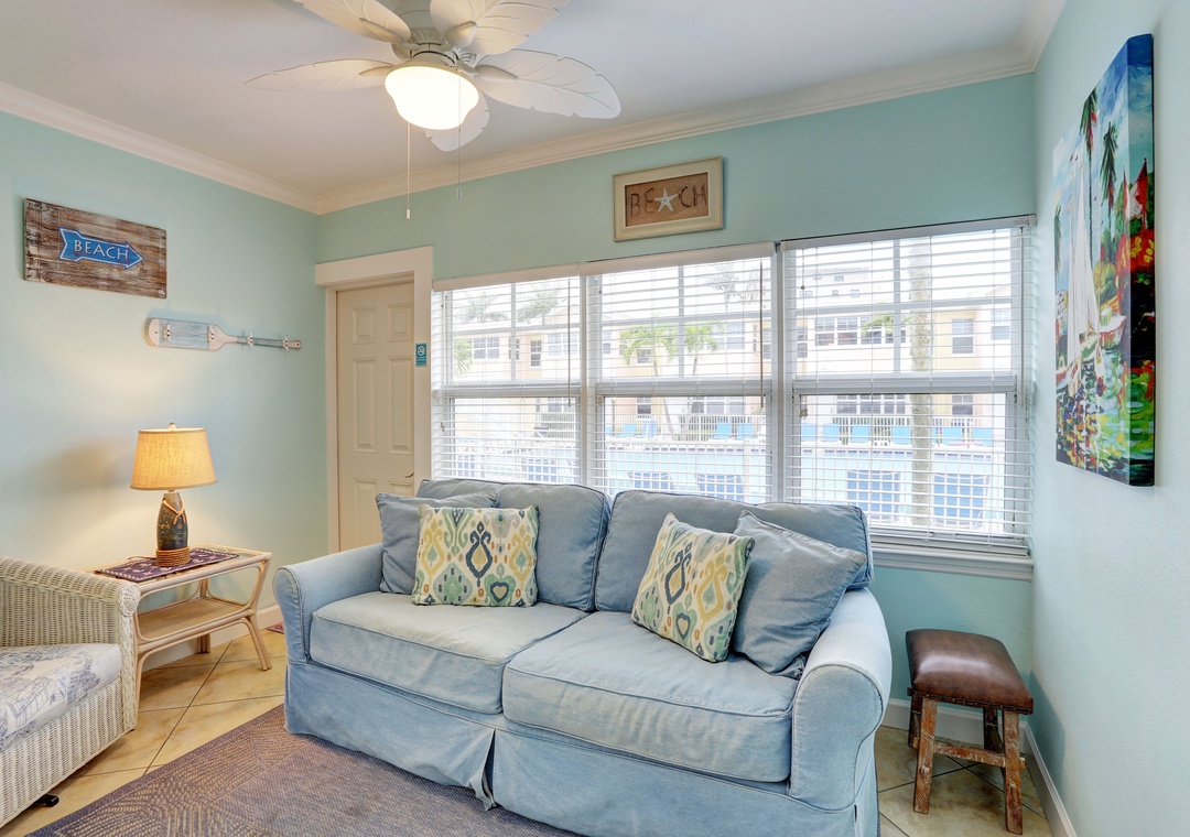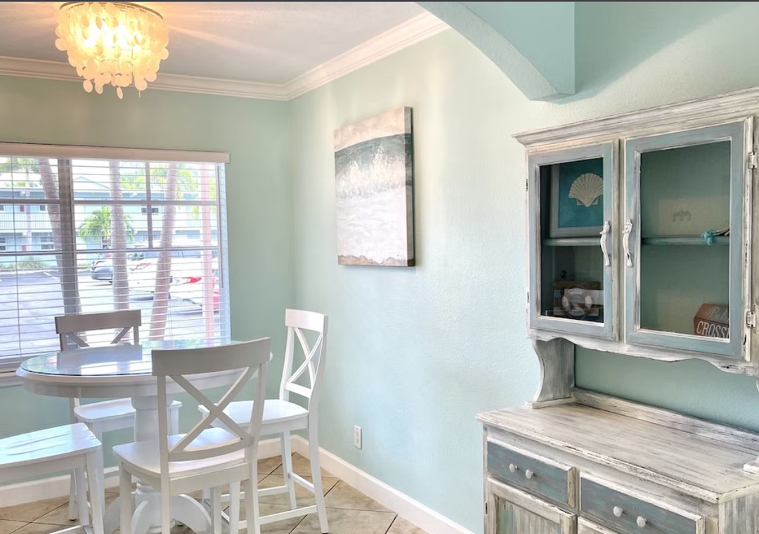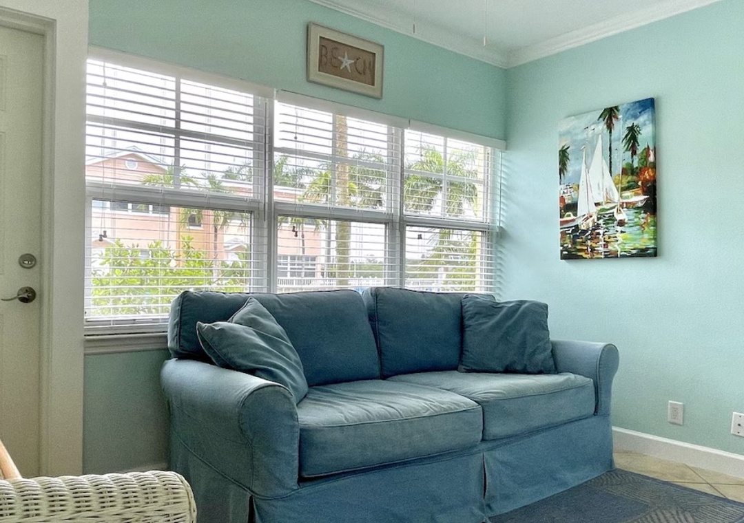 My husband, son and I were in Indian Shores to visit a friend who had recently been hospitalized. We rented this unit in Indian Shores to be close to their home in Seminole, and I'm so glad we did. This unit is beautifully decorated & immaculately cleaned! It has soothing beach colors and decor and includes amenities galore. There were beach chairs & fishing rods in the closet, and beach towels provided in the bathroom nook. My 6'2" son slept on the sofa bed in the sunroom overlooking the pool and he said the bed was comfortable. There was also a back door that allowed direct access to the pool. The unit is in the building closest to the dock & intercoastal waterway. It is a very easy and quick stroll across the street to the beach. The location of the complex was a short very convenient to restaurants, shopping and grocery stores nearby. Holly was very kind, helpful and responsive to my many questions. We will definitely stay here again on our next trip to Indian Shores!- Reviewed On: 5/25/2023