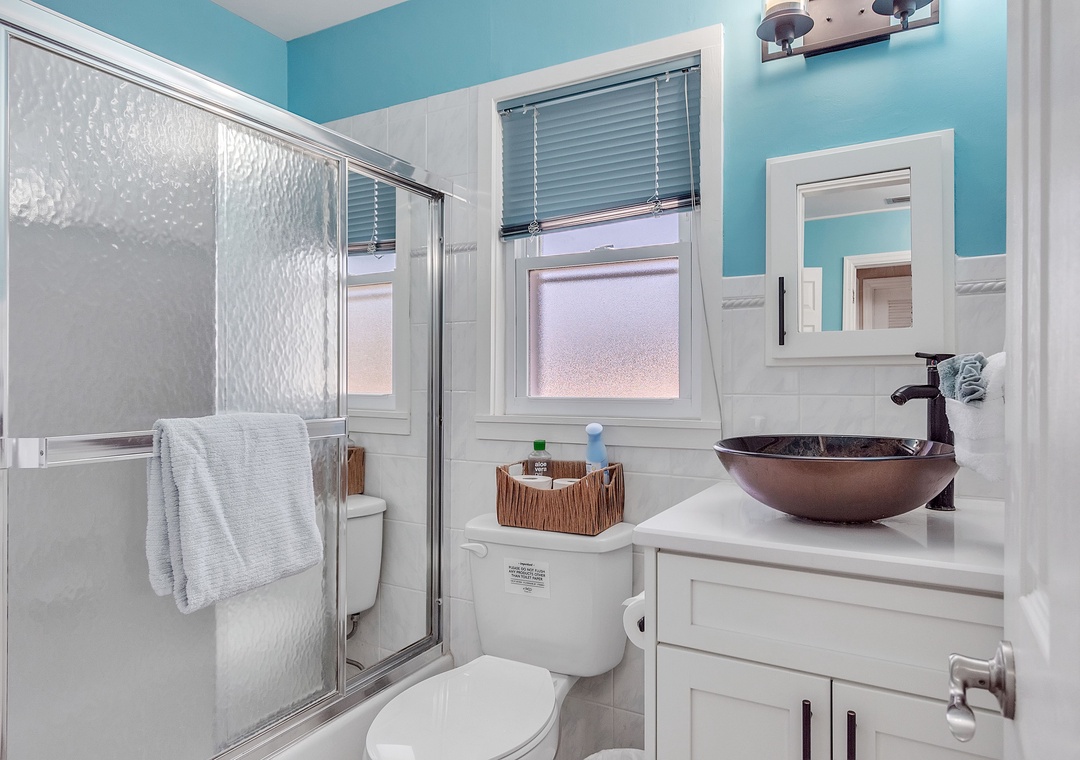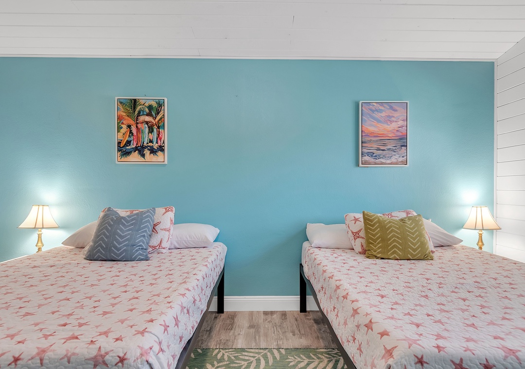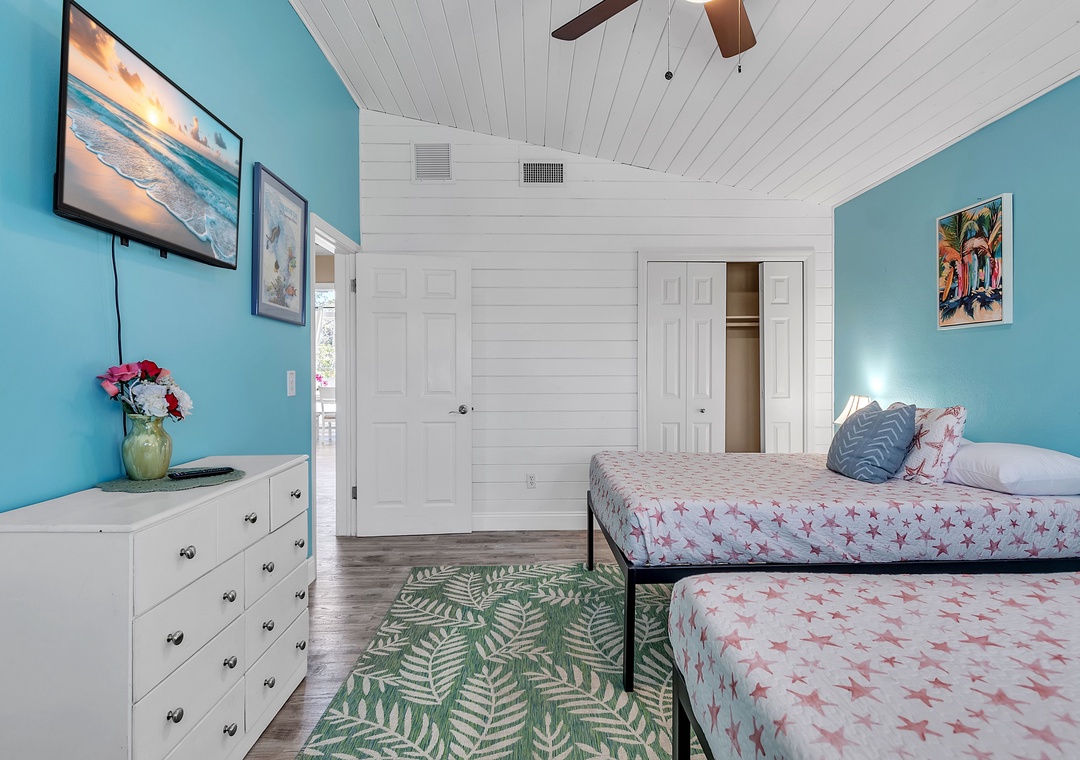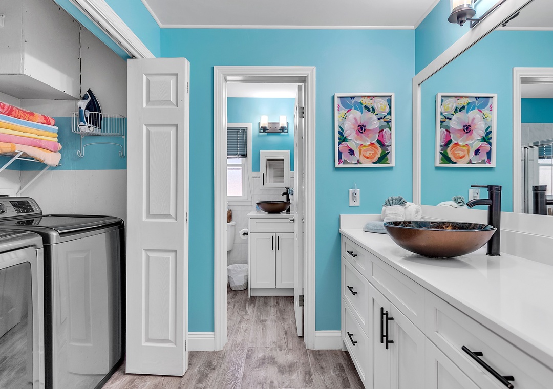 The master bedroom is a spacious retreat, featuring a king-size bed, TV, and an attached updated bathroom and plenty of closet space. The second bedroom, located off of the living room area, includes a double bed and desk space, while the third bedroom offers two double beds and a TV. Both guest bedrooms share a bright, modern bathroom down the hallway. A washer and dryer are also available for your use, ensuring a comfortable and stress-free stay.