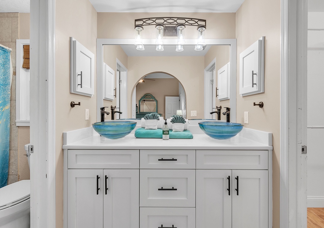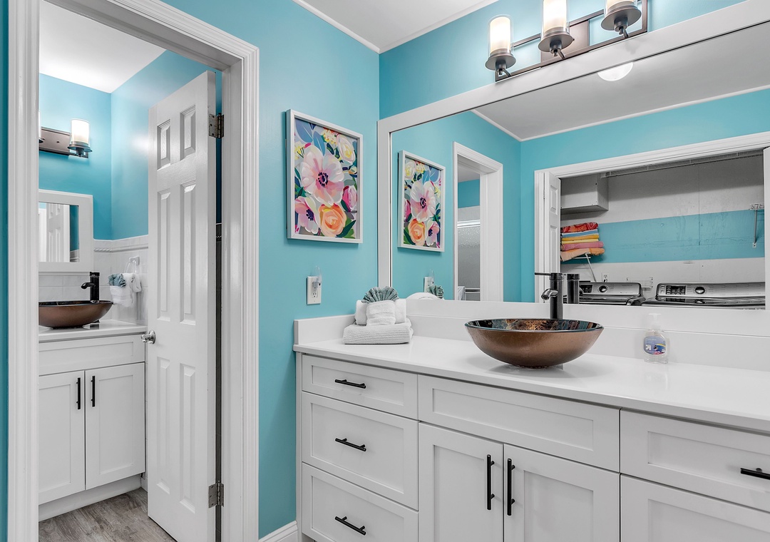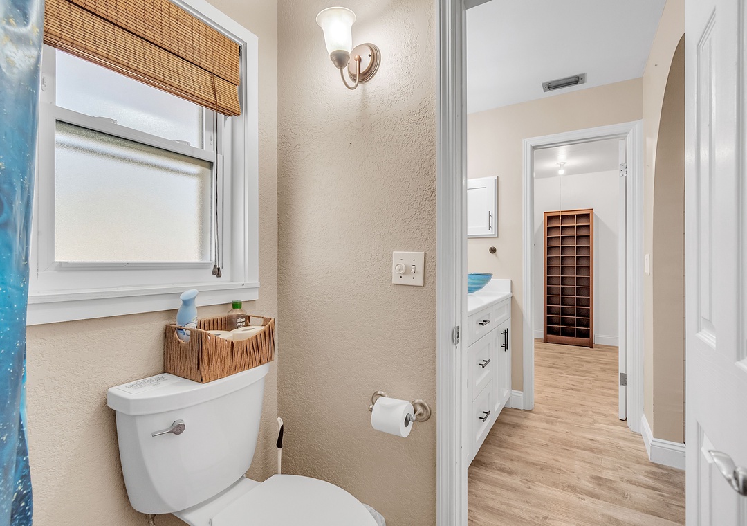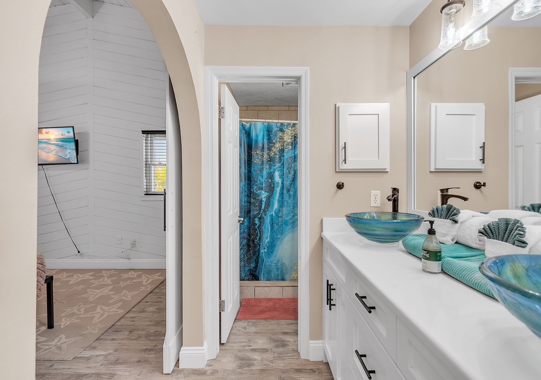 The master bedroom is a spacious retreat, featuring a king-size bed, TV, and an attached updated bathroom and plenty of closet space. The second bedroom, located off of the living room area, includes a double bed and desk space, while the third bedroom offers two double beds and a TV. Both guest bedrooms share a bright, modern bathroom down the hallway. A washer and dryer are also available for your use, ensuring a comfortable and stress-free stay.