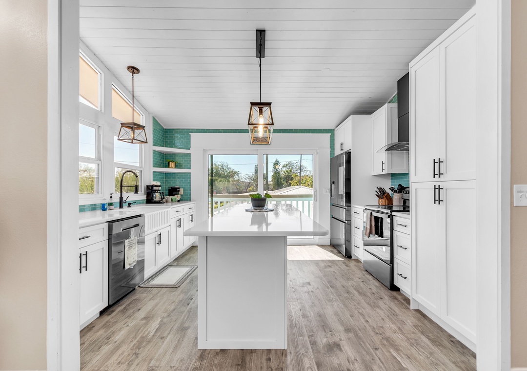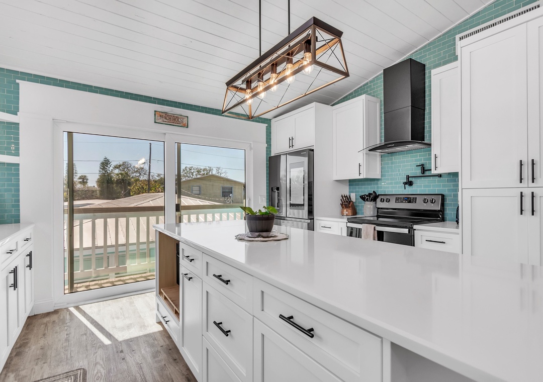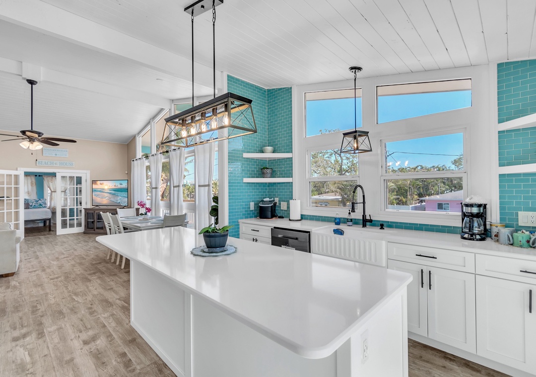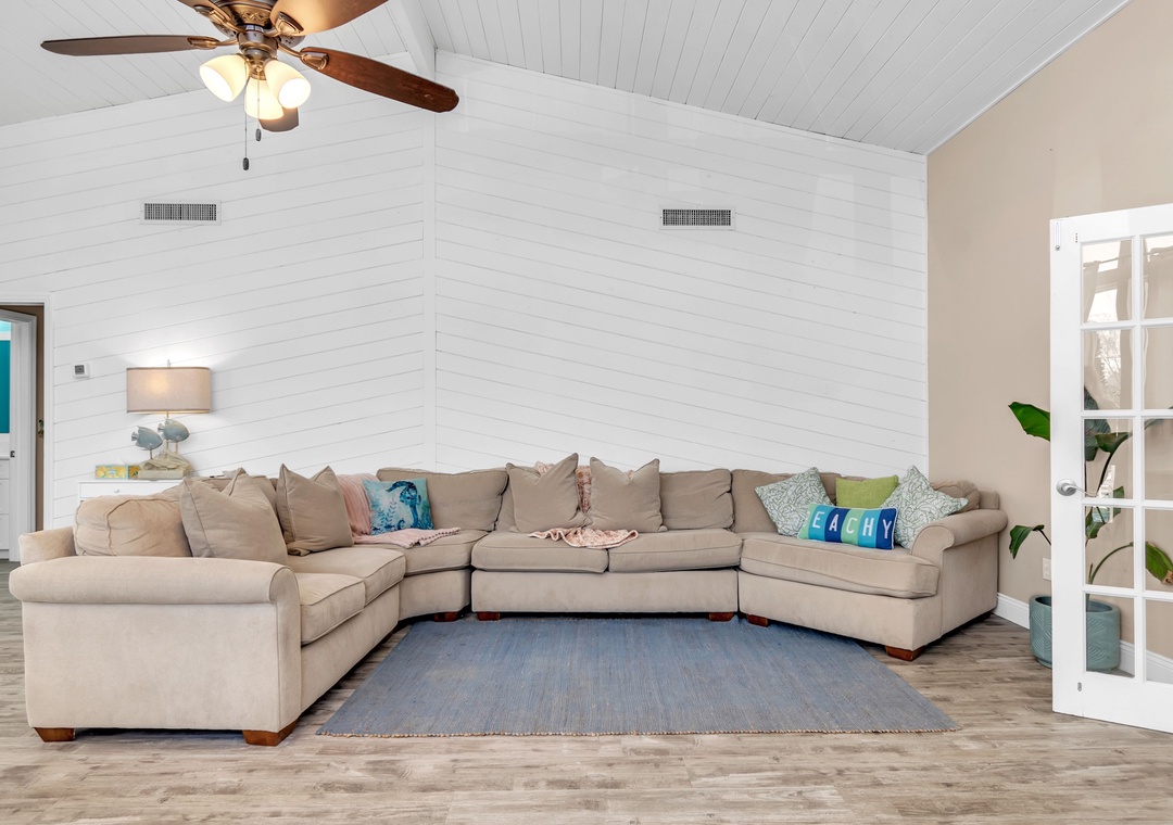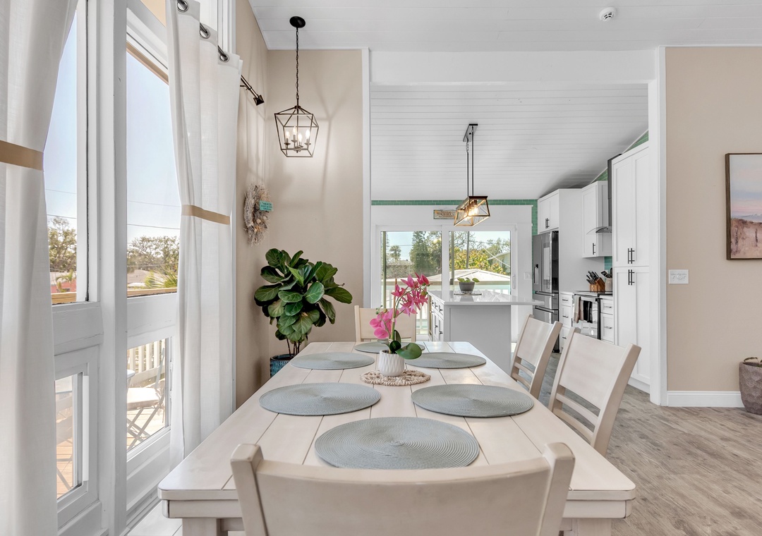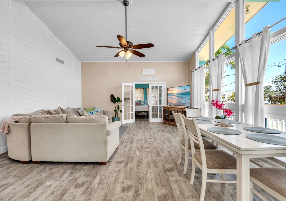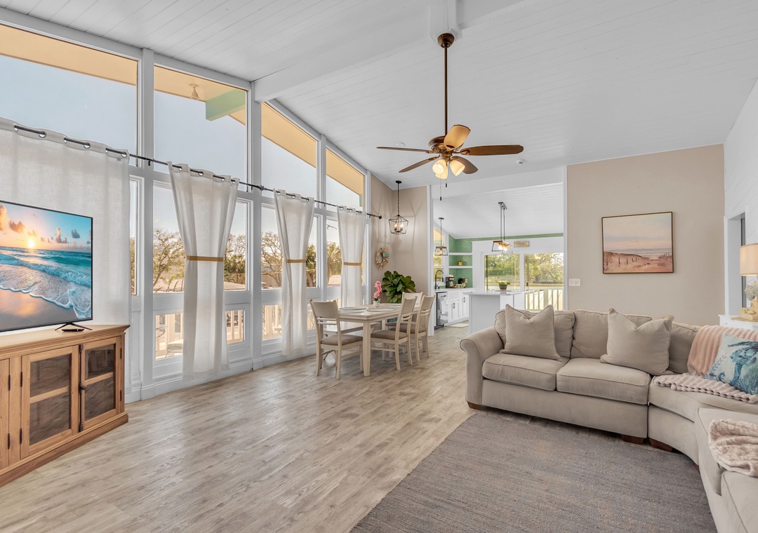 The open and airy interior features beautiful updates throughout, including lots of windows that let in natural light. The living room boasts a large, cozy couch and a big screen TV, while the adjacent dining area has a large table with seating for everyone.