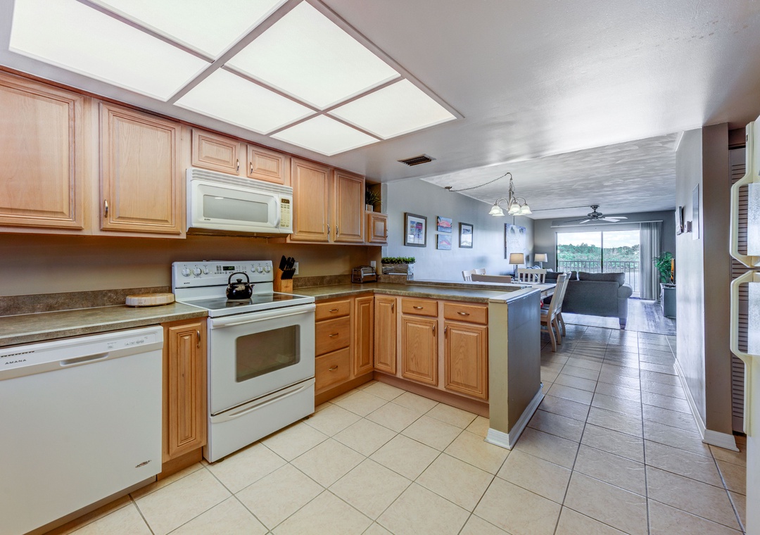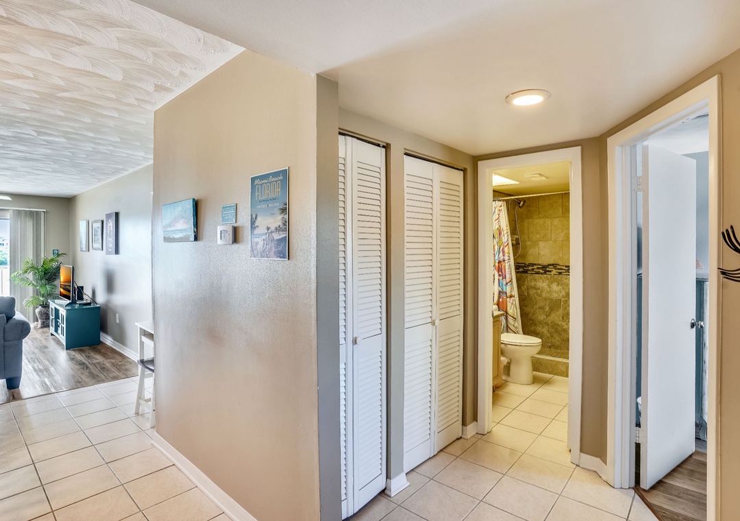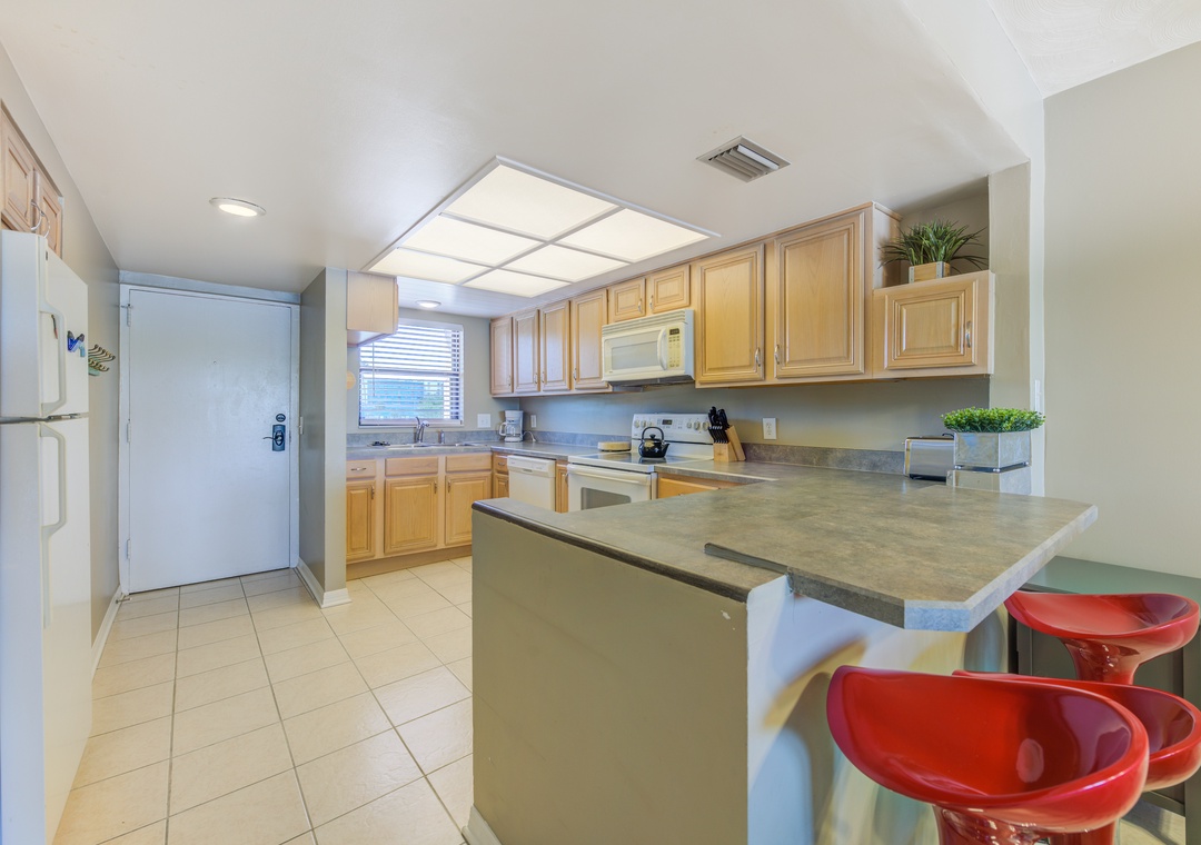 In the living room, a sleeper sofa provides additional sleeping space and a place to sit back and relax as you watch your favorite shows on the flat screen TV. From the living room, step out onto the private balcony that overlooks the intracoastal waterway to dine outside or simply relax and sip on a drink! In the kitchen, a bar height counter offers space for 3 barstools to sit in while you enjoy fresh cooked meals. The spacious open layout will allow your group cook to stay included in conversation while preparing the feast of the day in the fully stocked kitchen. In the main bedroom, there is a cozy king bed to rest in after days of sun and sand as well as access to the balcony! Attached to this bedroom, the main bathroom offers a walk-in shower. Down the hall, the 2nd bedroom has two twin beds and access to the 2nd bathroom that includes a shower/tub combo.