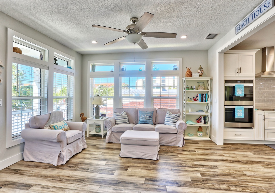 Step inside to a spacious, open living area with plenty of seating — perfect for gathering after a day at the beach. The open kitchen boasts a large island with bar stool seating, top-of-the-line appliances including wine fridge and double oven, and is fully stocked with dishes, utensils, and cookware so you can prepare delicious meals at home. A dining table for six provides extra space for enjoying dinners or playing board games with your family. The home offers two private balconies — one off the living room in the front of the house and another off the back of the house for a quieter retreat.
