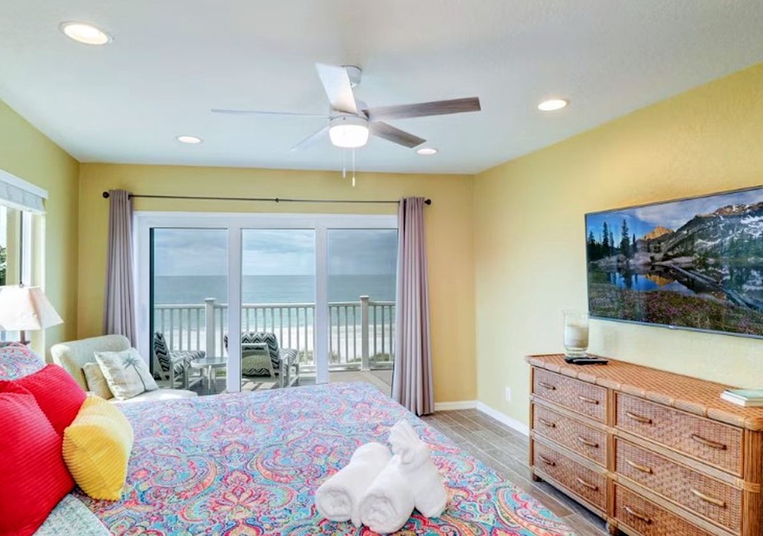 The master suite features a king bed, balcony access, a 59” flatscreen TV. The en suite features a walk-in shower with fine tilework. The second bedroom includes a king bed, 51” flatscreen TV, and balcony access as well. The third bedroom is detailed with a queen bunk bed, as well as a TV with a DVD player and Xbox. The guest bathroom is appointed with a sparkling tub/shower combination, while a half bath off the living room provides more space to refresh. This incredible Gulf-front townhome is conveniently close to Treasure Island’s shops and restaurants as well as several local marinas