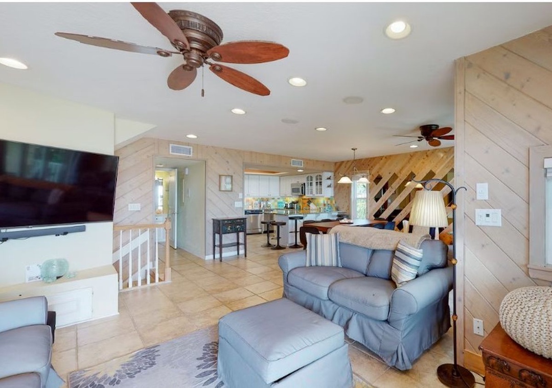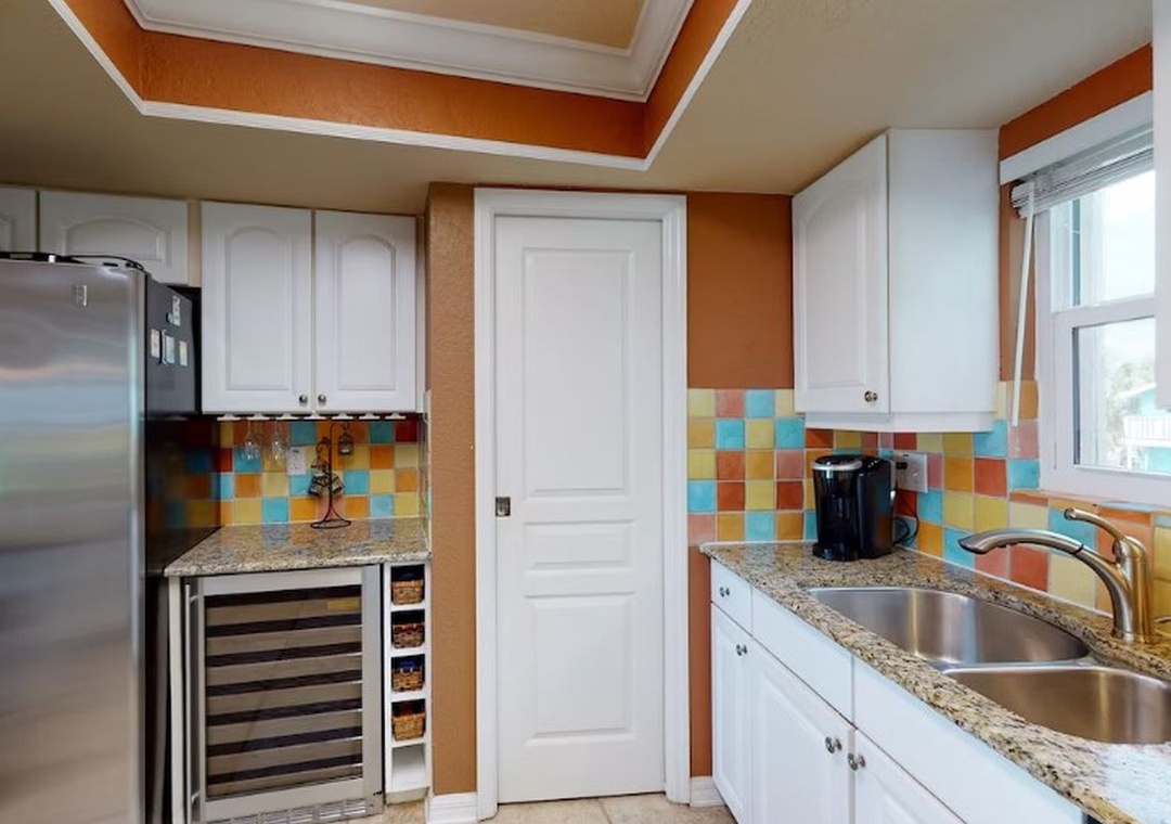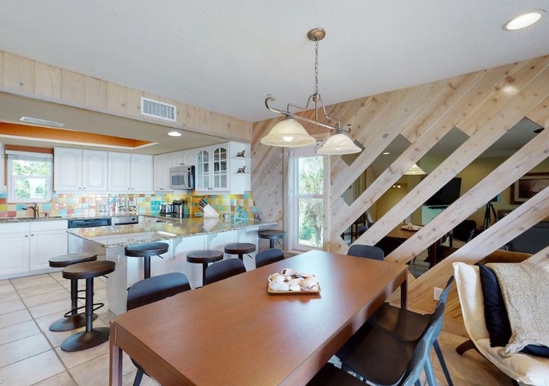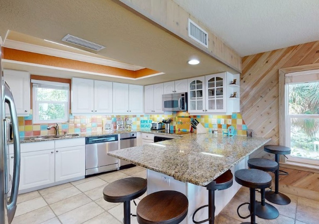 This beautiful two-story townhome features 3 bedrooms, 2.5 bathrooms and sleeps up to 8 guests comfortably. Natural light fills the open-concept living room, a window-lined space with gorgeous Gulf views. Relax on a sofa and comfy armchairs while your favorite shows stream on a 65” smart TV. The kitchen includes granite countertops that compliment a colorful tile backsplash, stainless steel appliances, and a wine fridge. Three can keep the chef company at the breakfast bar that seats 6. When it’s time to eat, gather at a dining table for eight.