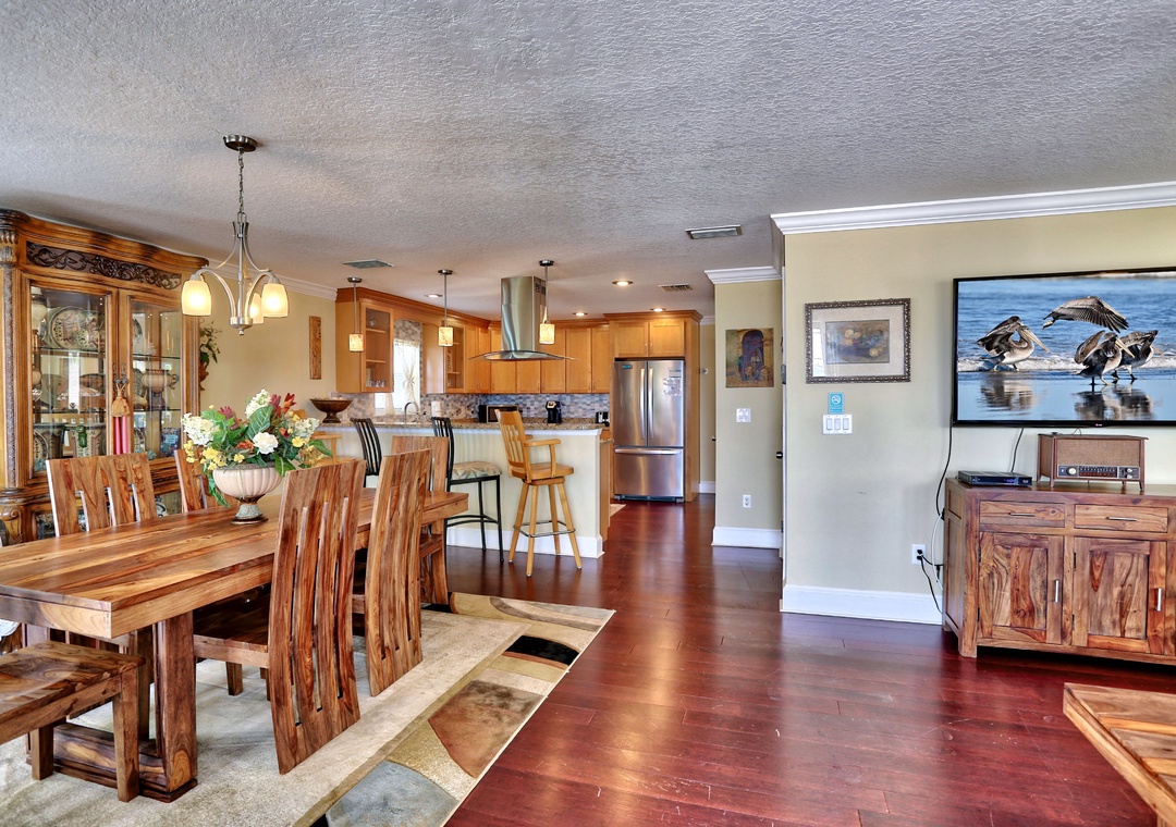 The second floor is the heart of the home, featuring an oversized couch perfect for lounging while watching your favorite shows on the large screen TV. The open-concept kitchen and dining area boasts sleek stainless steel appliances and is fully stocked with all the cookware, dishes, and utensils you’ll need to create delicious meals during your stay. Gather around the expansive dining table or pull up a seat at the kitchen counter — ideal for shared meals, lively conversations, or game nights. Step outside onto the spacious open deck off the second floor, furnished with table and chairs to enjoy your morning coffee or evening cocktails.