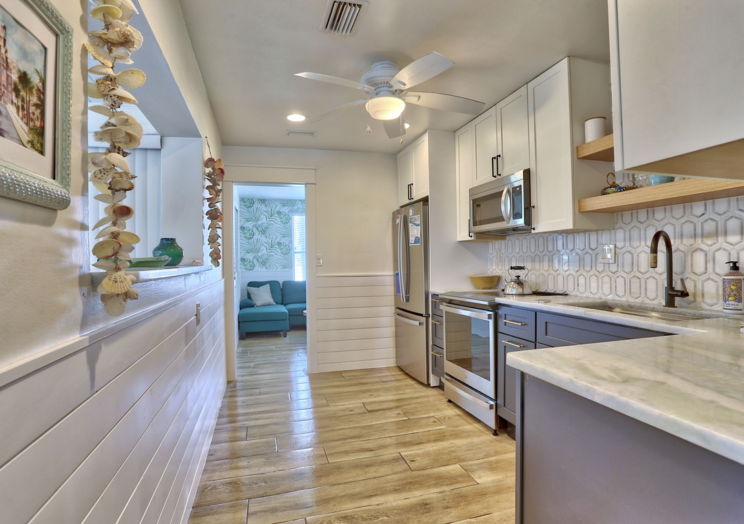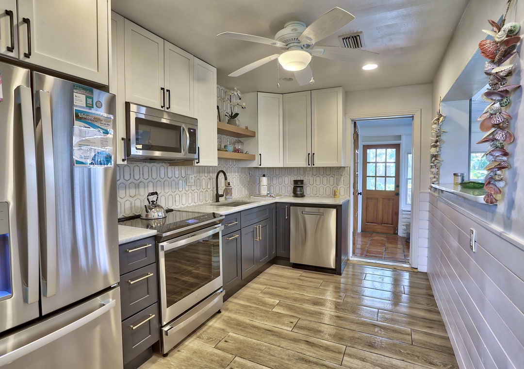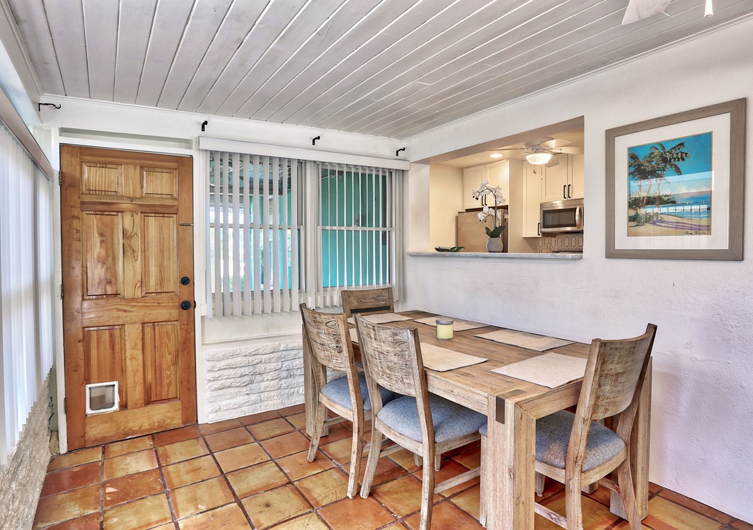 Inside, you'll find a tropical decor that complements the laid-back area atmosphere. The beautiful kitchen is fully equipped with stainless steel appliances, dishes, cookware, and utensils. Cook to your heart's content and then gather around the dining table that will comfortably seat everyone.