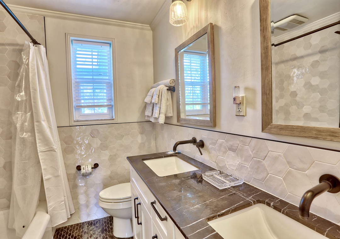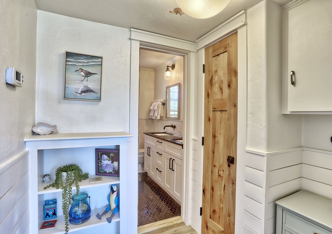 The master bedroom features a king bed and a TV, while the guest bedroom is perfect for families, having a queen bed and an additional twin bed. The updated bathroom boasts a double sink for added convenience. And, for your laundry needs, a washer and dryer are available.