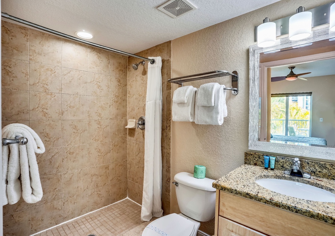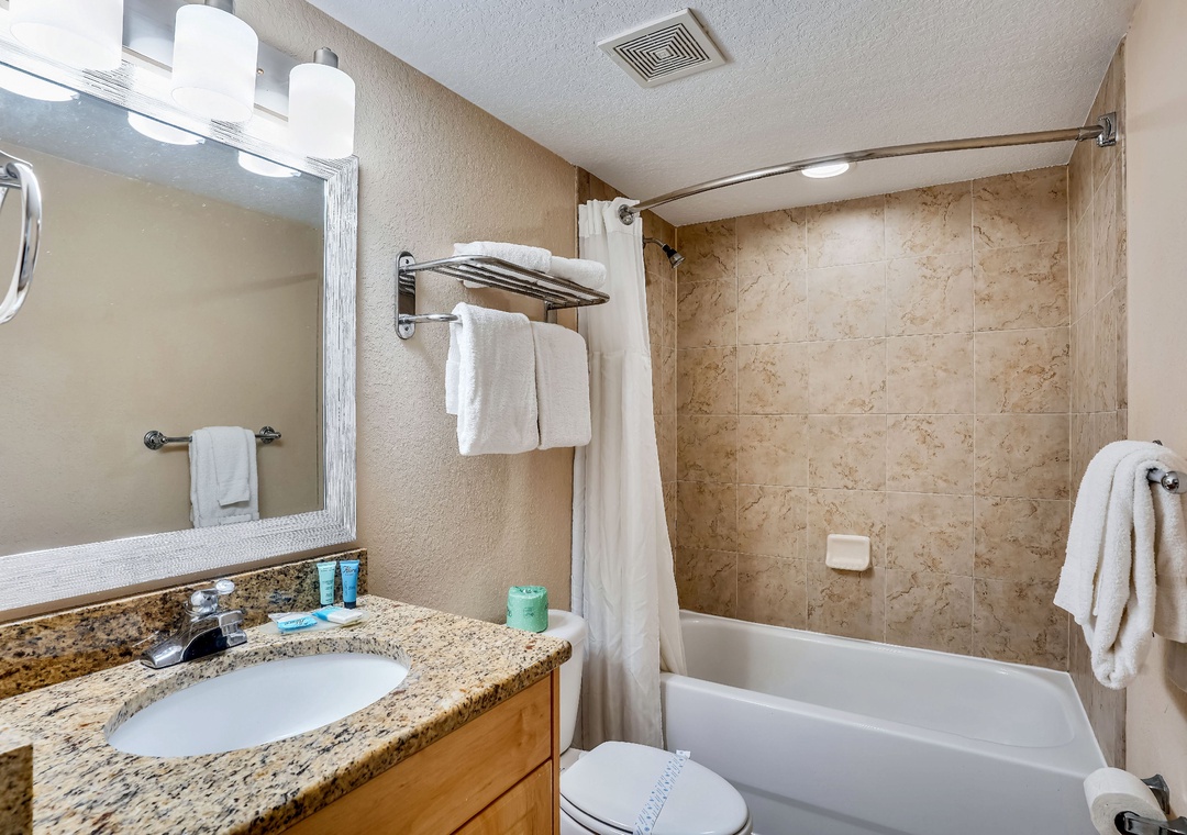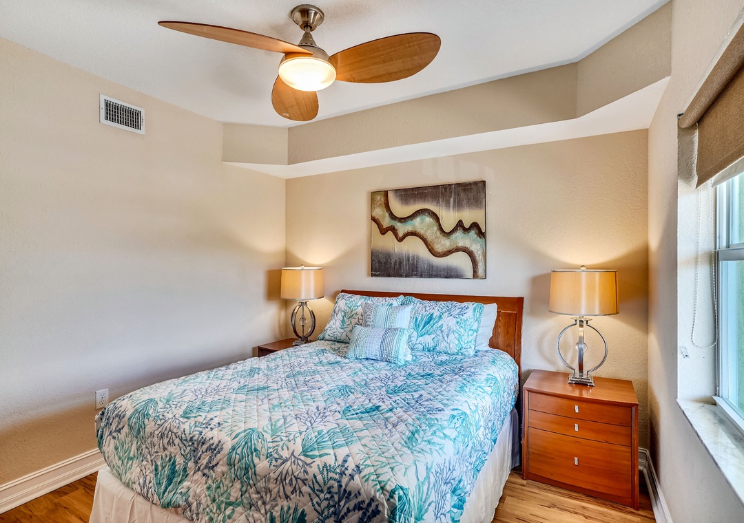 When you are ready to retire after a long day of adventure, the main bedroom features a king bed. Connected, the main bath is equipped with a large tiled shower. The guest bedroom features one queen bed and has access to the second bathroom which includes a tub/shower combo.