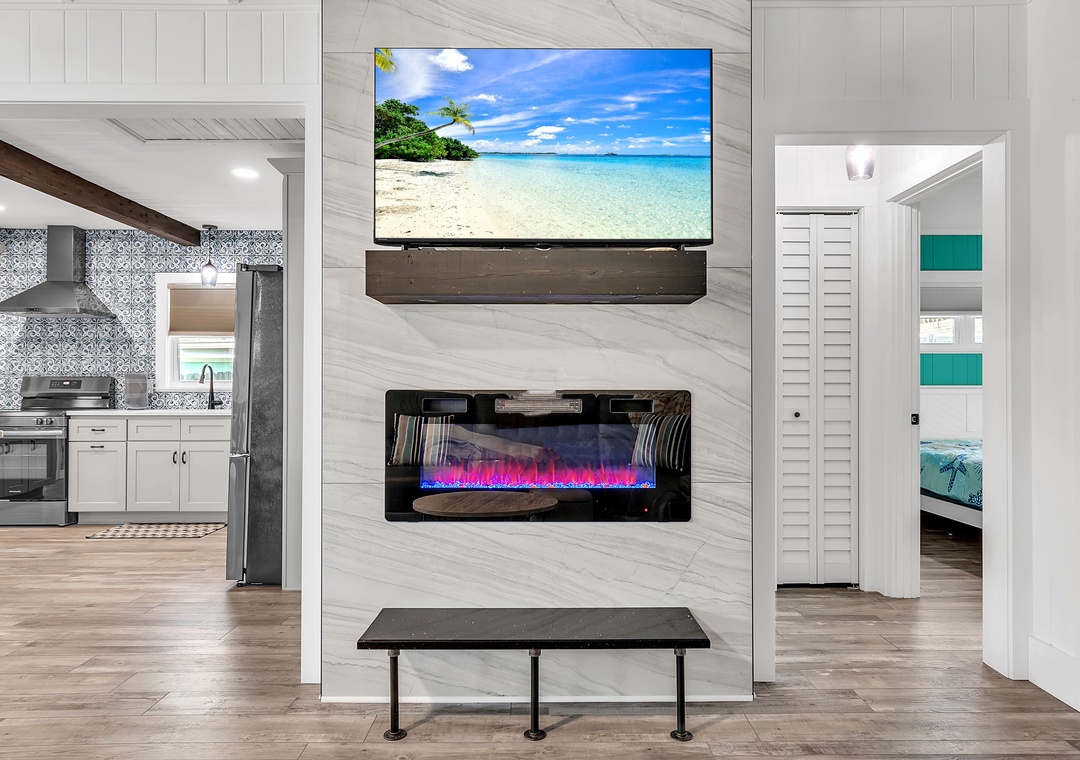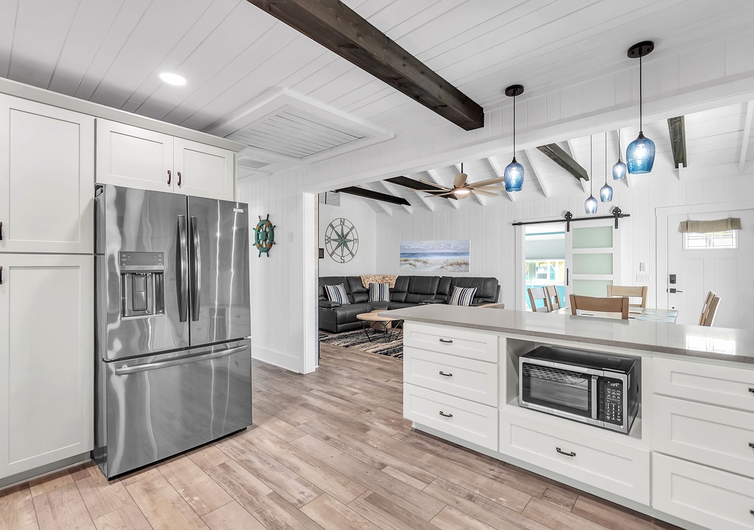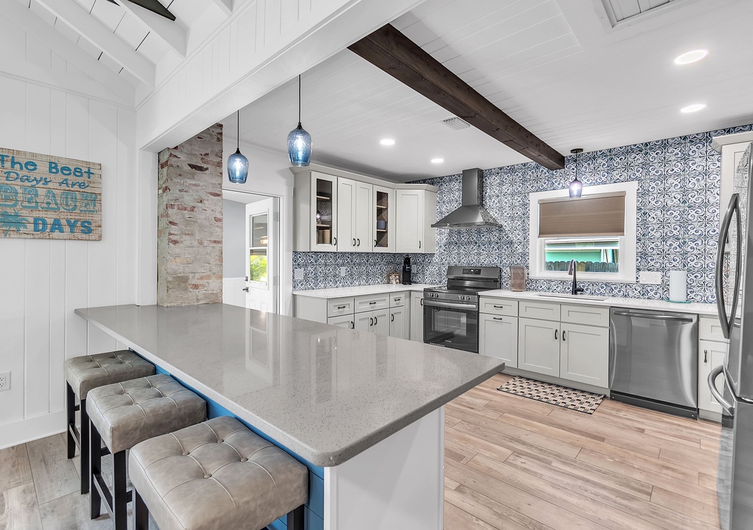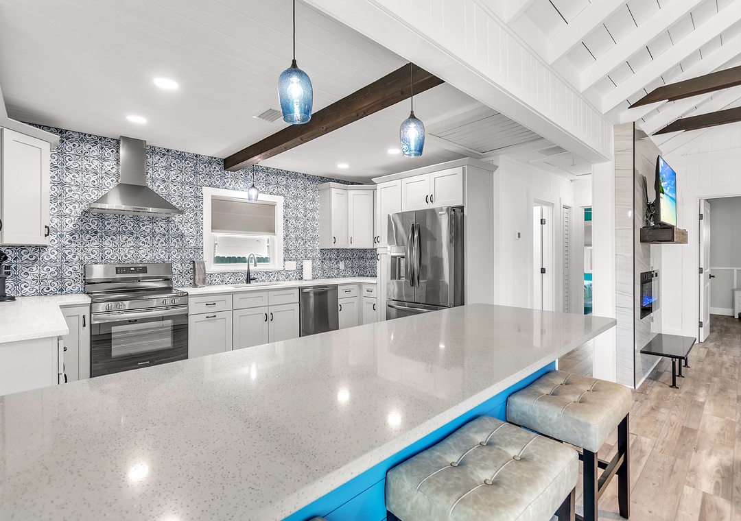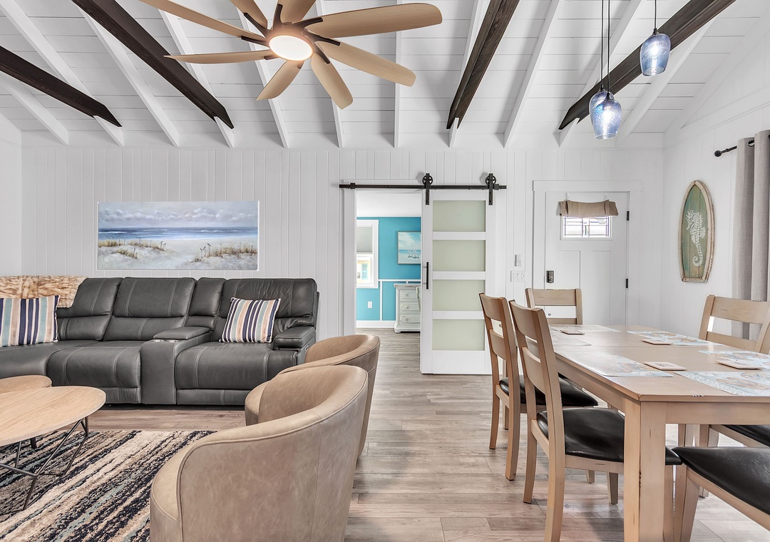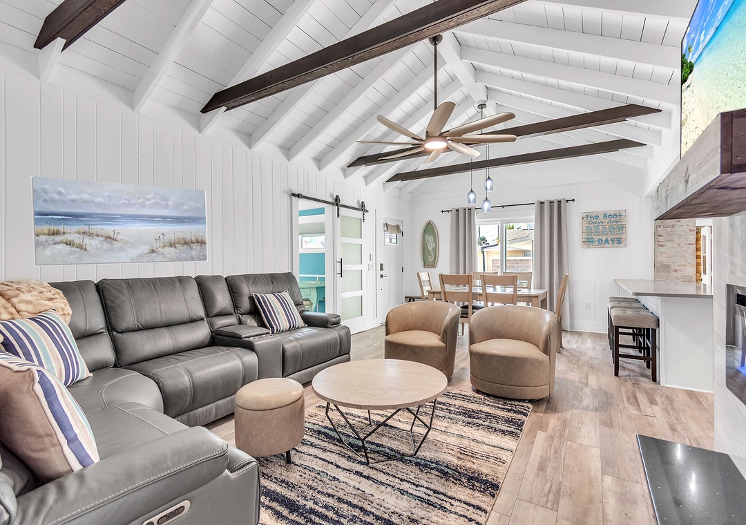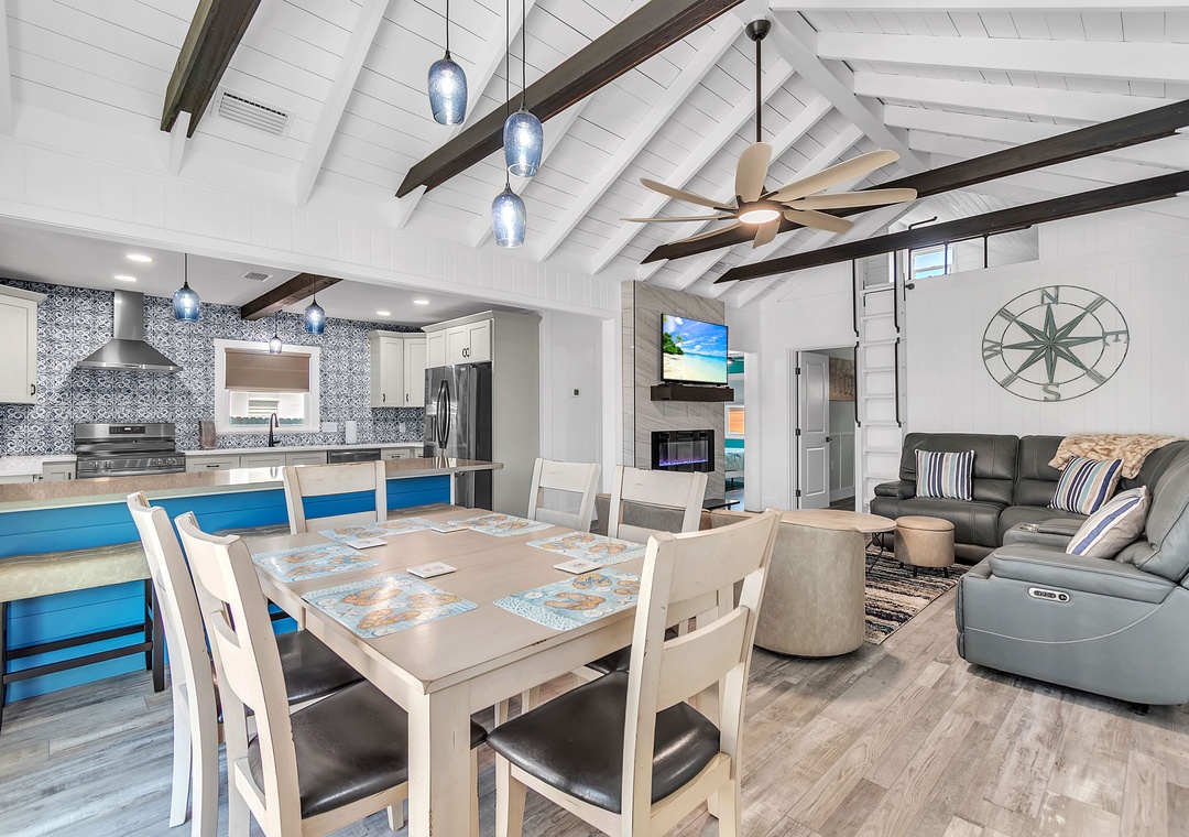 This spacious and bright 3-bedroom, 2.5-bathroom retreat is thoughtfully designed with comfort, style, and relaxation in mind. The living room features a leather sectional with recliners, two additional sitting chairs, a large-screen TV, and an electric fireplace—perfect for unwinding after a day on the sand or settling in for a cozy movie night. The open floor plan flows seamlessly into the dining room and kitchen, where a large dining table seats six and additional bar seating ensures plenty of room for everyone. The kitchen is a chef’s dream, boasting top-of-the-line stainless steel appliances, beautiful backsplash, ample counters and cabinetry, elegant lighting, and a fully stocked array of dishes, cookware, and utensils.