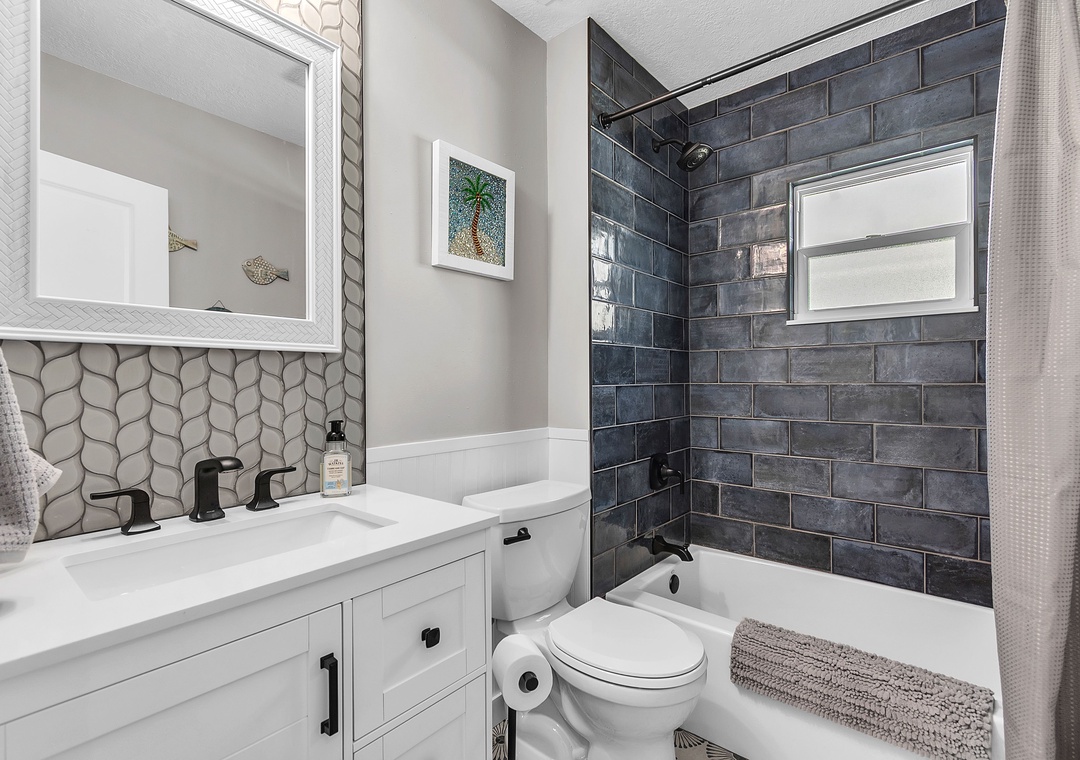 The master bedroom offers a king bed, Smart TV, a stunning en-suite bathroom with a large walk-in shower featuring both a rain head and detachable sprayer, a double vanity, and a huge walk-in closet. The second bedroom also includes a king bed and generous closet space, while the third bedroom provides a queen bed and a small desk—ideal for guests who may need to work while they play. The guest bathroom is beautifully designed with stylish tilework and a tub/shower combo.