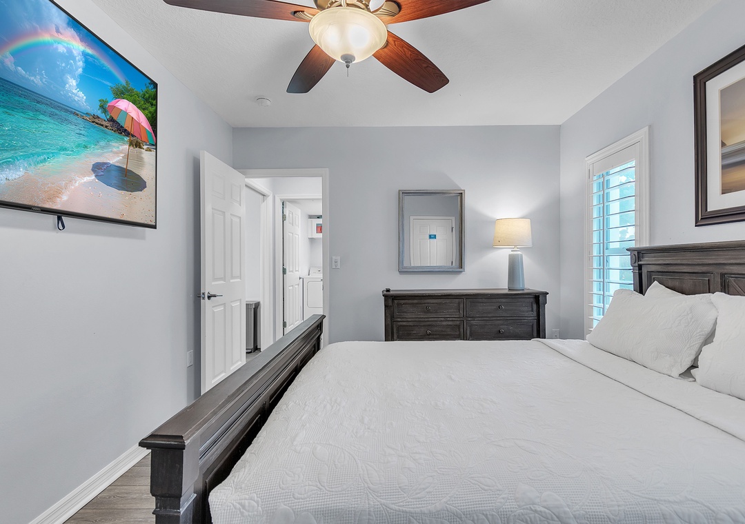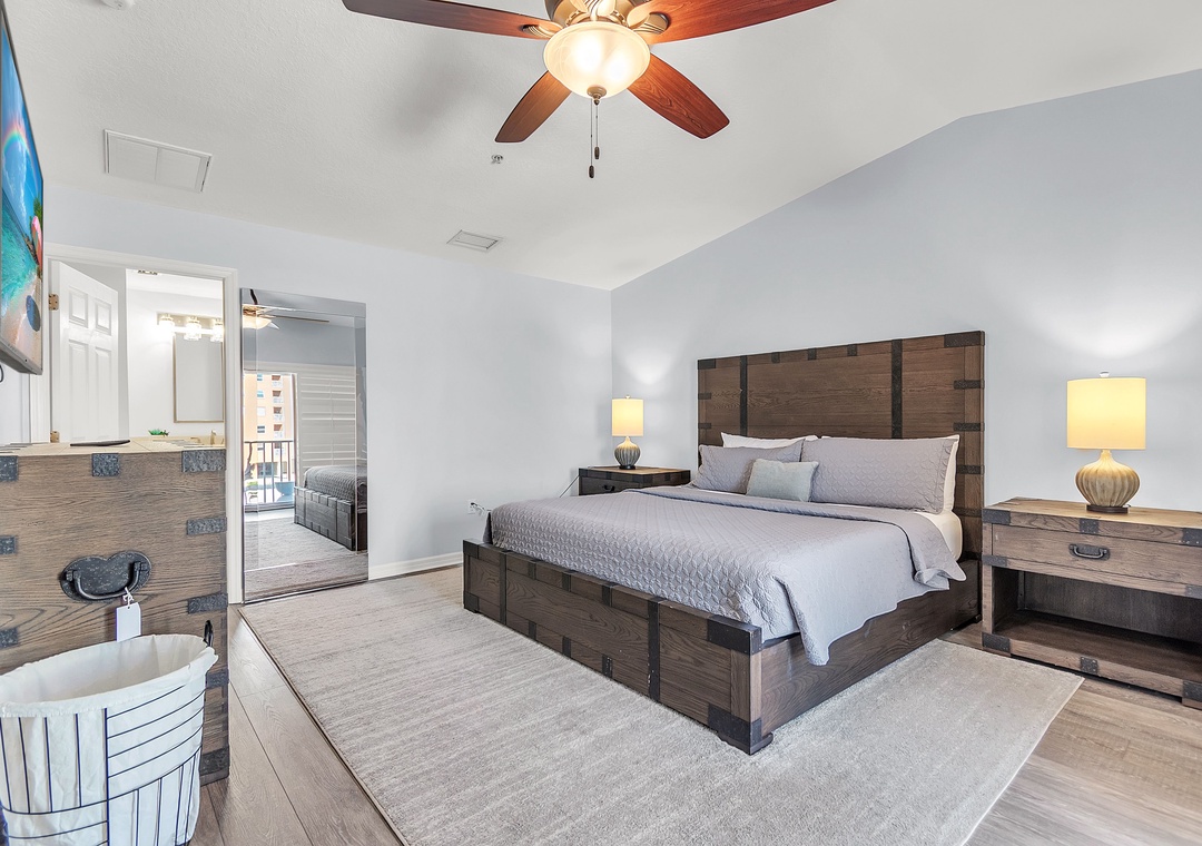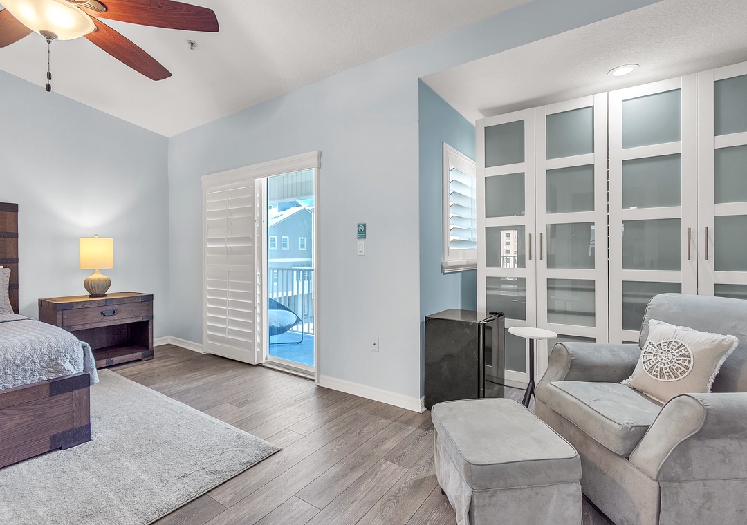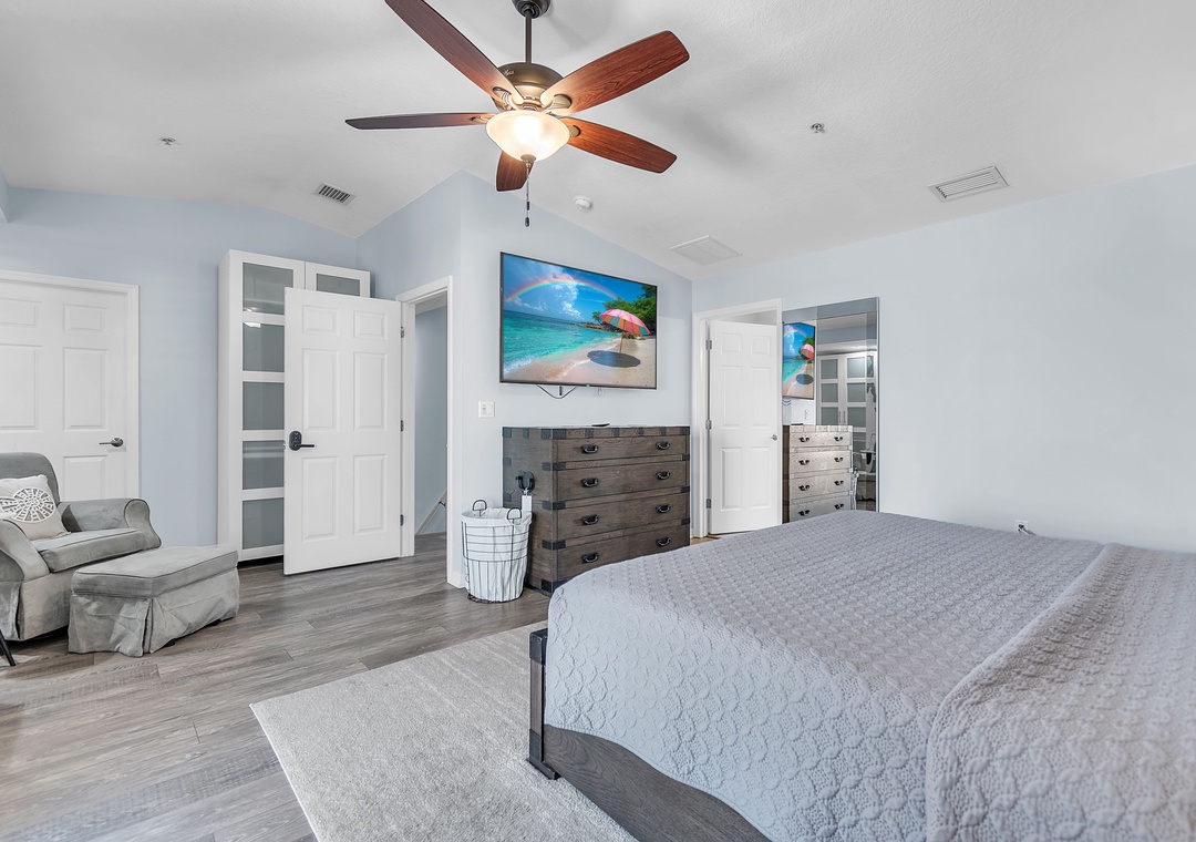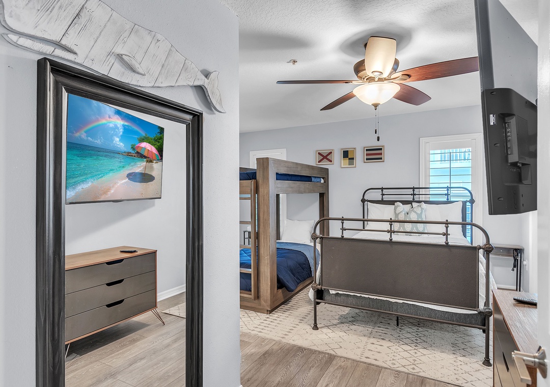 Head up to the third floor to find two additional bedrooms and two full bathrooms. The master suite is a true retreat, offering a plush king-size bed, Smart TV, private balcony with seating for two, and a cozy nook with a chair and ottoman—perfect for curling up with a book. The attached master bathroom is stunning, featuring a double vanity and a spacious walk-in shower with stylish tilework. The third bedroom includes an individual queen bed plus a twin-over-twin bunk, its own Smart TV, and another private balcony for enjoying gentle coastal breezes. Its en-suite bathroom offers a double vanity, walk-in shower, and a small bathtub for added relaxation options.