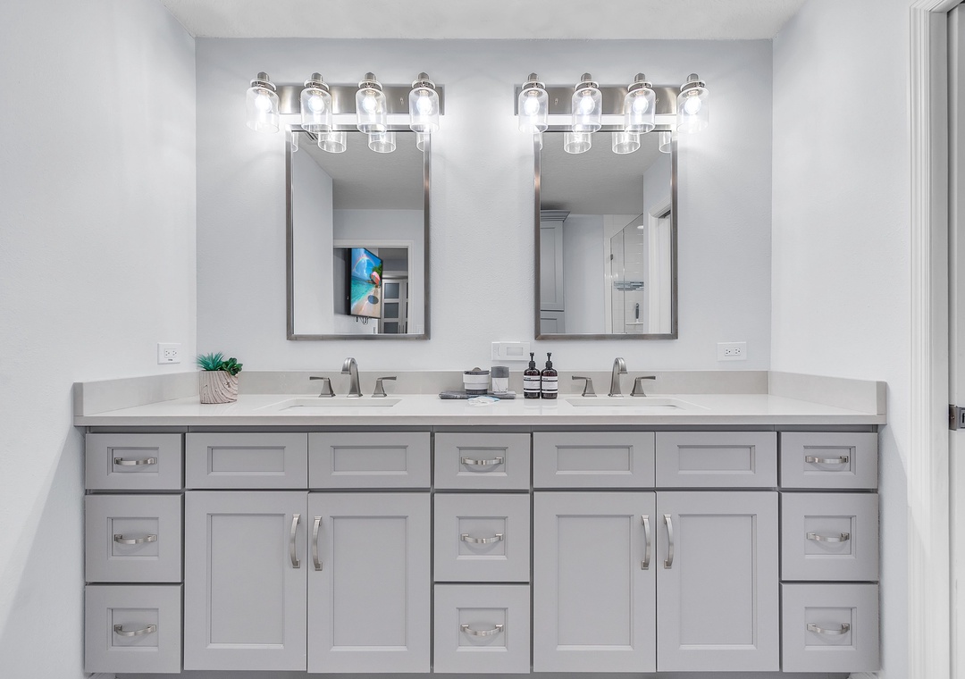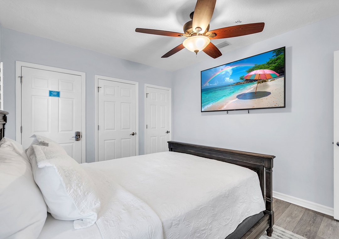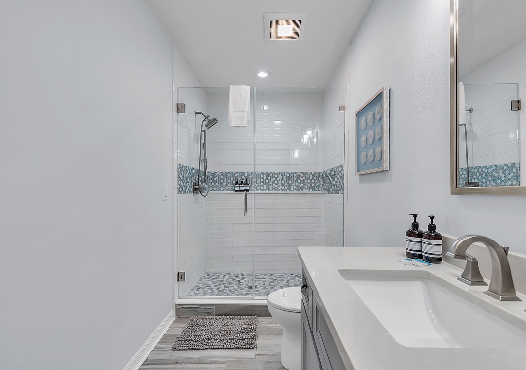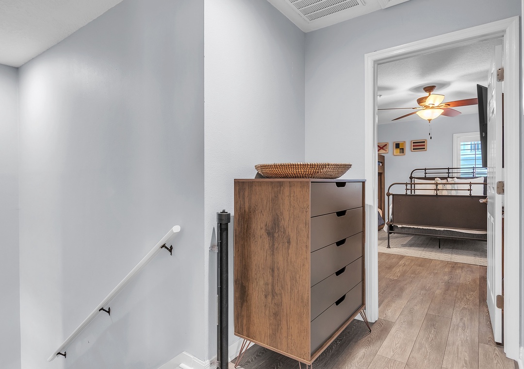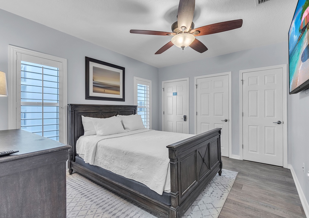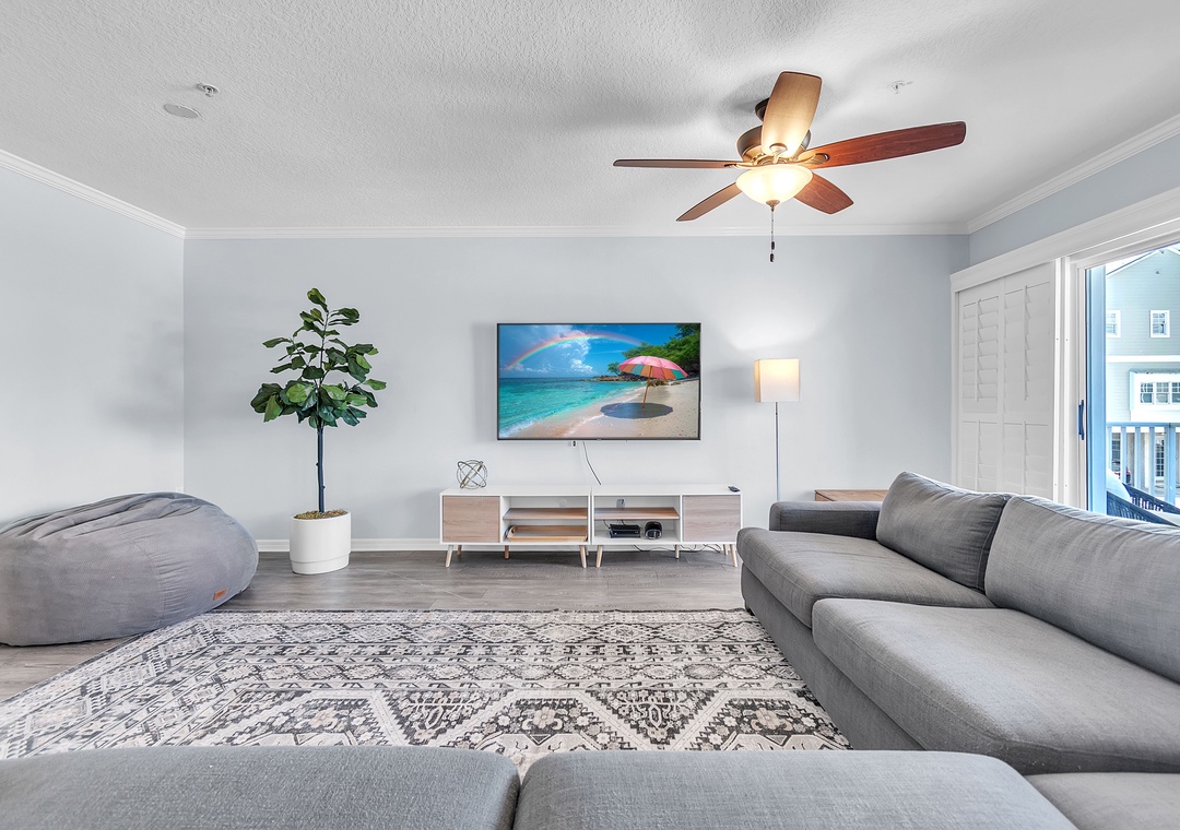 Head up to the third floor to find two additional bedrooms and two full bathrooms. The master suite is a true retreat, offering a plush king-size bed, Smart TV, private balcony with seating for two, and a cozy nook with a chair and ottoman—perfect for curling up with a book. The attached master bathroom is stunning, featuring a double vanity and a spacious walk-in shower with stylish tilework. The third bedroom includes an individual queen bed plus a twin-over-twin bunk, its own Smart TV, and another private balcony for enjoying gentle coastal breezes. Its en-suite bathroom offers a double vanity, walk-in shower, and a small bathtub for added relaxation options.