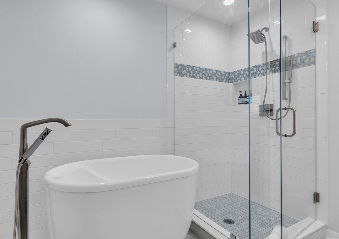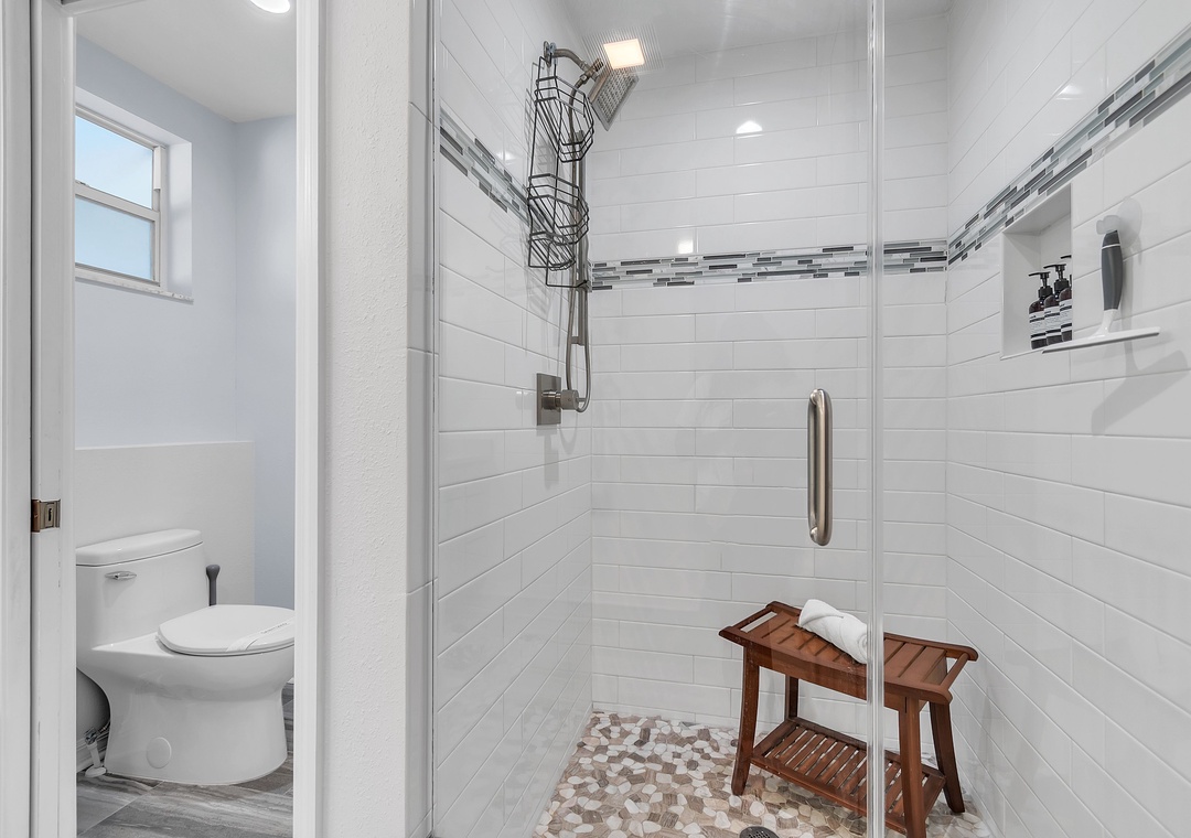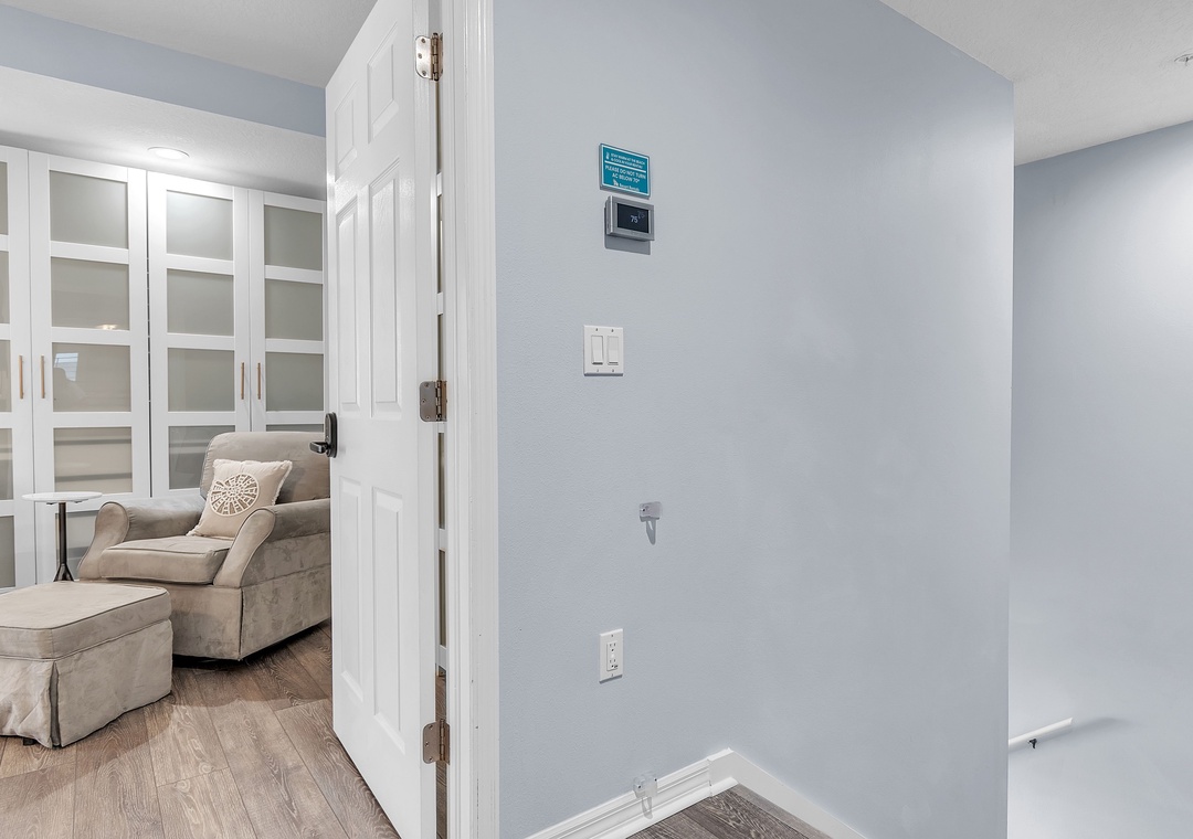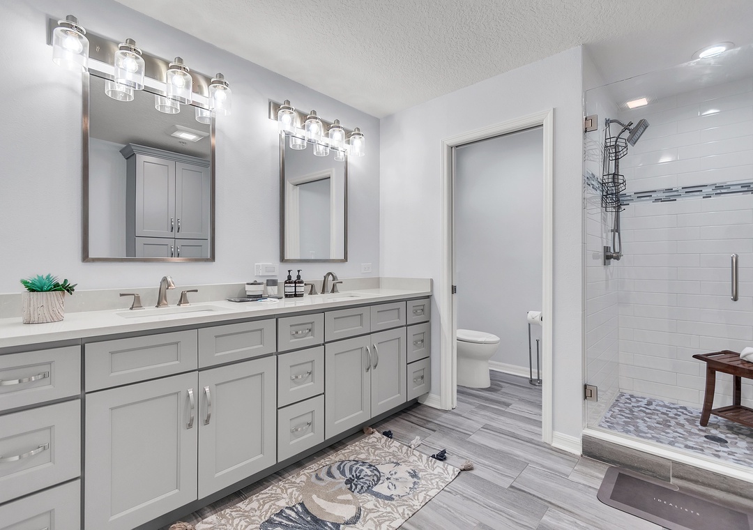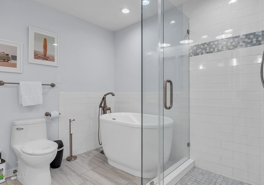 Head up to the third floor to find two additional bedrooms and two full bathrooms. The master suite is a true retreat, offering a plush king-size bed, Smart TV, private balcony with seating for two, and a cozy nook with a chair and ottoman—perfect for curling up with a book. The attached master bathroom is stunning, featuring a double vanity and a spacious walk-in shower with stylish tilework. The third bedroom includes an individual queen bed plus a twin-over-twin bunk, its own Smart TV, and another private balcony for enjoying gentle coastal breezes. Its en-suite bathroom offers a double vanity, walk-in shower, and a small bathtub for added relaxation options.