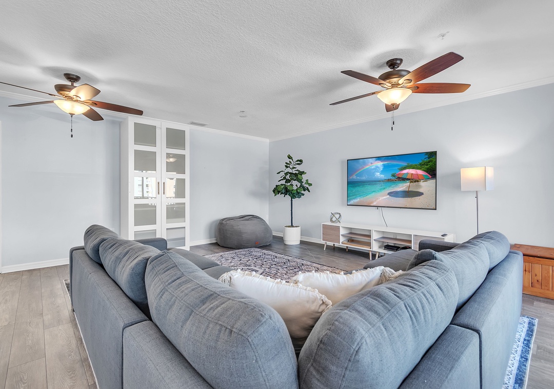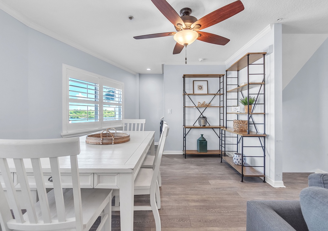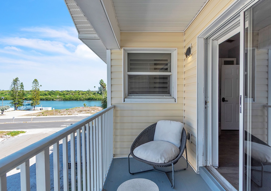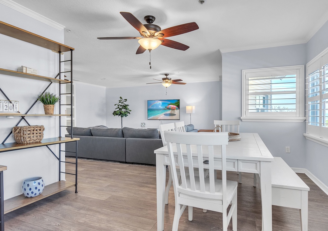 Enter on the ground level and head upstairs to the open and spacious main living area, where a large, comfortable sectional sofa and a big-screen Smart TV invite you to settle in. The private balcony off the living room faces north, offering a unique vantage point with Gulf views on one side and the Intracoastal Waterway on the other—the best of both worlds. This second level also includes the dining area and a fully stocked kitchen featuring stainless steel appliances, ample cabinet space, an air fryer, and even a wine fridge, ensuring you feel right at home. Gather around the large dining table for meals, games, or cards. Also on this level is a queen bedroom with a TV, a beautifully updated full bathroom with a large walk-in shower, and a convenient laundry room.