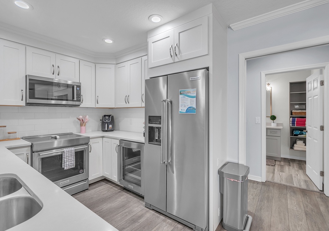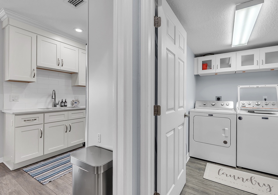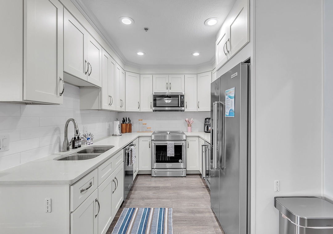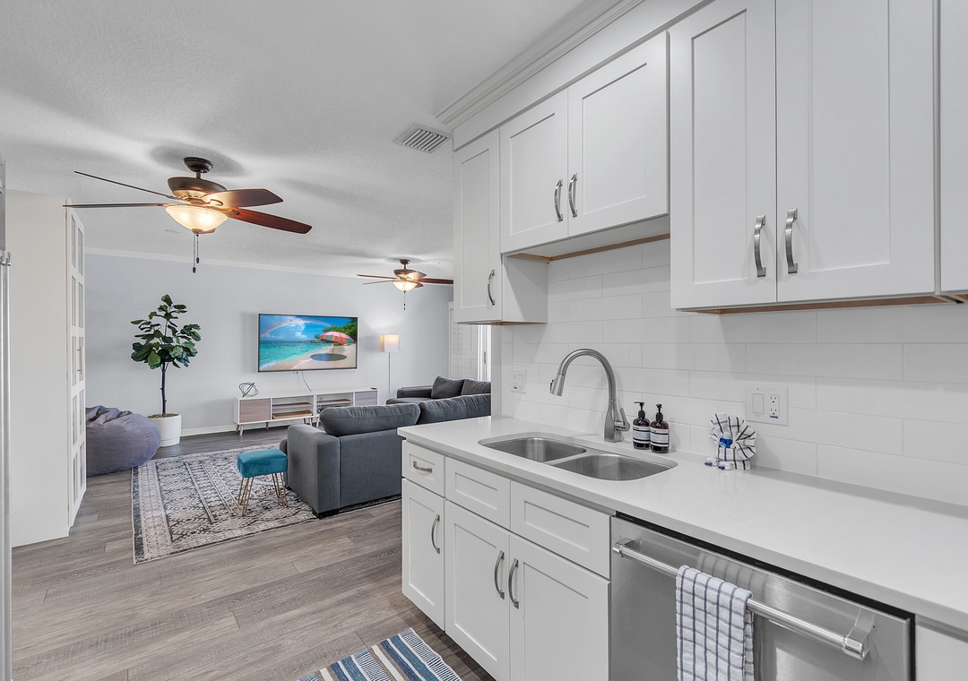 Enter on the ground level and head upstairs to the open and spacious main living area, where a large, comfortable sectional sofa and a big-screen Smart TV invite you to settle in. The private balcony off the living room faces north, offering a unique vantage point with Gulf views on one side and the Intracoastal Waterway on the other—the best of both worlds. This second level also includes the dining area and a fully stocked kitchen featuring stainless steel appliances, ample cabinet space, an air fryer, and even a wine fridge, ensuring you feel right at home. Gather around the large dining table for meals, games, or cards. Also on this level is a queen bedroom with a TV, a beautifully updated full bathroom with a large walk-in shower, and a convenient laundry room.