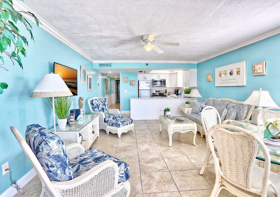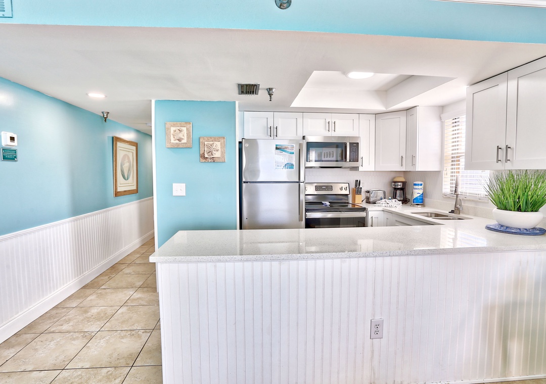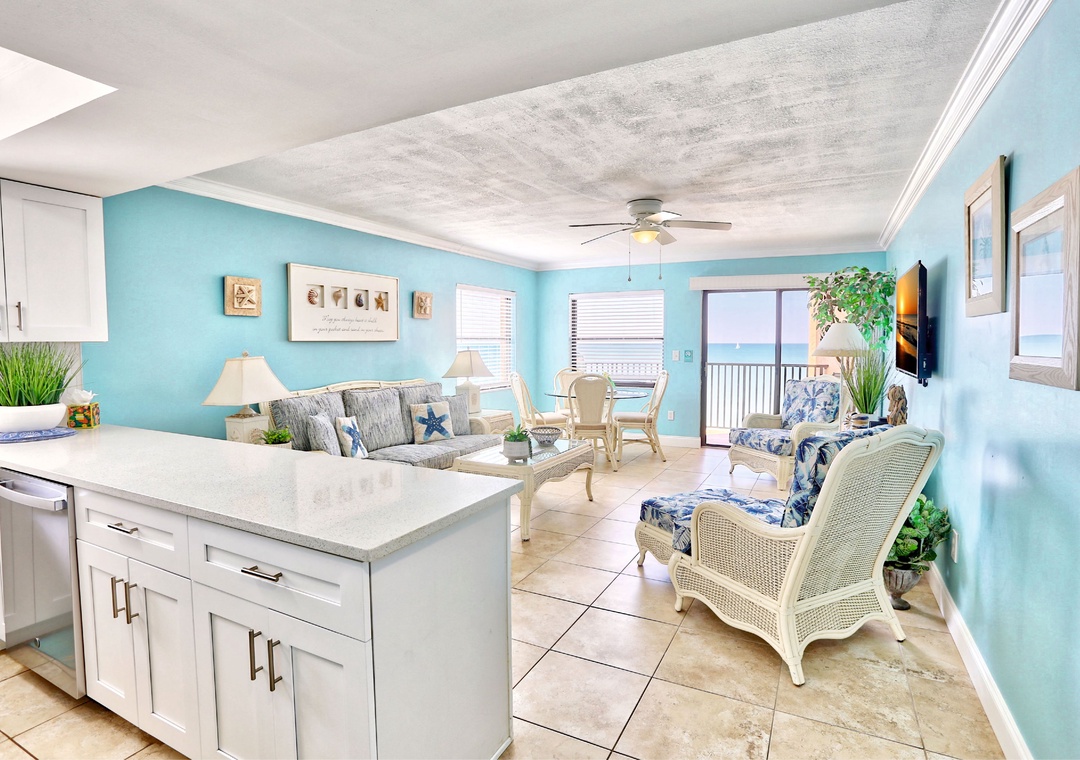Escape to paradise in this stunning top-floor beachfront condo, where breathtaking Gulf views and gorgeous sunsets await you every evening. This beautifully updated 2-bedroom, 2-bathroom condo features lovely tropical décor and a spacious living area that opens to a private balcony—perfect for relaxing with a cup of coffee in the morning, or a cocktail in the evening as you take in the beautiful Florida sunsets. The bright, fully stocked kitchen is equipped with stainless steel appliances and everything you need to prepare delicious meals at home, with a dining table set for four.