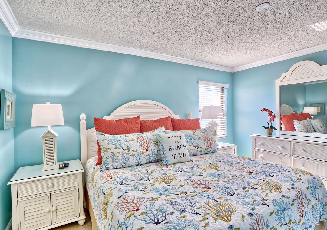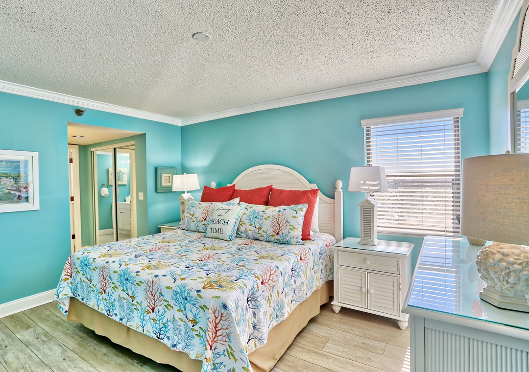 Master Bedroom - King Bed. TV. Attached Bathroom