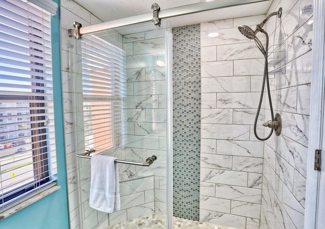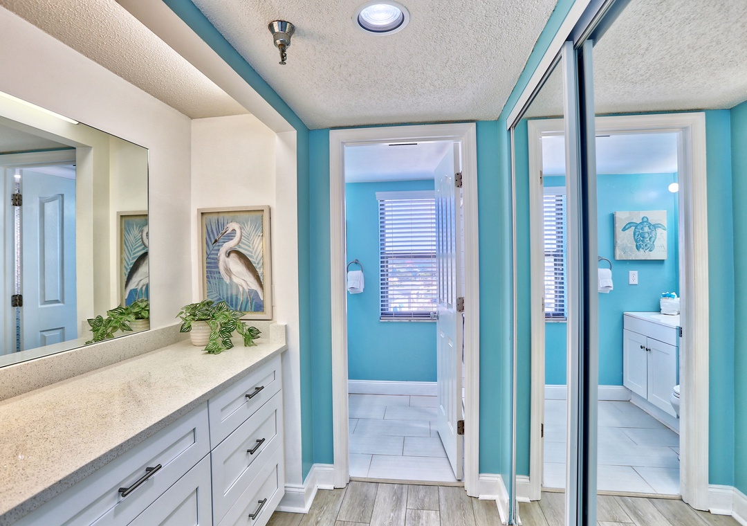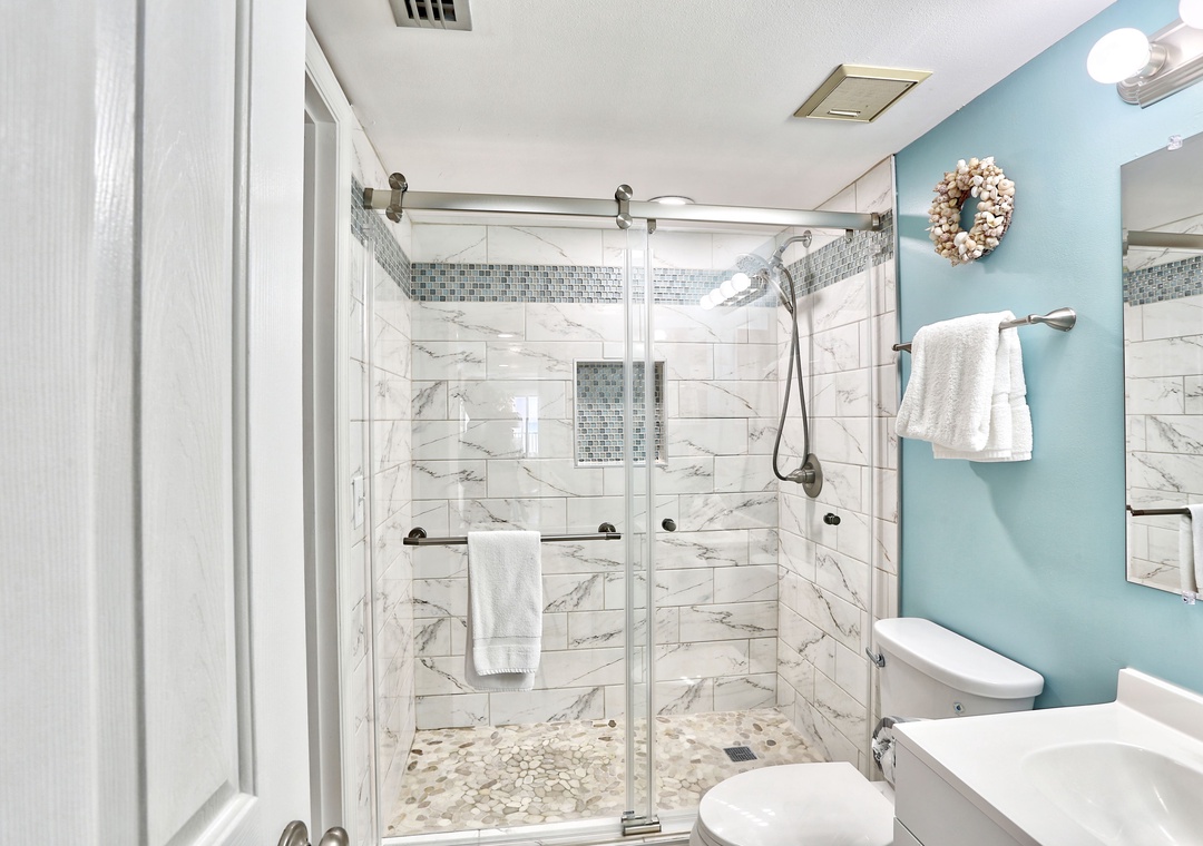 The master bedroom offers a king-size bed, TV, and an attached spa-like bathroom with a large walk-in shower. The guest bedroom features two twin beds, ideal for family or friends, and a second beautifully designed bathroom with another spacious walk-in shower. For your convenience, coin-operated washer/dryer facilities are available on floors 2, 4, and 6 here.