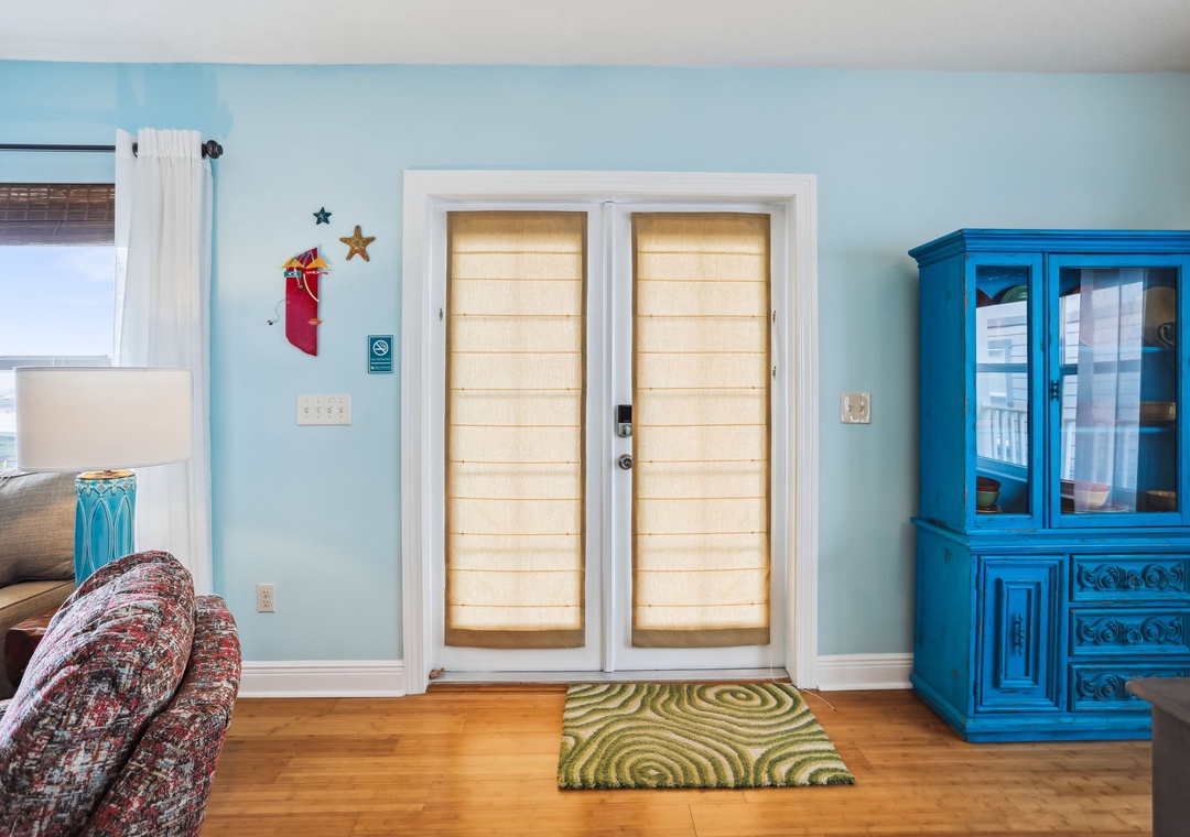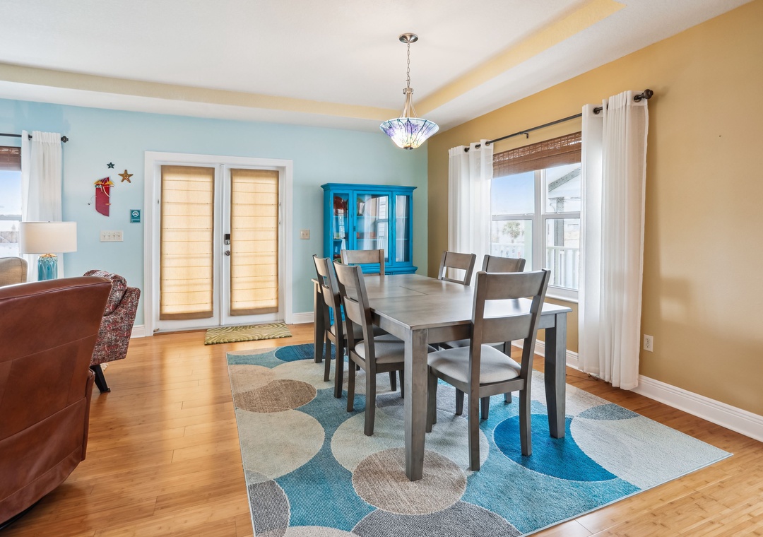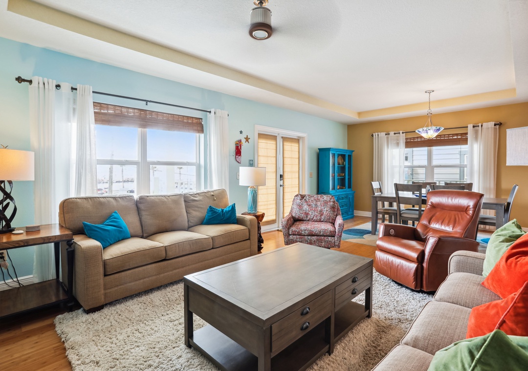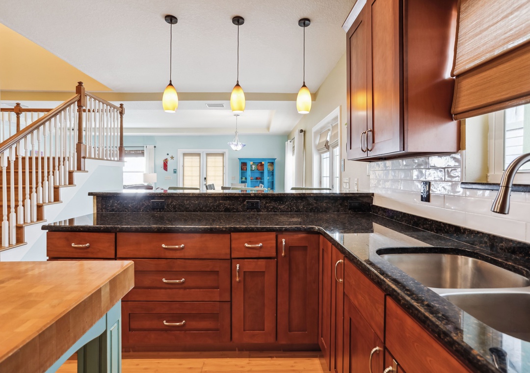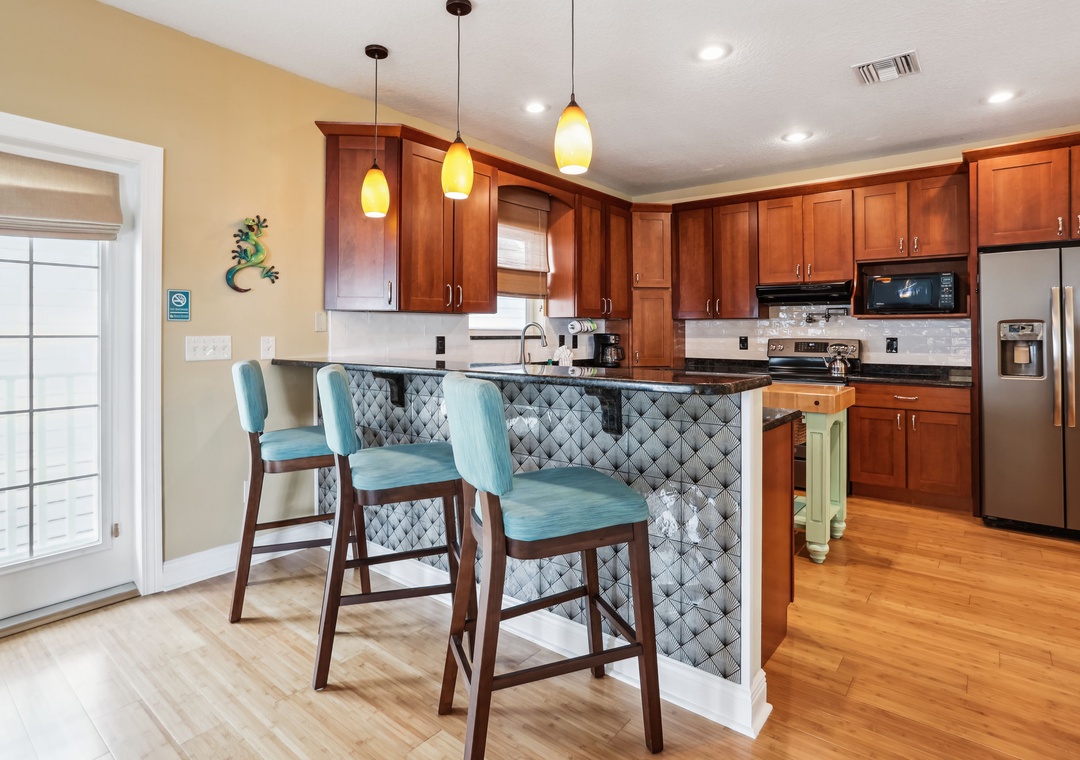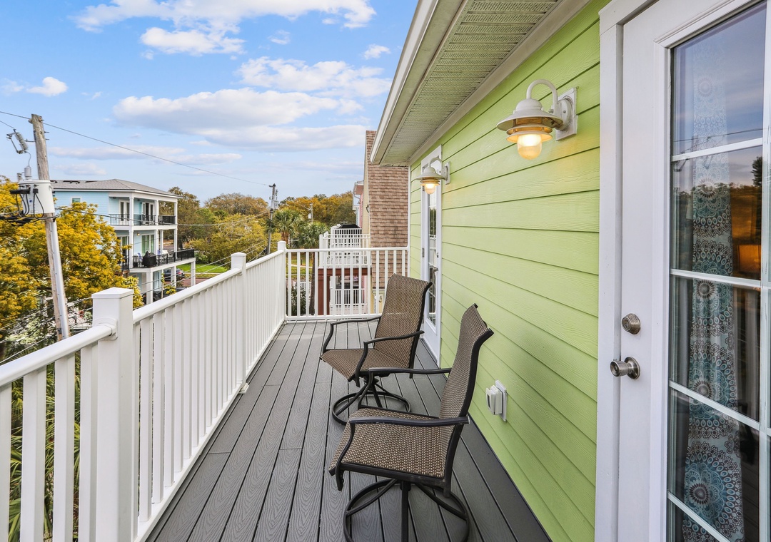 There are 3 levels to this home; ground level will be parking, the middle level is your living/dining area with a bedroom and full bath. There are 3 more bedrooms upstairs as well. The kitchen is fully stocked and equipped with all the essentials you need for creating delicious meals and memorable moments. The main level bedroom is set up with a Twin Trundle bed, giving you 2 twin beds for sleeping options on that level. The upper level has 2 bedrooms that are equipped with a King bed in each, the 3rd upper-level bedroom has a Queen bed so that all guests have a quiet, comfortable space to retreat to after a full day in the sun! Another awesome perk to this house is that you have not 1, but 2 private balconies to relax on, savor the coastal breeze and breathtaking water views and just unwind as you soak in the surroundings.