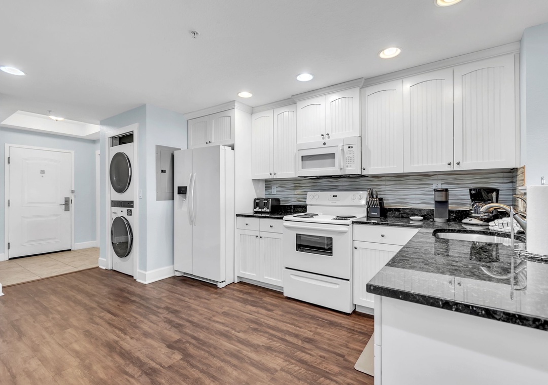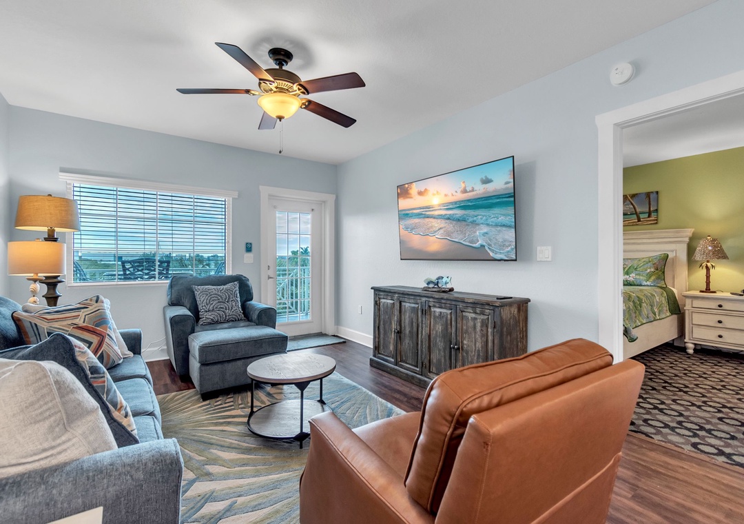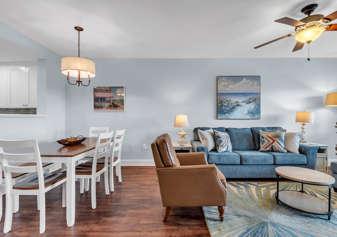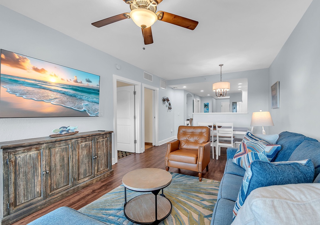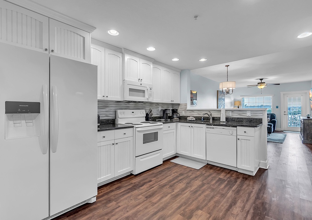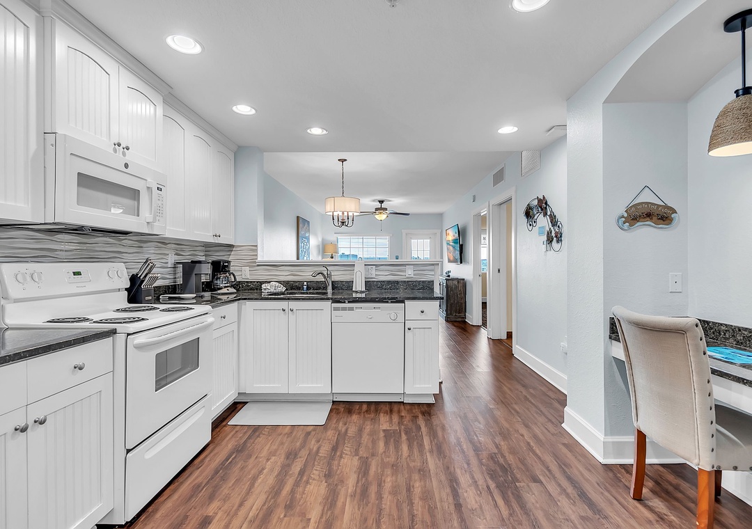 The open living area is designed for comfort, featuring a comfy couch (that pulls out to sofa sleeper), two sitting chairs, a large screen smart TV, and direct access to the private balcony. The living room flows seamlessly into the dining and kitchen areas, where a dining table comfortably seats six—perfect for family meals or game nights. The open, updated kitchen is fully equipped with all major appliances, dishes, cookware, and utensils, and a convenient desk space just off the kitchen provides a great option for guests who need to work while away. A washer and dryer are also available in the condo for added convenience.