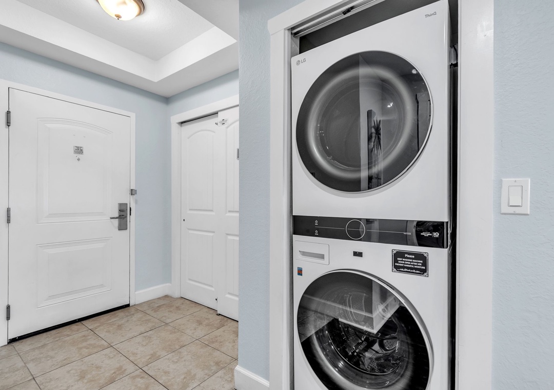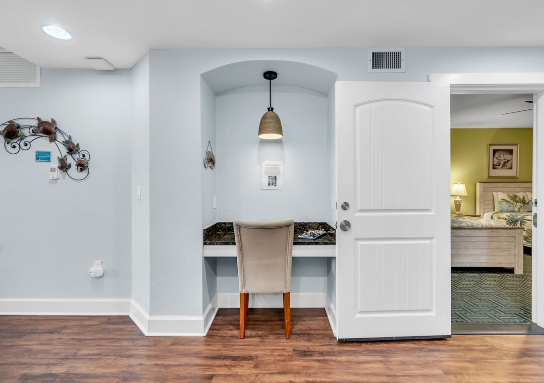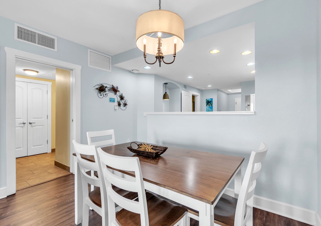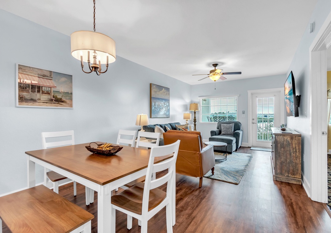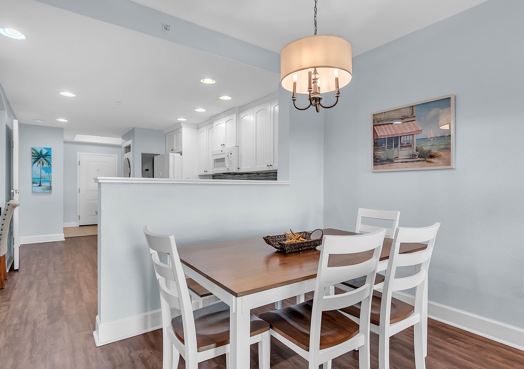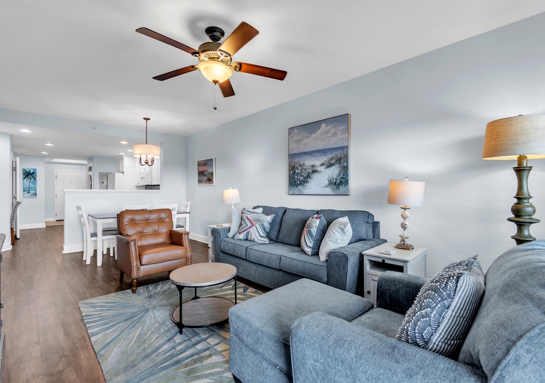 The open living area is designed for comfort, featuring a comfy couch (that pulls out to sofa sleeper), two sitting chairs, a large screen smart TV, and direct access to the private balcony. The living room flows seamlessly into the dining and kitchen areas, where a dining table comfortably seats six—perfect for family meals or game nights. The open, updated kitchen is fully equipped with all major appliances, dishes, cookware, and utensils, and a convenient desk space just off the kitchen provides a great option for guests who need to work while away. A washer and dryer are also available in the condo for added convenience.