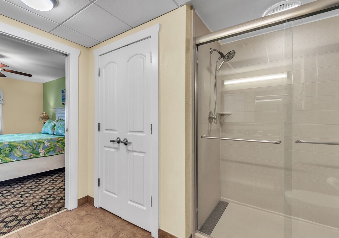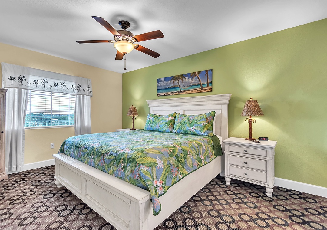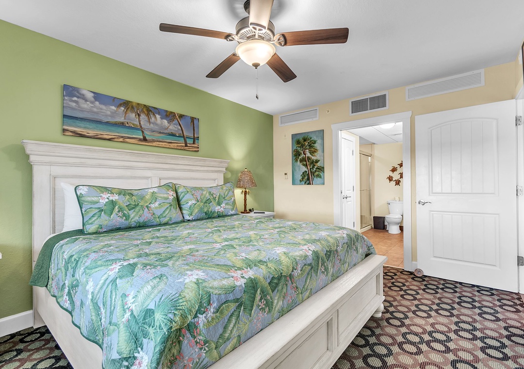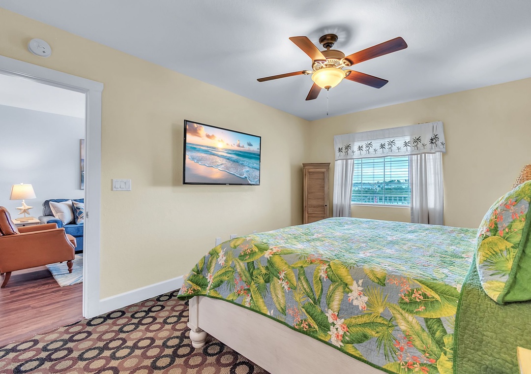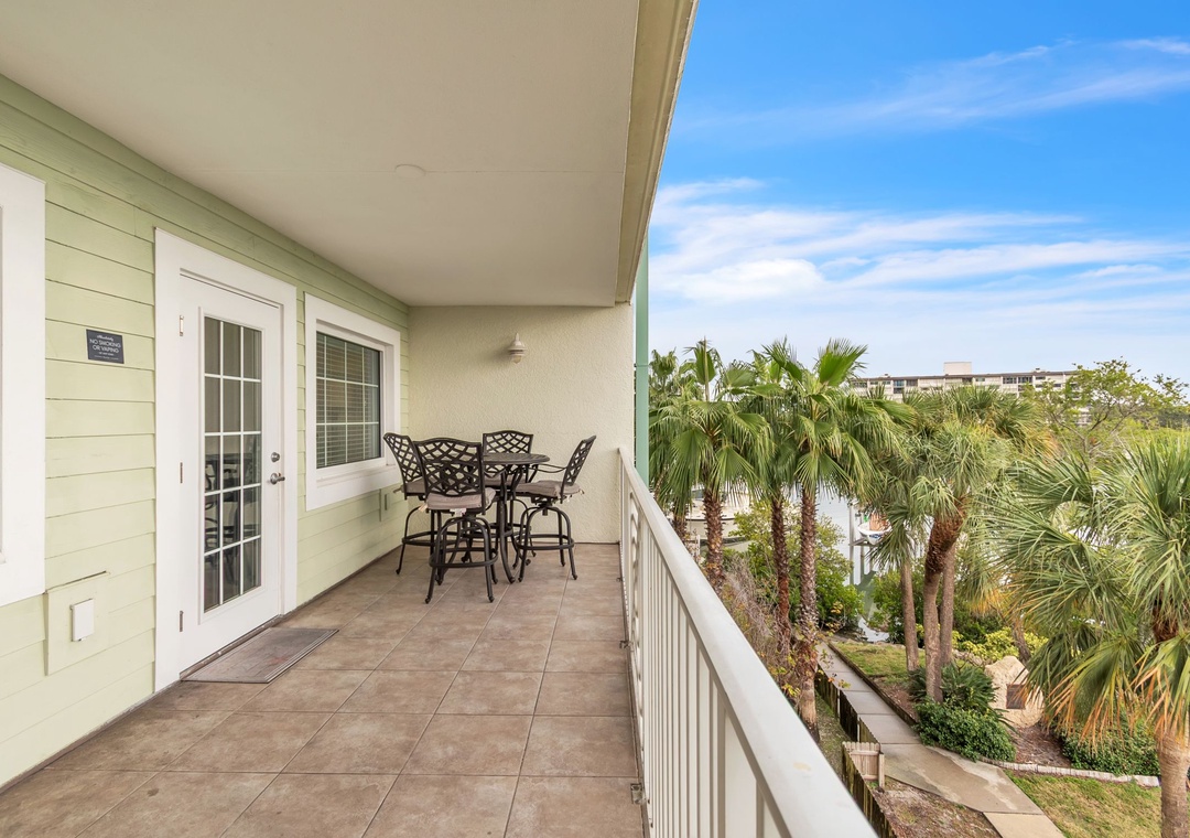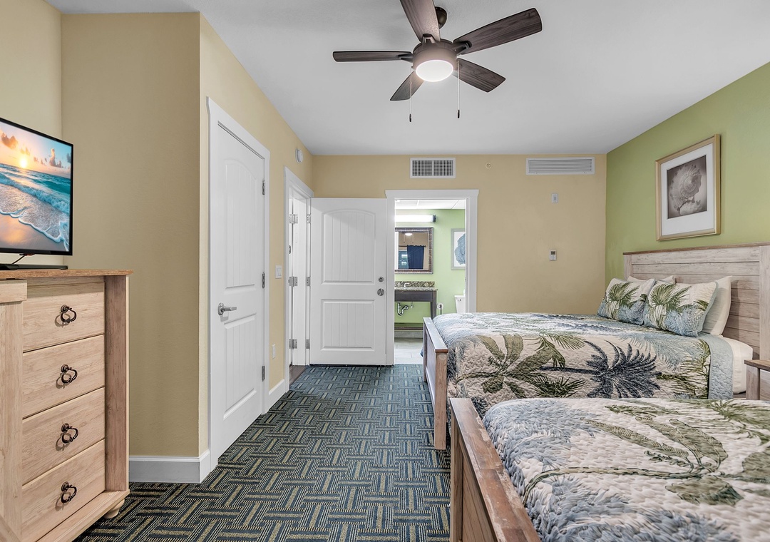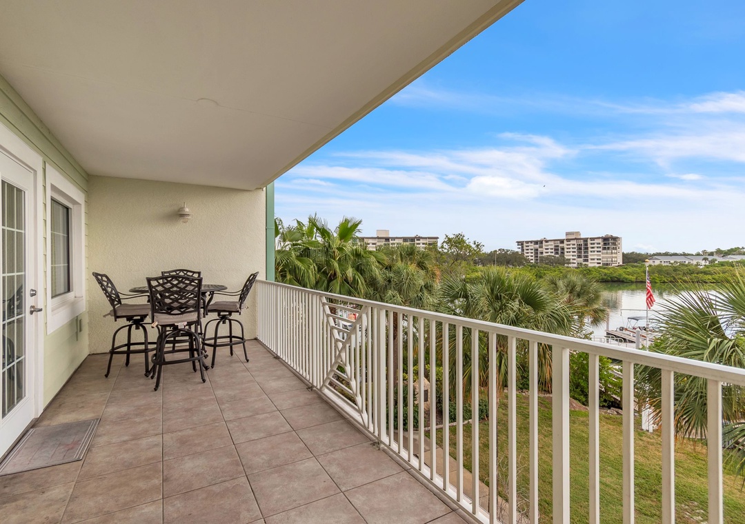 The master bedroom offers a king bed, TV, and a private attached bathroom, while the guest bedroom includes two queen beds, its own attached bathroom, and a TV—ideal for families or groups traveling together. Step outside onto the large private balcony, an inviting space to unwind and enjoy partial views of the Intracoastal Waterway and lush tropical surroundings. With outdoor table and chairs, it’s the perfect spot to relax or enjoy dinner outside after a fun-filled day at the waterpark or exploring the area.