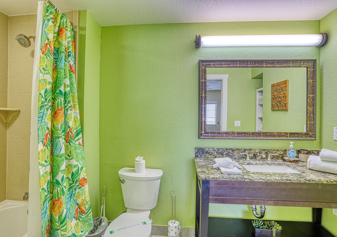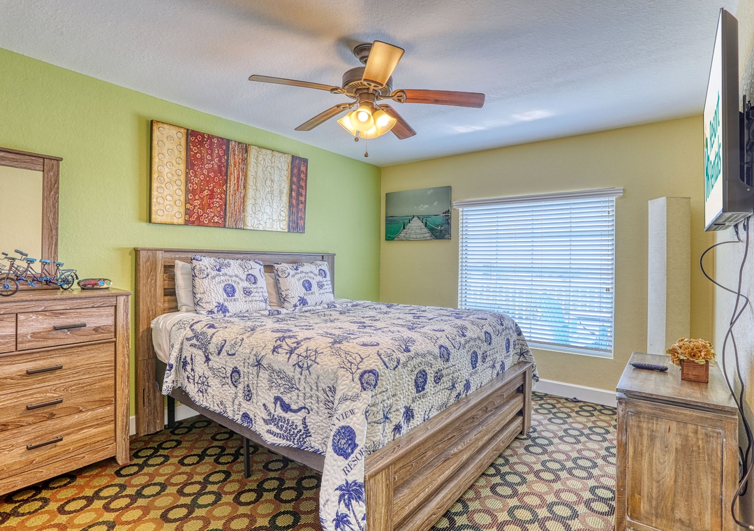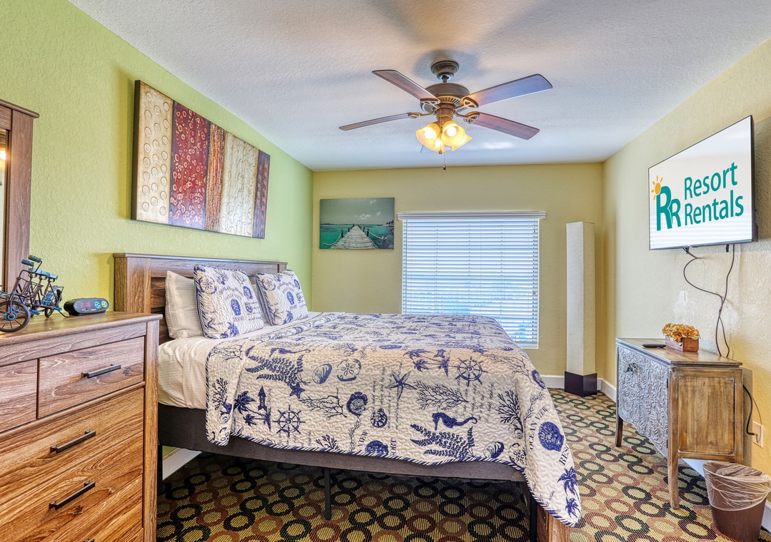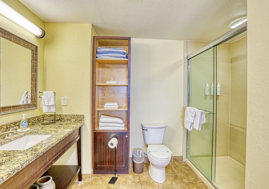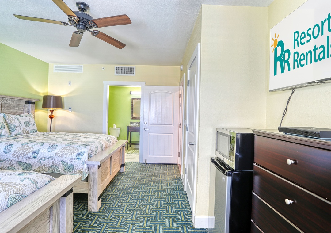 The master bedroom boasts a king bed, TV, and a roomy en-suite bathroom with a walk-in shower. The guest bedroom includes two queen beds and a TV, with a second bathroom featuring a tub/shower combo. You will also find a washer and dryer in the condo for your use, free wifi, and 1 parking space. To add to the fun and convenience here, 2 FREE daily water park entrance passes are included! Additional passes can be purchased onsite.