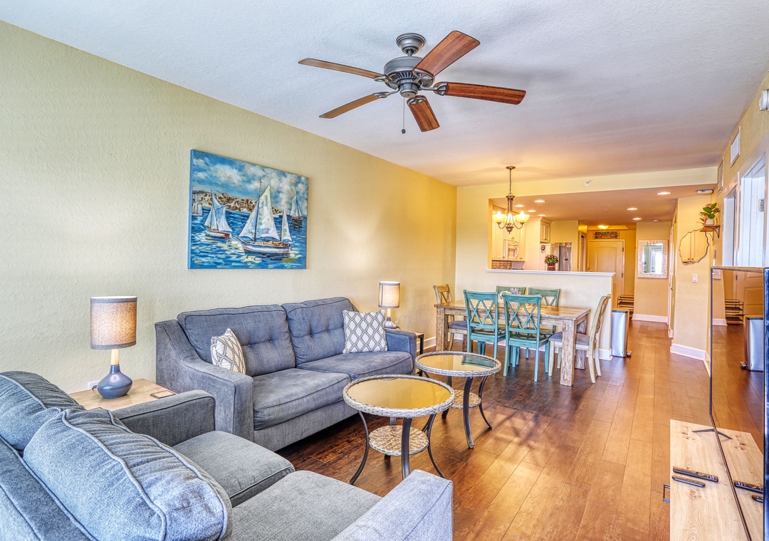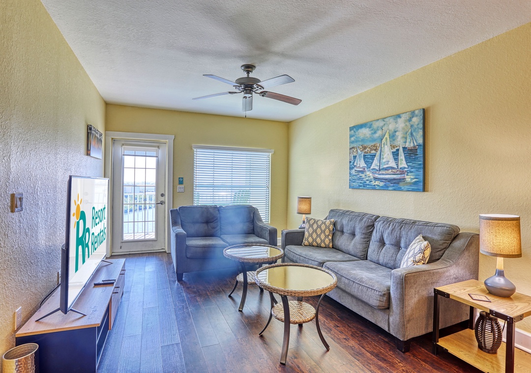 Welcome to Harbourside Marker 33 - #8816! This welcoming condo is the perfect home base for days filled with sun, adventure, and family fun. The open living area features a comfortable couch and loveseat, a large-screen TV, and direct access to your private balcony where you will enjoy wide-open waterway views. A large dining table offers plenty of space for family meals, and the fully stocked kitchen—complete with dishes, utensils, and cookware—makes it easy to prepare everything from sit-down dinners to quick snacks between water-park runs.