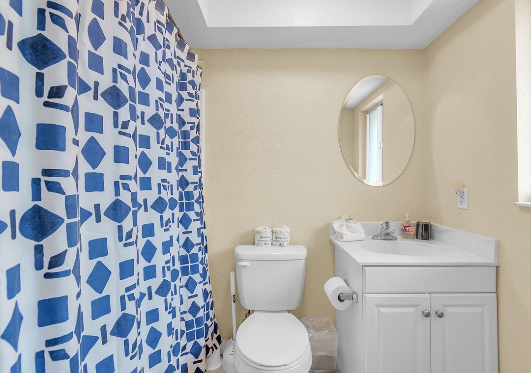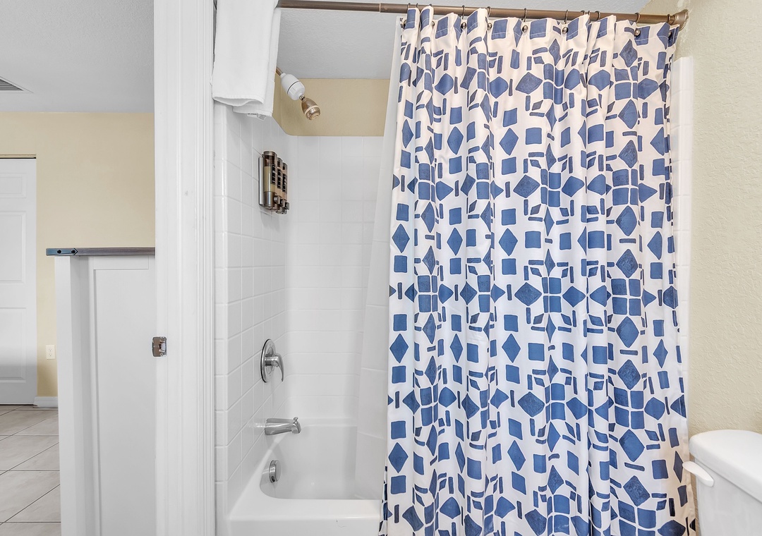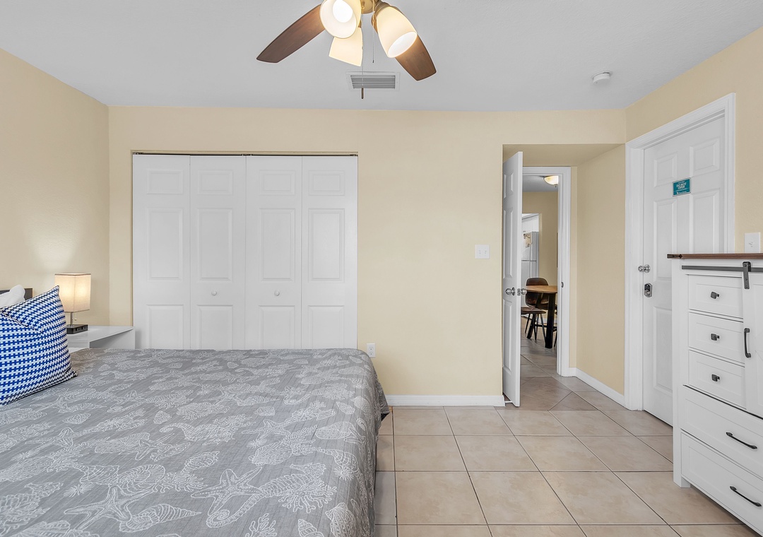 The spacious bedroom features a king-sized bed and a flat-screen TV, creating a restful retreat after a day at the beach. The attached bathroom includes a convenient tub/shower combo.