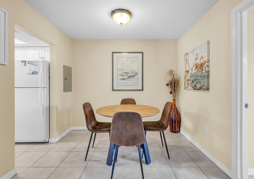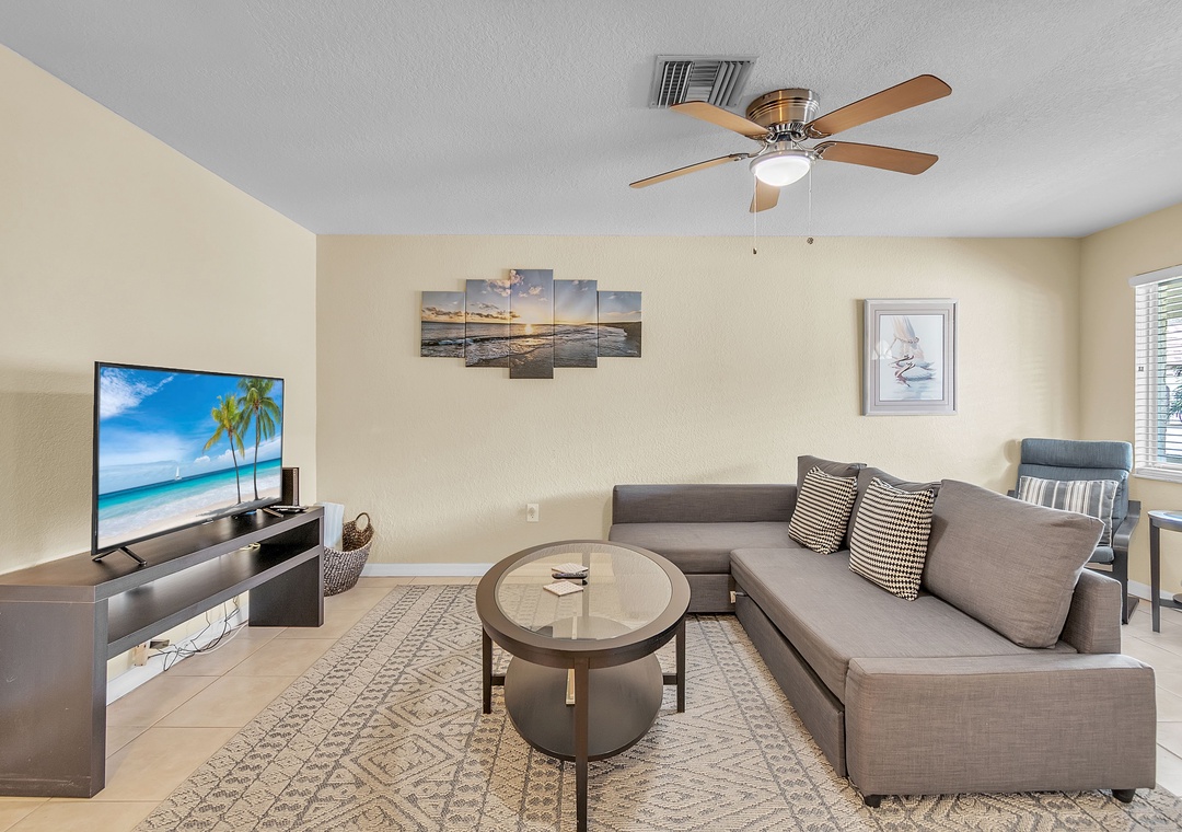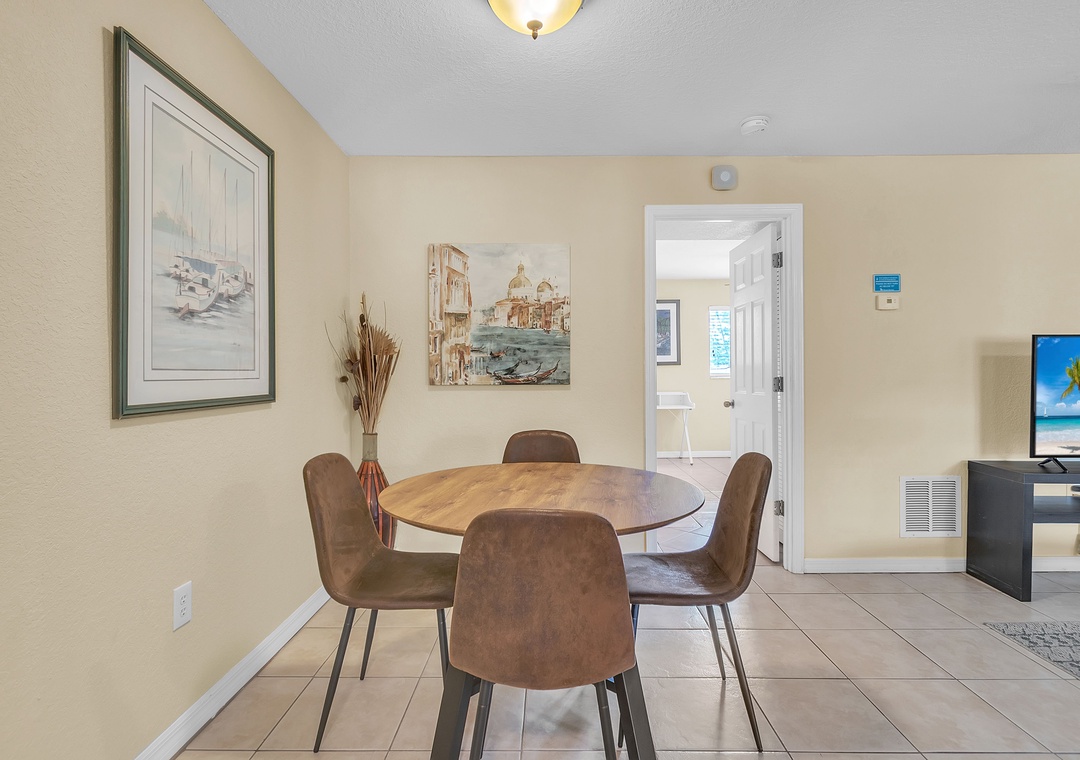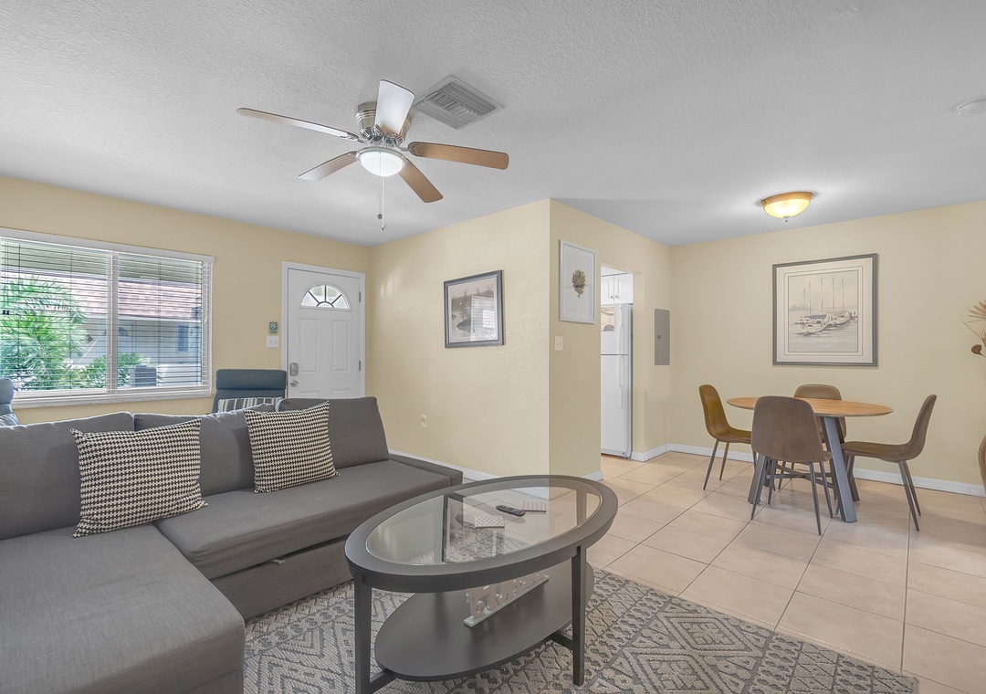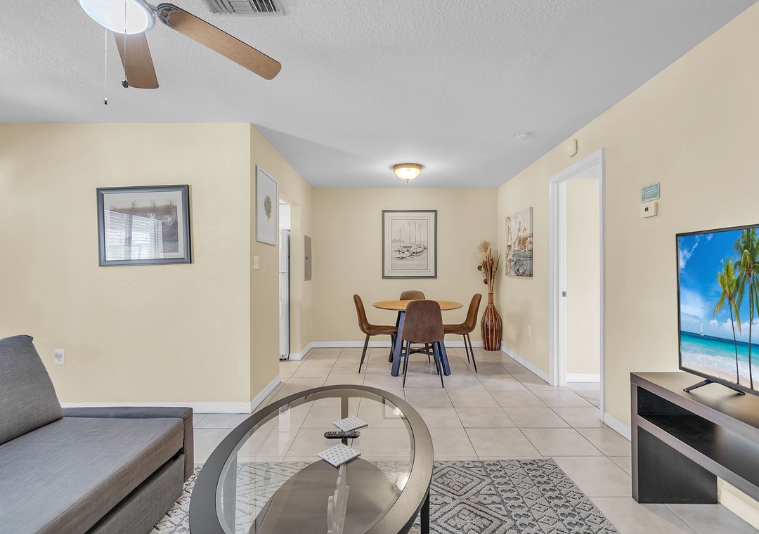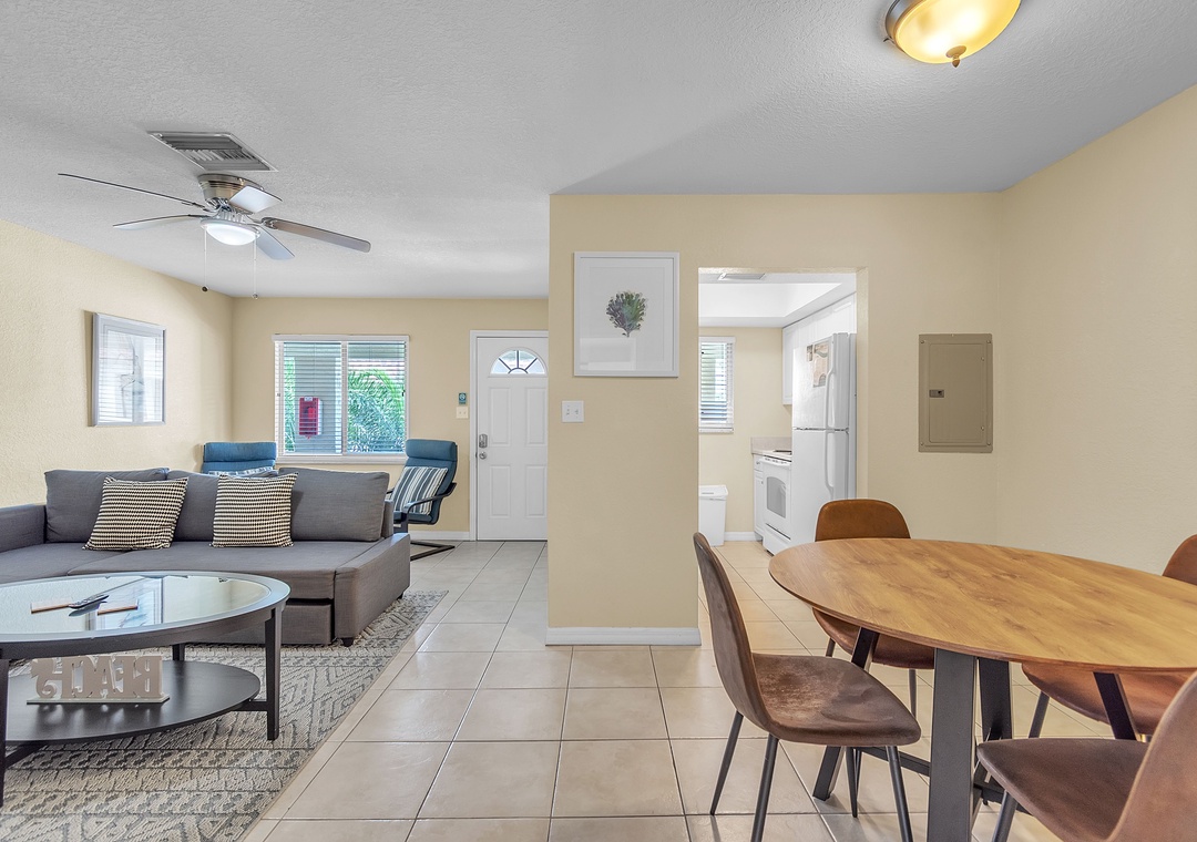 Step inside to an open-concept living space featuring a chaise-style couch, TV, two accent chairs and a cozy table near the entrance — perfect for morning coffee or extra seating when guests visit. The kitchen is fully stocked with dishes, utensils, and cookware, making it easy to whip up your favorite meals. Gather around the dining table set for four — ideal for family dinners, game nights, or enjoying takeout!!