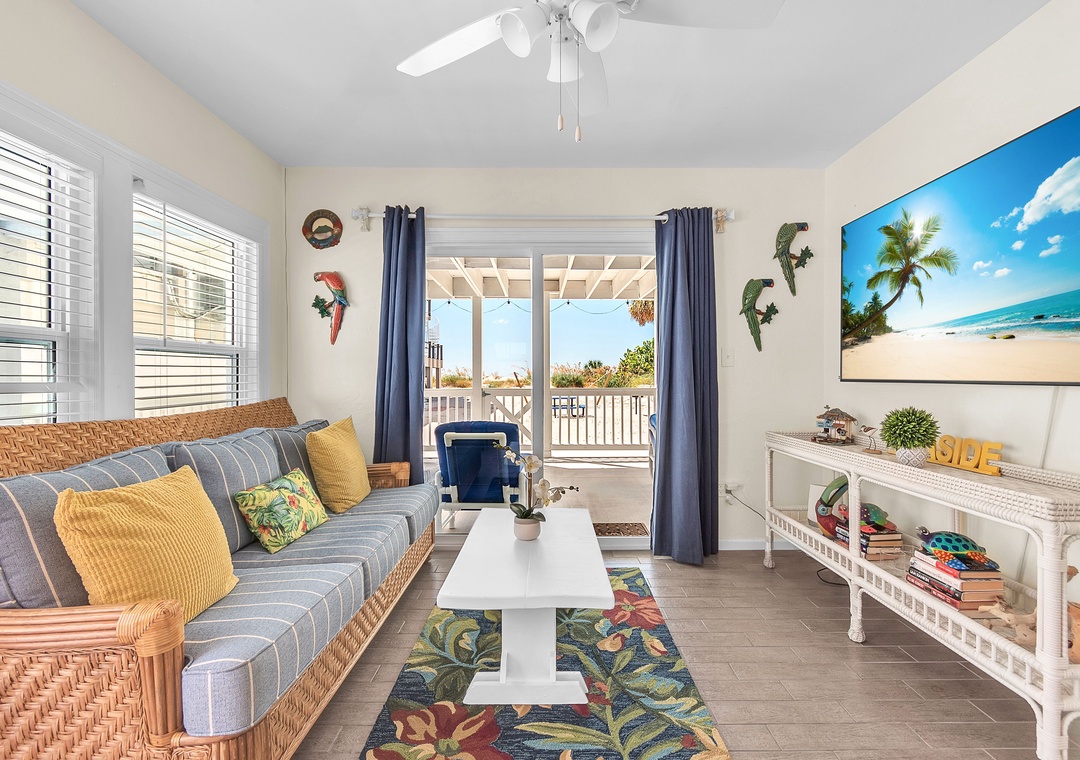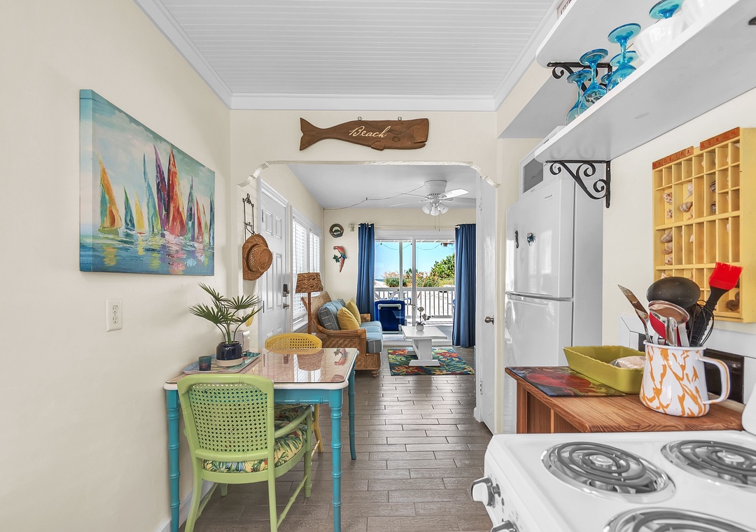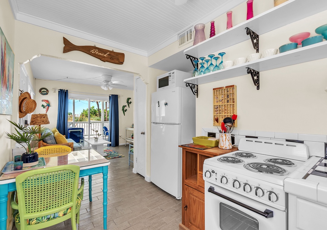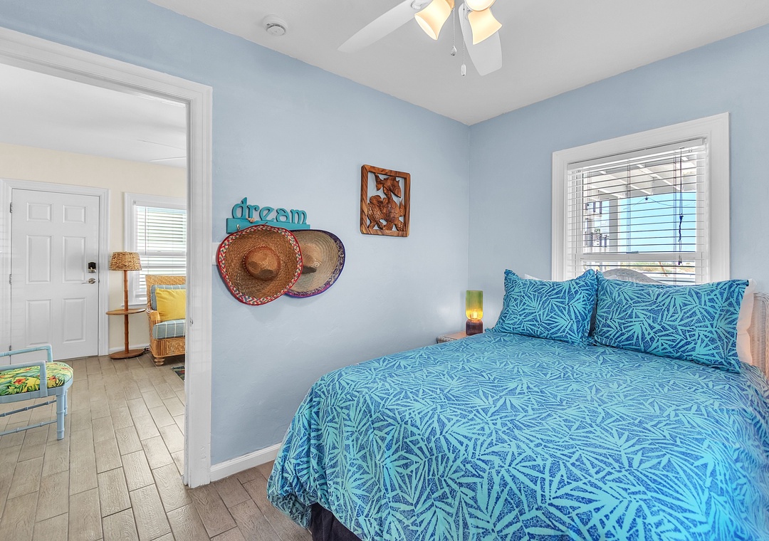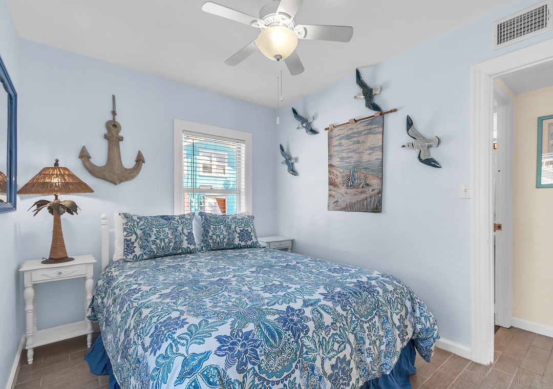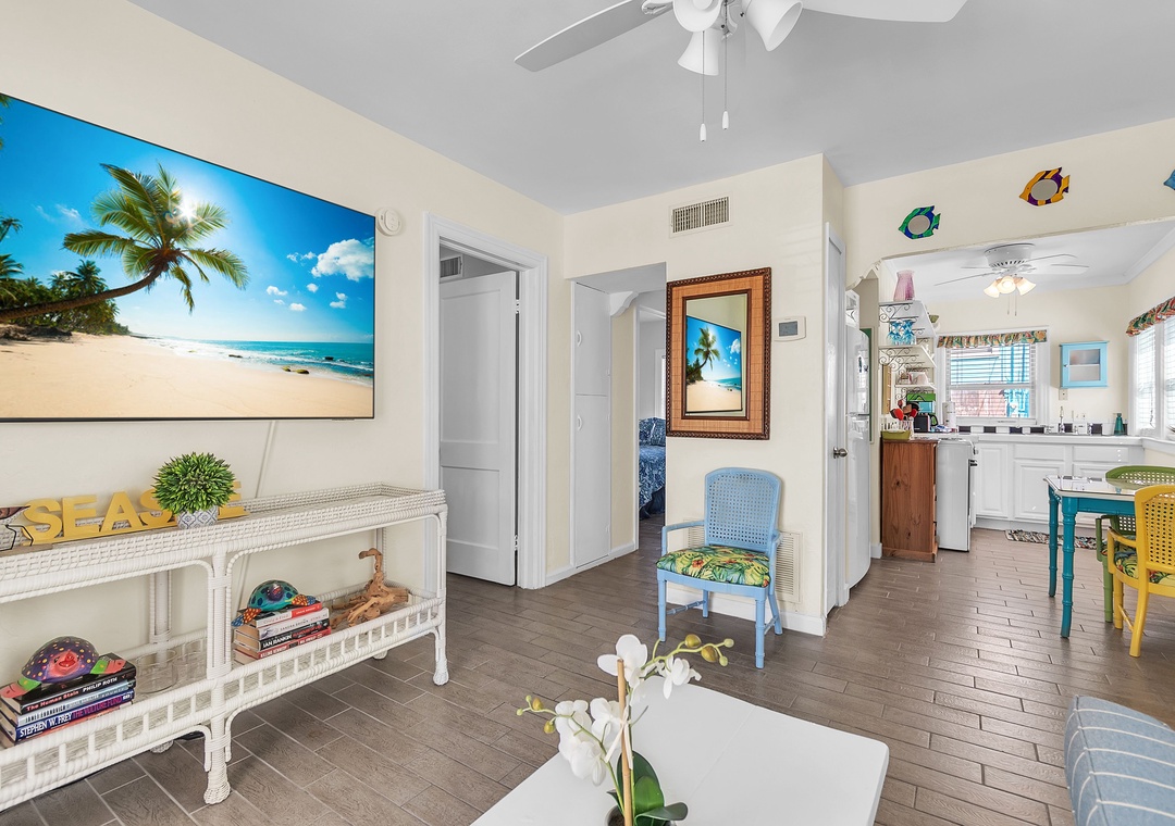 The open living area includes a comfy couch, two sitting chairs, and a SmartTV—ideal for movie nights or unwinding after a day in the sun. The living room flows into the fully equipped kitchen and dining space, where a table for four invites you to enjoy meals together or host a fun game night. While the kitchen has everything you need to cook up a storm—dishes, utensils, cookware, and appliances—please note there is no dishwasher. With 2 bright and spacious bedrooms, each featuring a comfortable queen bed, and 1 full bathroom, this cottage is perfect for a relaxing beach escape.