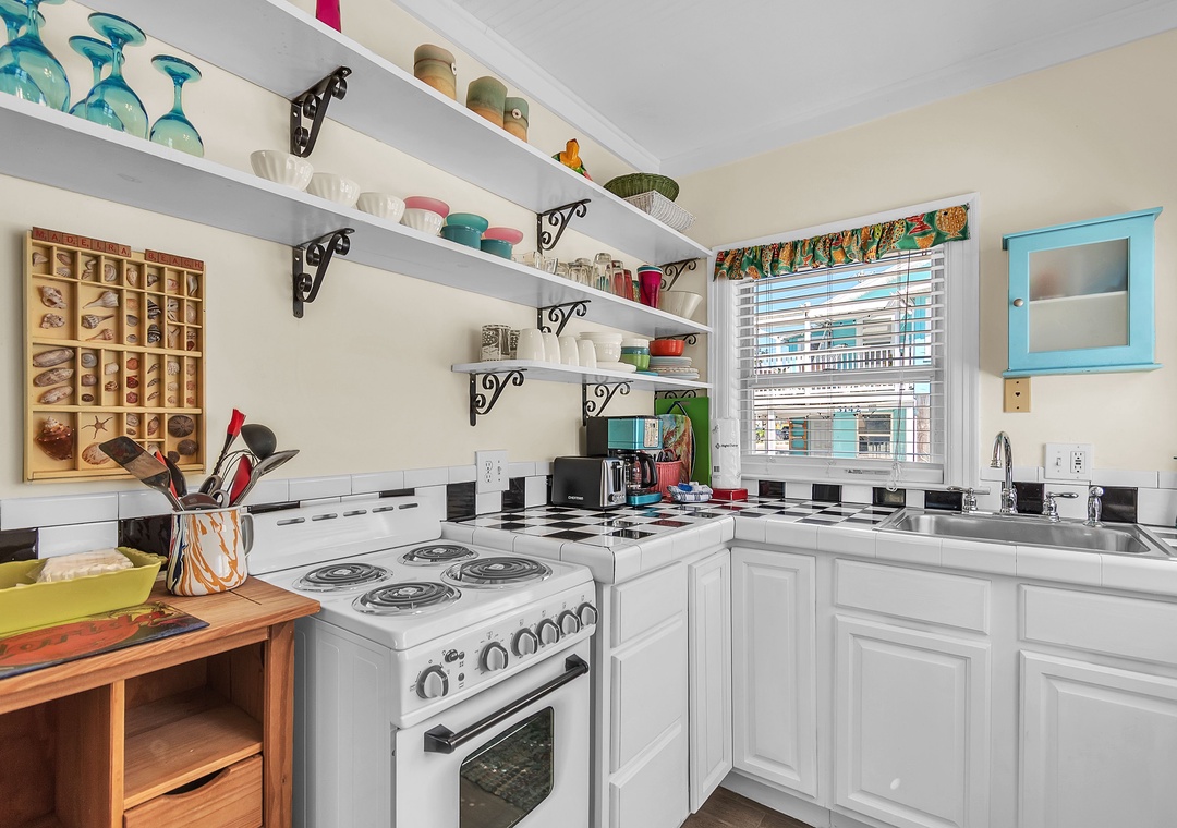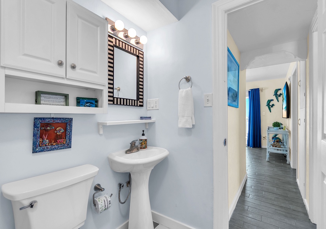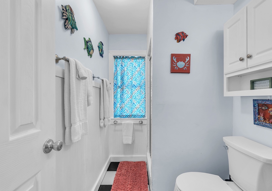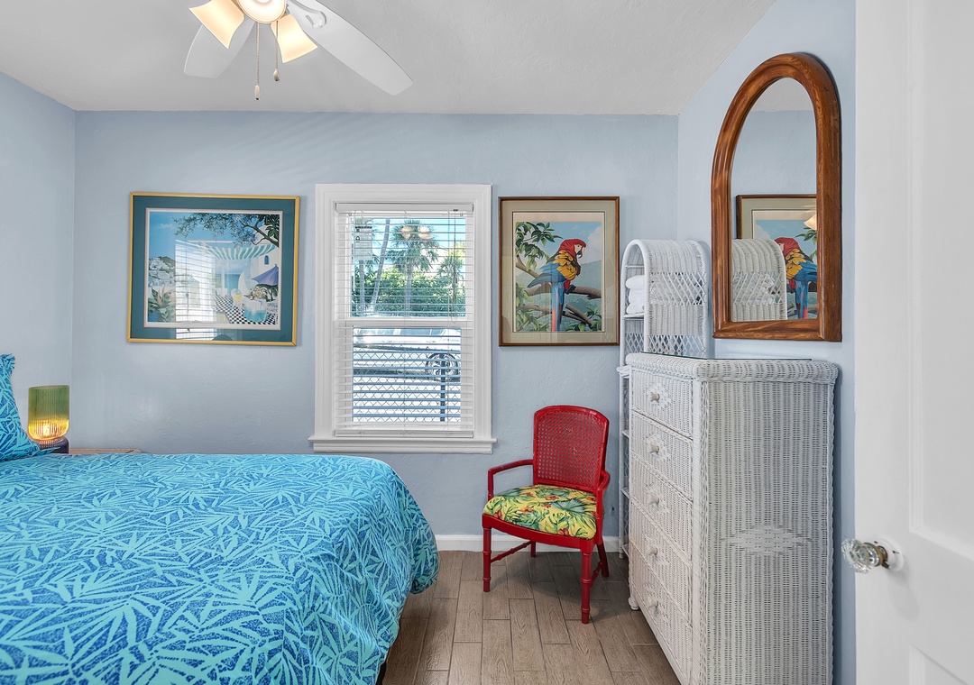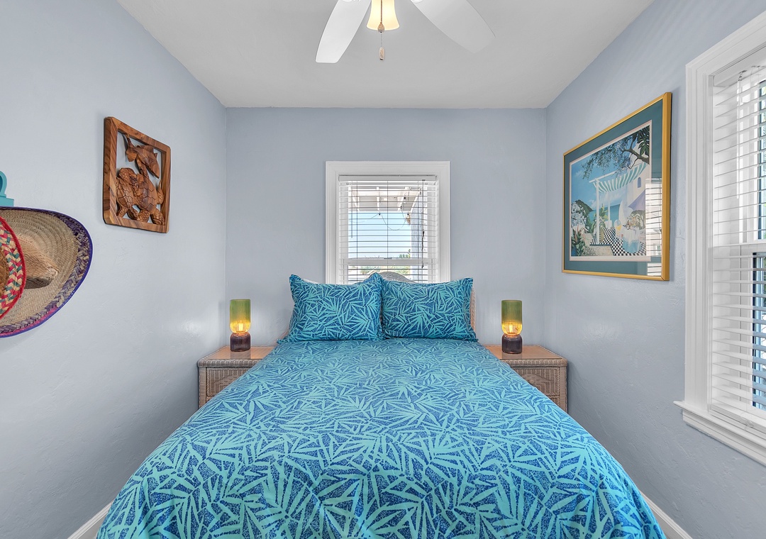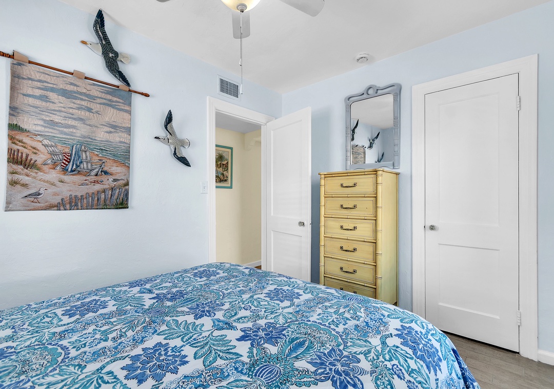 The open living area includes a comfy couch, two sitting chairs, and a SmartTV—ideal for movie nights or unwinding after a day in the sun. The living room flows into the fully equipped kitchen and dining space, where a table for four invites you to enjoy meals together or host a fun game night. While the kitchen has everything you need to cook up a storm—dishes, utensils, cookware, and appliances—please note there is no dishwasher. With 2 bright and spacious bedrooms, each featuring a comfortable queen bed, and 1 full bathroom, this cottage is perfect for a relaxing beach escape.