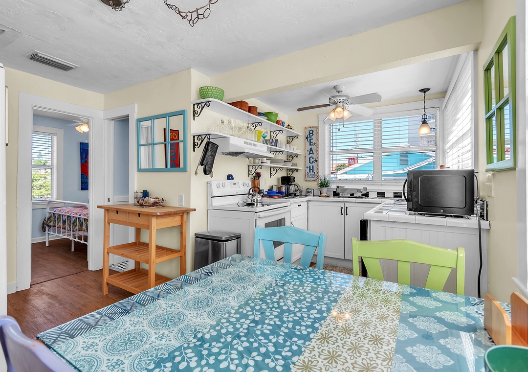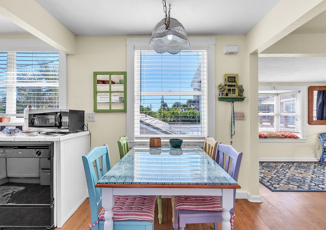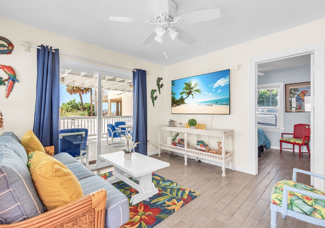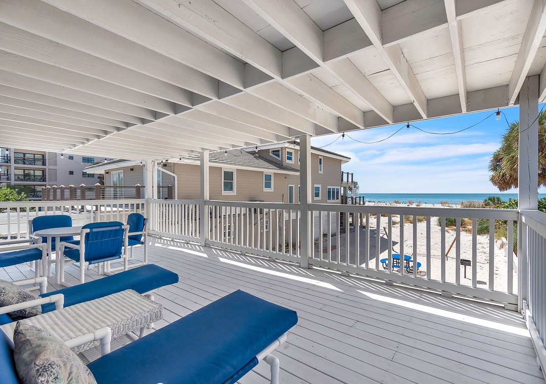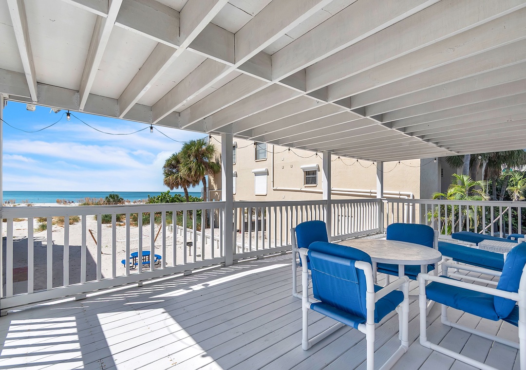 Upstairs, enjoy even more space with an open-concept living area, SmartTV, and balcony access with views of the Gulf of Mexico, a great spot to gather after your beach day and unwind while taking in the breathtaking Florida sunsets. You will find two queen bedrooms and one full bathroom here as well. A larger indoor dining table sets the scene for group meals or game nights, and the fully equipped kitchen has everything you need. Please note - stairs are required to access the upper level.
