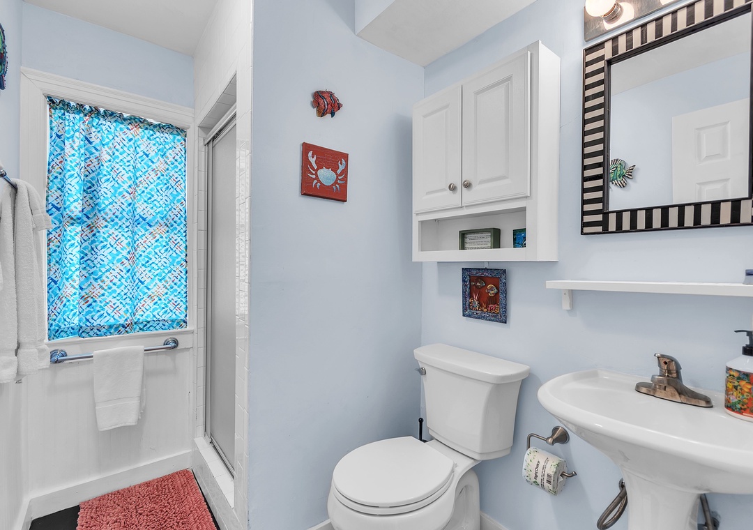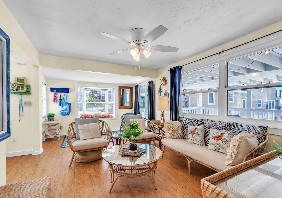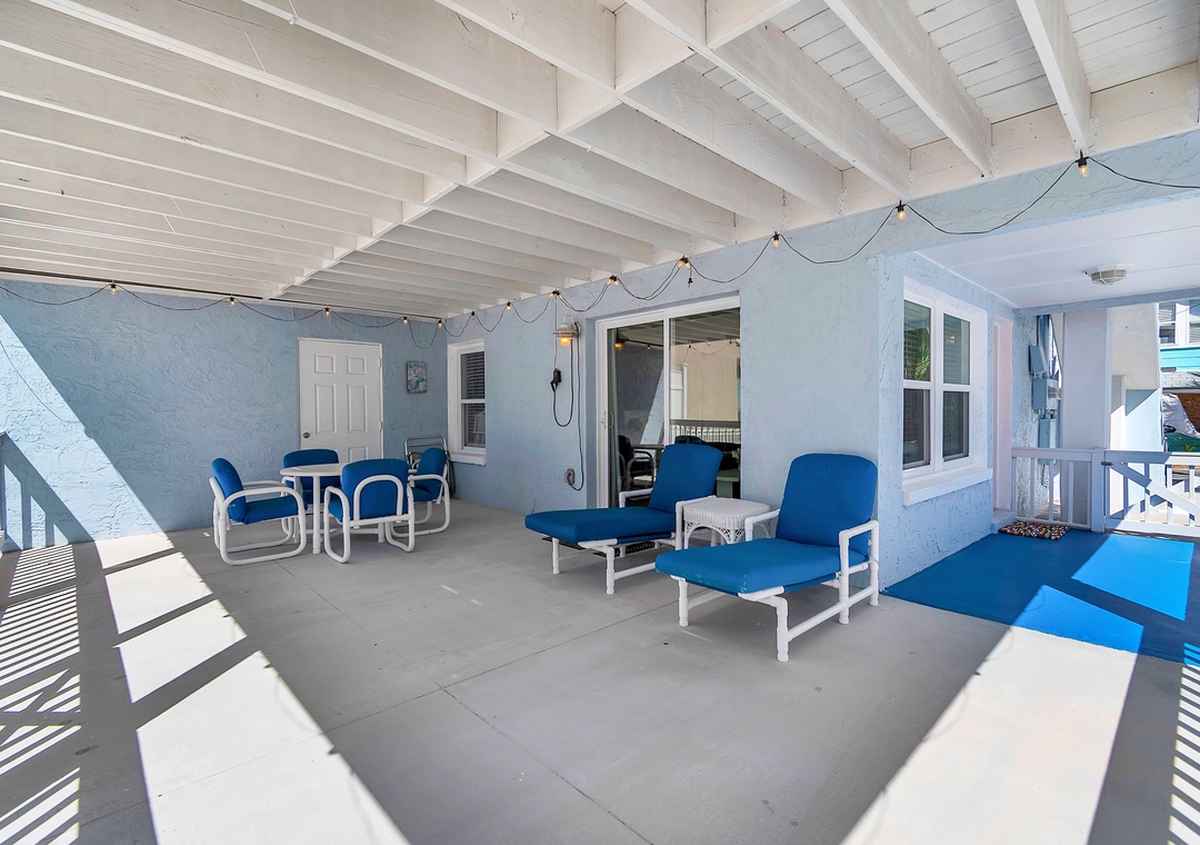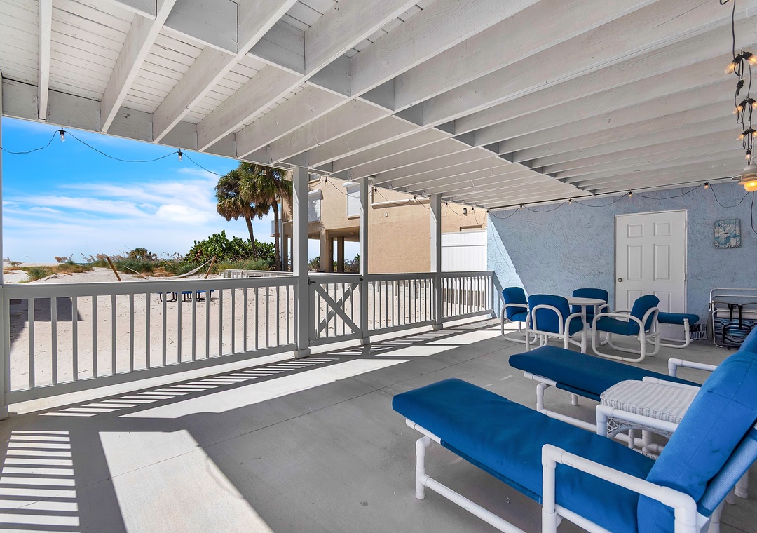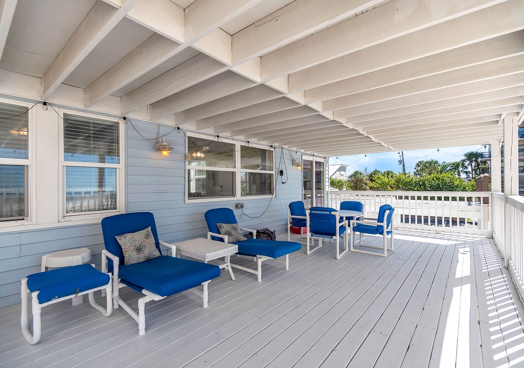 The lower level offers two queen bedrooms and one full bathroom, a bright and spacious living area with SmartTV and deck access, and a fully stocked kitchen (no dishwasher). The covered outdoor deck includes lounge chairs and a dining set—ideal for outdoor dinners or relaxing after the beach.