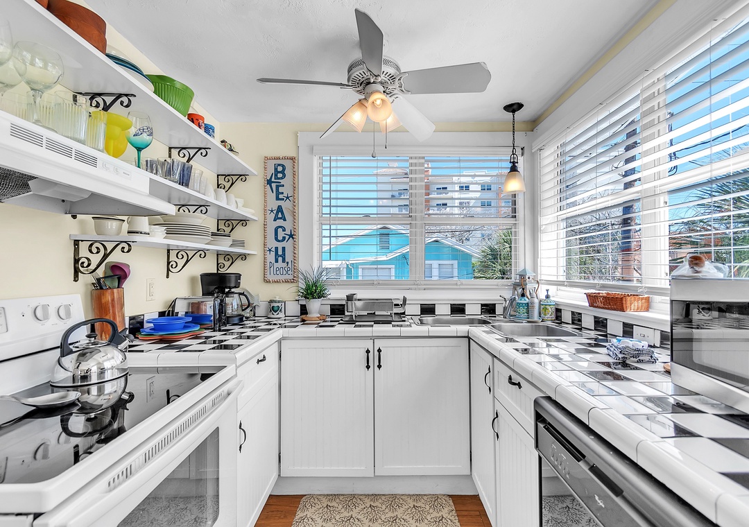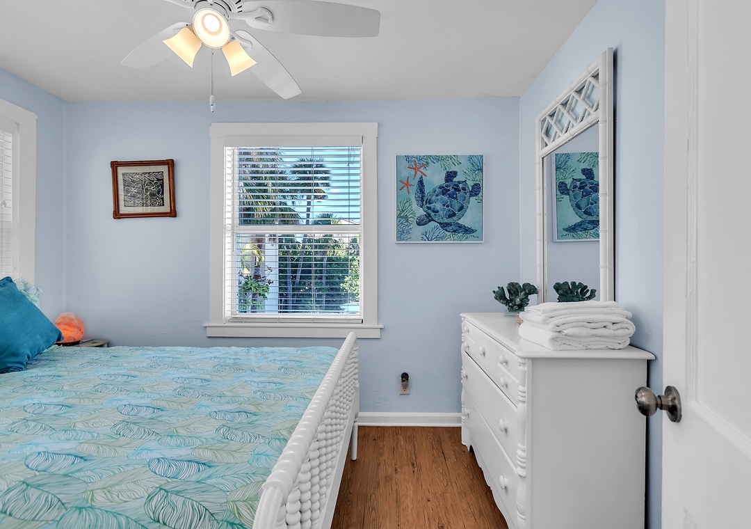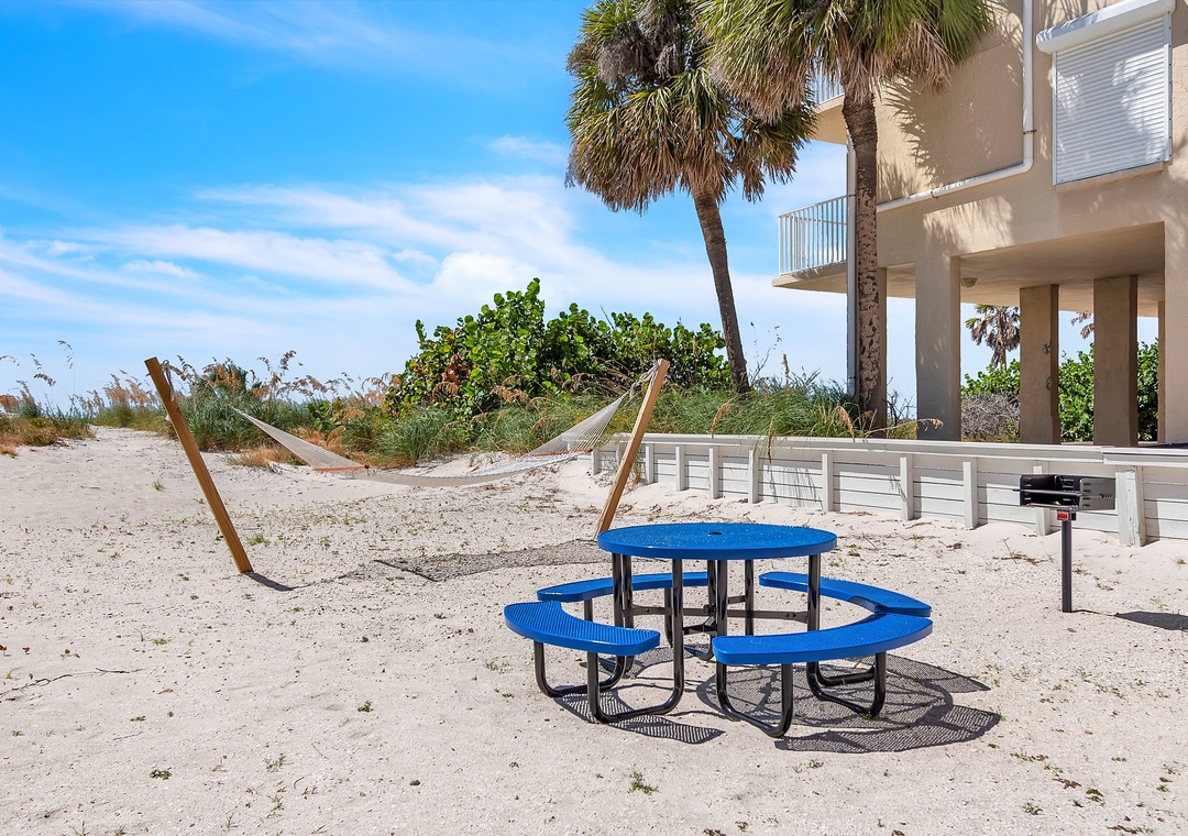 The private backyard features a sandy retreat with a hammock, charcoal grill, picnic table, and a direct path to the beach. Additional amenities include a laundry room, free WiFi, and parking for four vehicles.