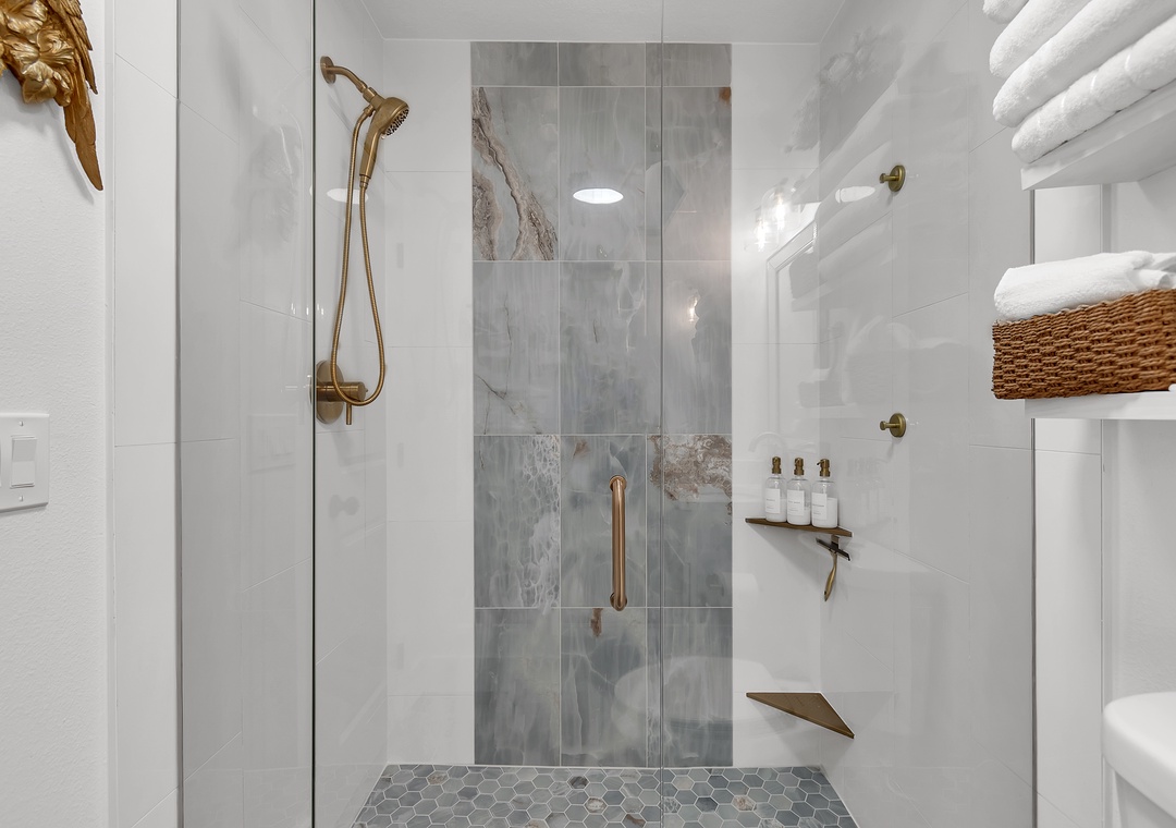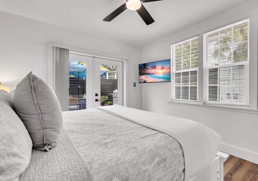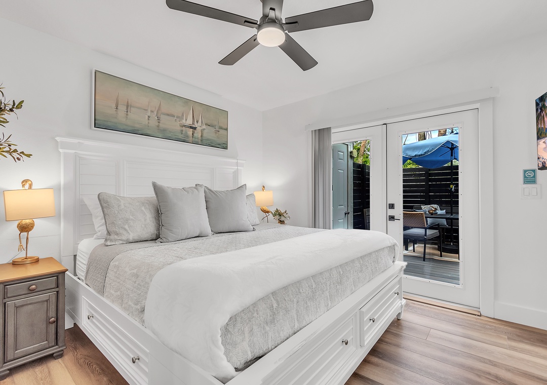 The bedroom features a comfortable king-size bed and direct access to the private patio. The bathroom is beautifully finished with elegant details, showcasing a large walk-in shower with stunning tile work and a shower head with a handheld option. The private patio is a standout feature, offering ample space with a full outdoor dining table, bench seating, chairs, an umbrella for shade, and a gas grill—ideal for relaxed evenings and grilled dinners outdoors.
