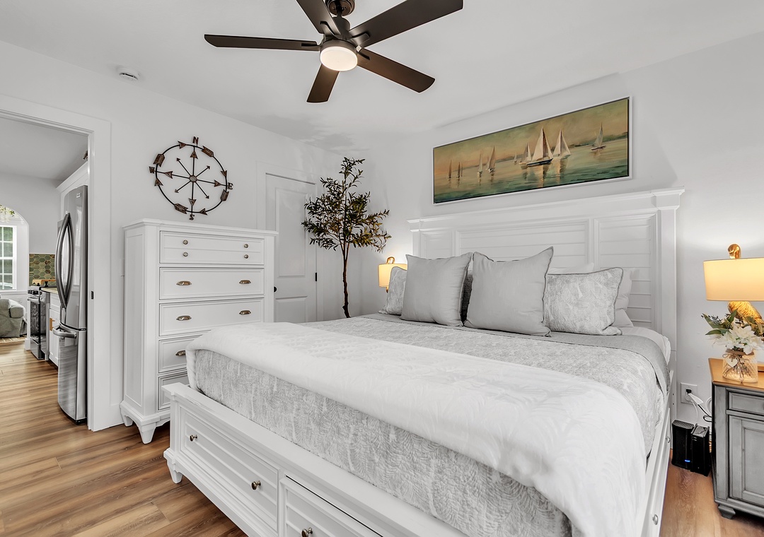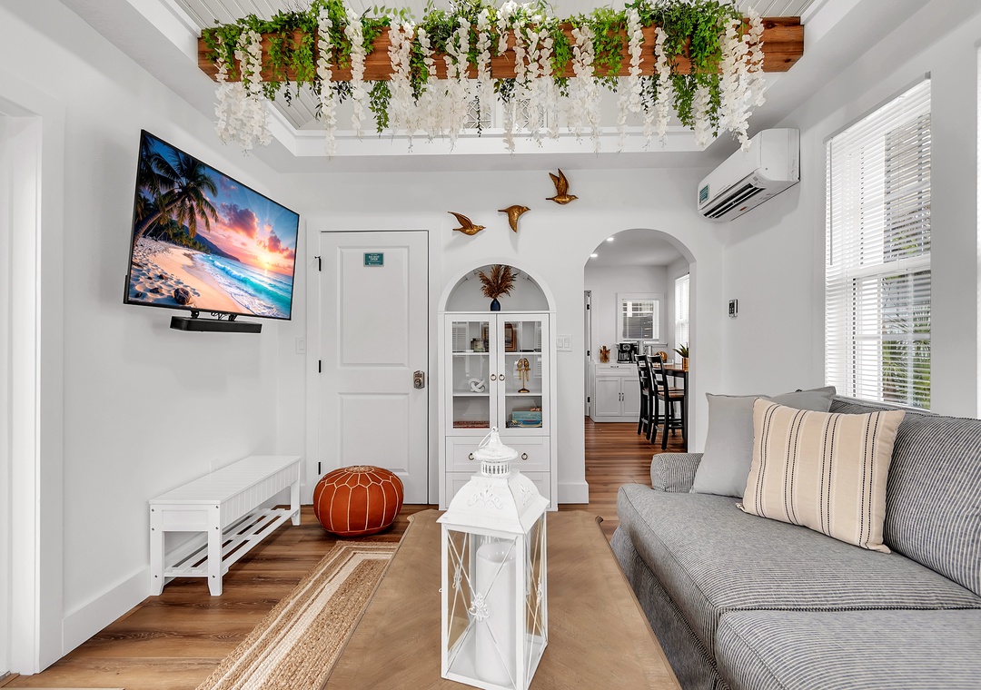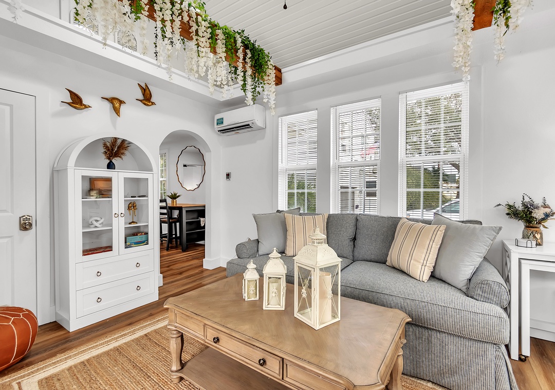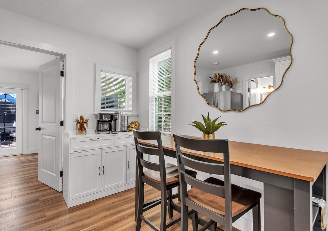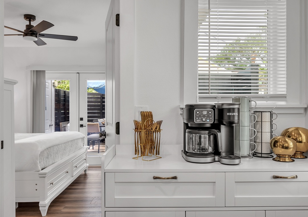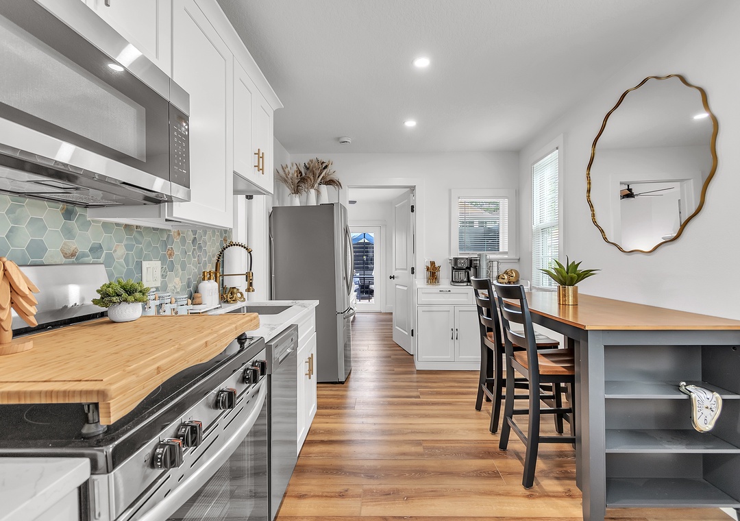 The living room is warm and welcoming, furnished with a comfy sofa (pulls out to full sized bed), coffee table, a large accent chair, and a large-screen Smart TV for your enjoyment. Just beyond is the kitchen and dining area, thoughtfully designed and fully equipped with a large refrigerator, dishwasher, oven and stove, and plenty of counter space. The kitchen is fully stocked with dishes, utensils, and cookware, making it easy to feel right at home. Enjoy meals at the indoor dining table or take them outside to dine al fresco. A charming coffee bar in the kitchen is a wonderful touch and the perfect way to start your mornings.