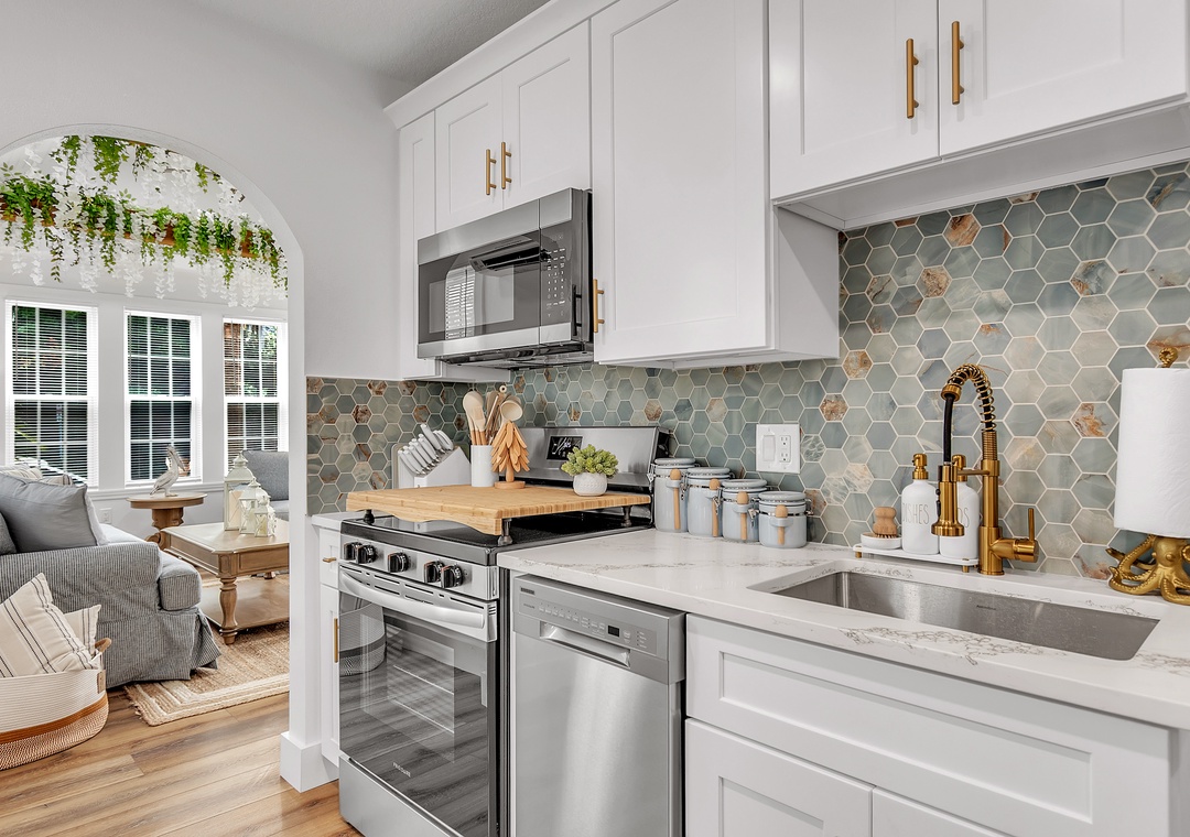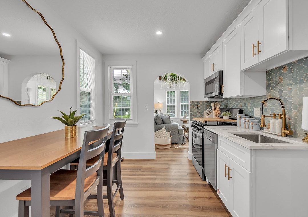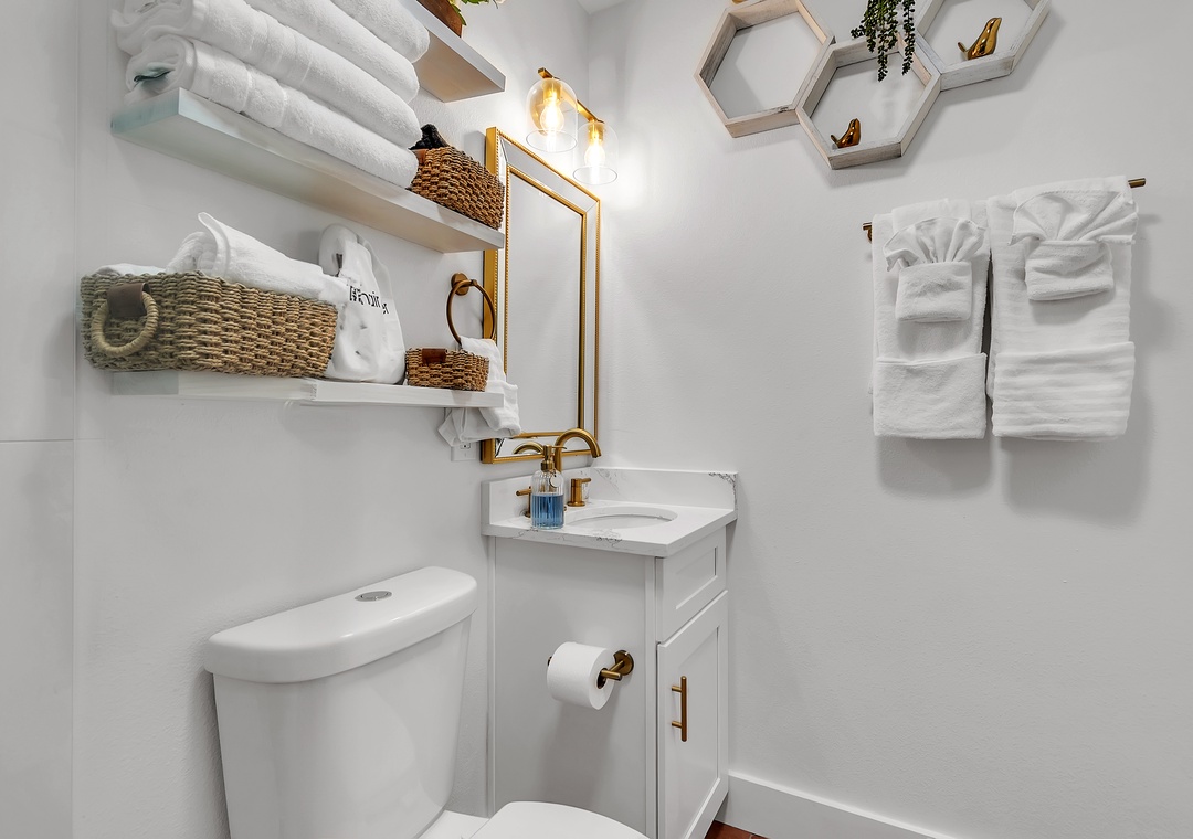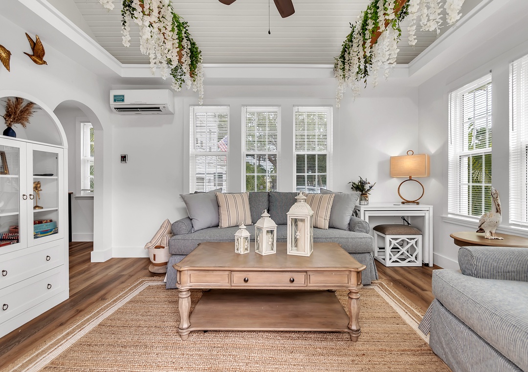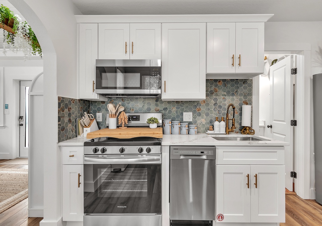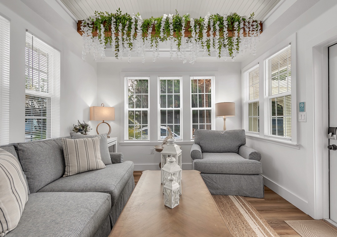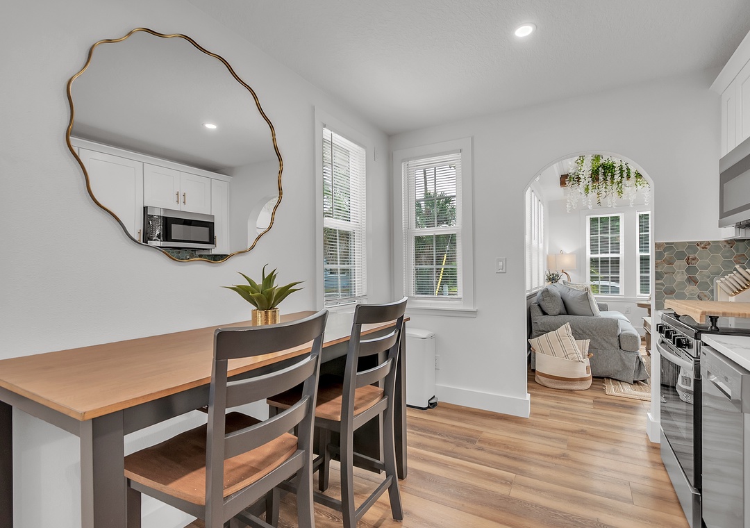 The living room is warm and welcoming, furnished with a comfy sofa (pulls out to full sized bed), coffee table, a large accent chair, and a large-screen Smart TV for your enjoyment. Just beyond is the kitchen and dining area, thoughtfully designed and fully equipped with a large refrigerator, dishwasher, oven and stove, and plenty of counter space. The kitchen is fully stocked with dishes, utensils, and cookware, making it easy to feel right at home. Enjoy meals at the indoor dining table or take them outside to dine al fresco. A charming coffee bar in the kitchen is a wonderful touch and the perfect way to start your mornings.