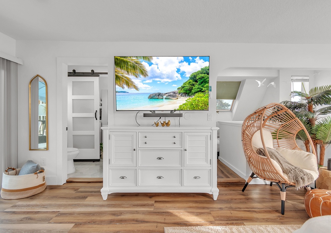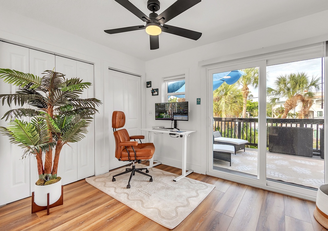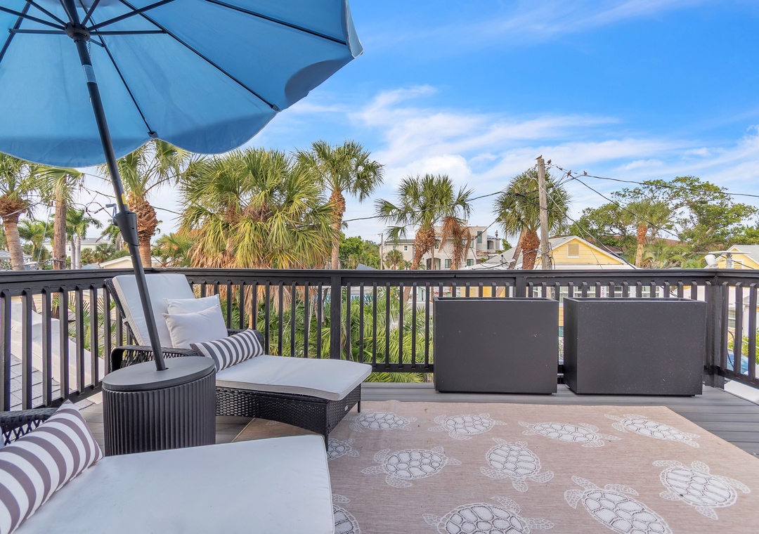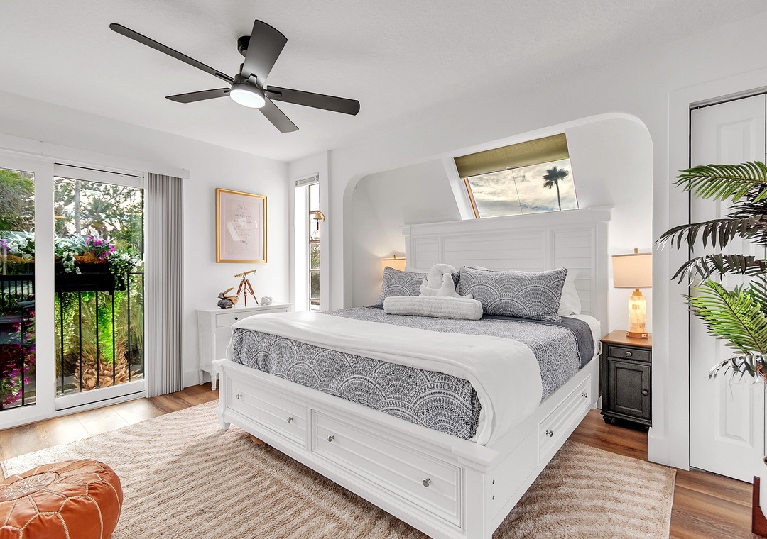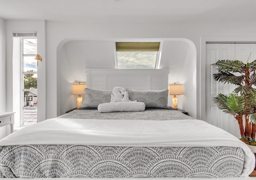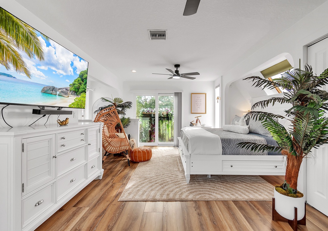 Upstairs, the primary bedroom is a serene retreat with a king bed, TV, and an attached bathroom showcasing lovely tile work and built-in shelving. The bedroom also includes a desk and chair for guests who may need to work while on vacation. Step out onto the private balcony, surrounded by tropical greenery and furnished with lounge chairs and an umbrella—an ideal spot to soak up the Florida sunshine. At the top of the stairs, a cozy bonus nook with a small twin bed offers a perfect sleeping space for one of the kids. You will also have a washer and dryer for use adding to your convenience while you travel.