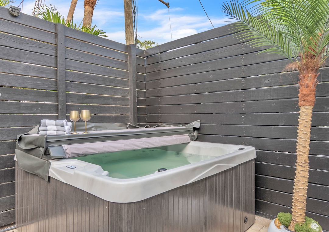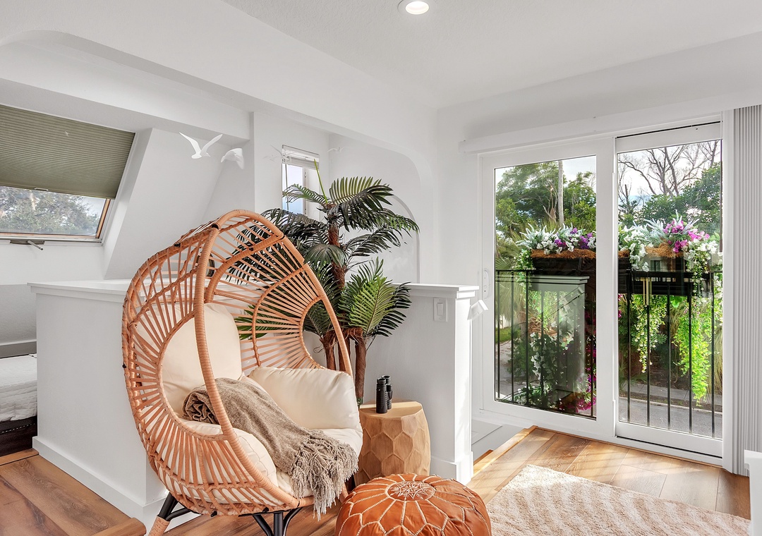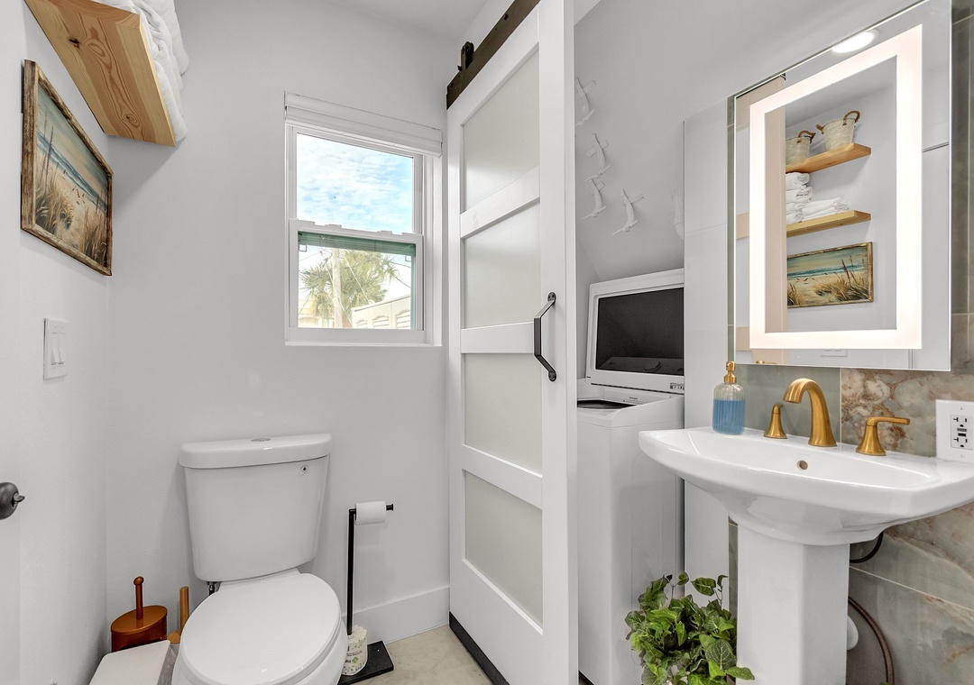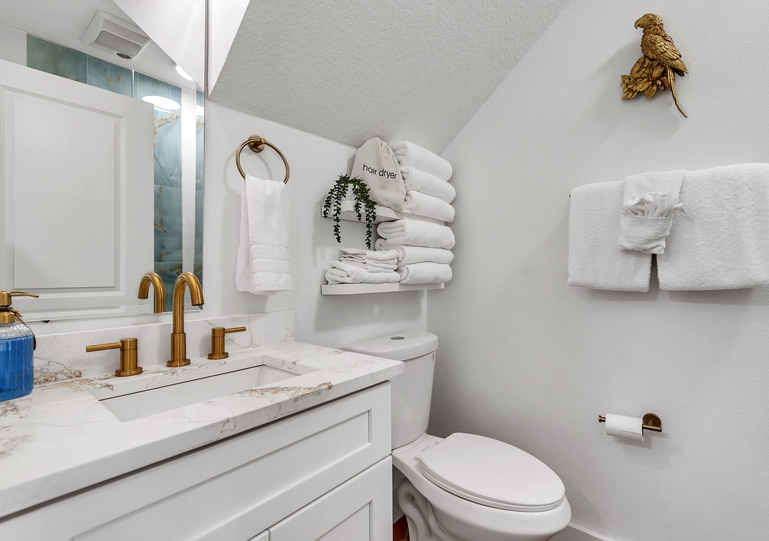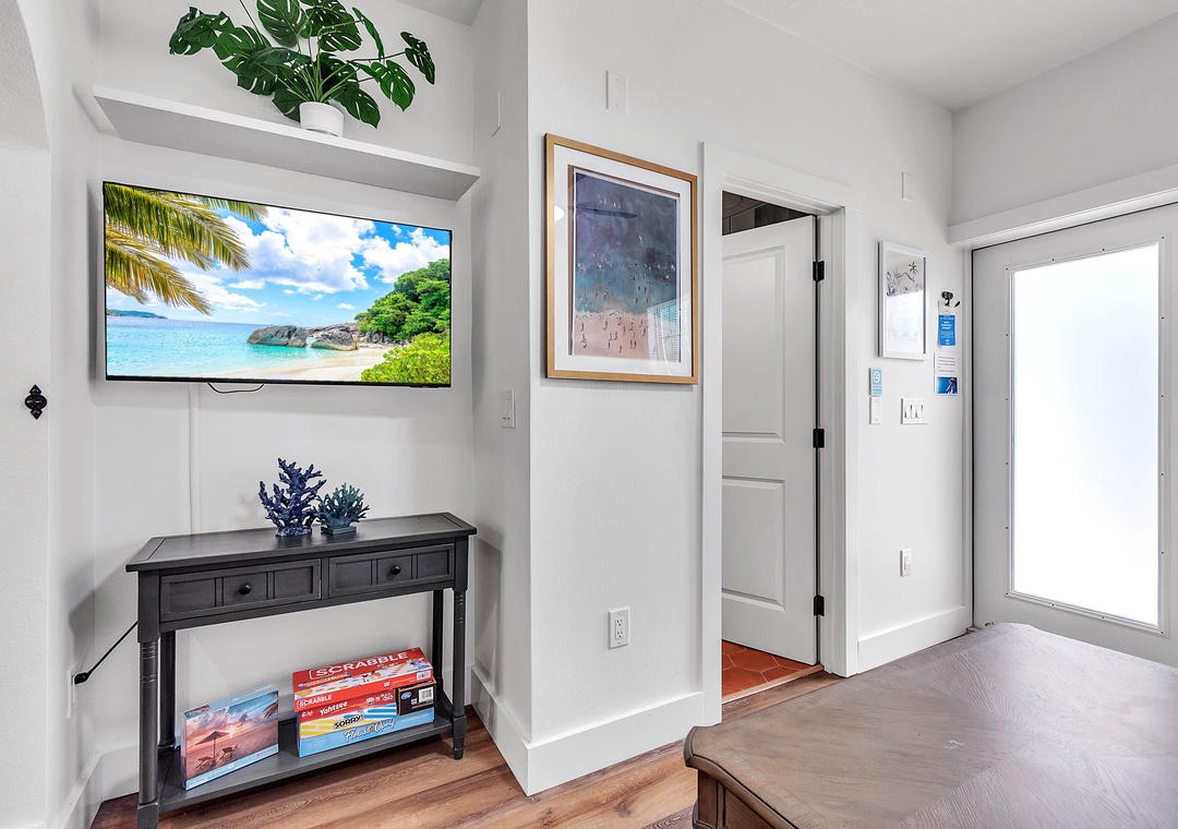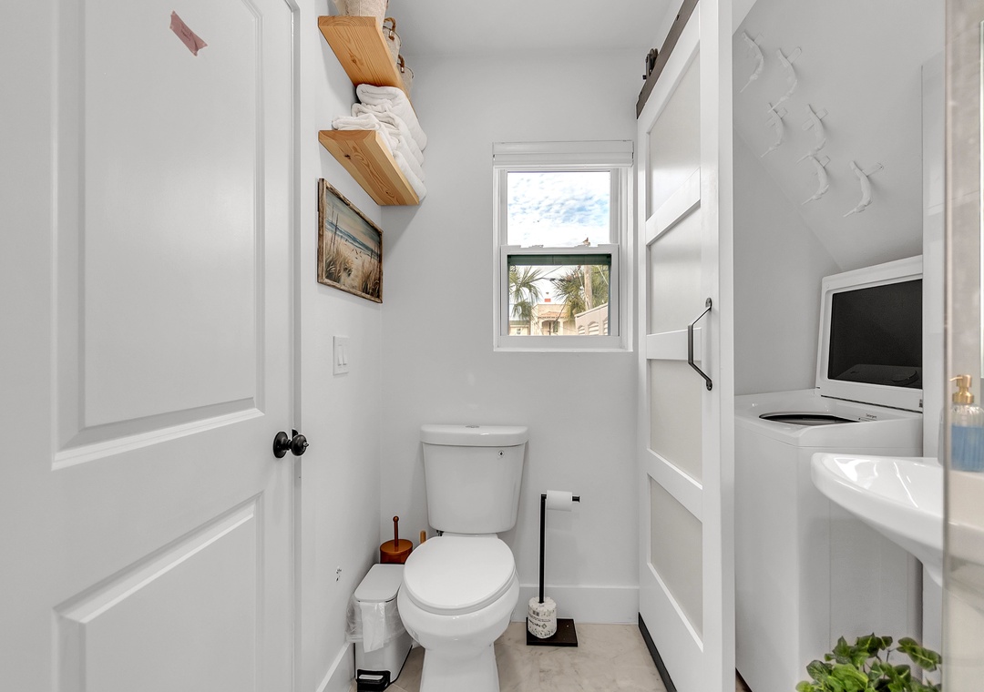 Upstairs, the primary bedroom is a serene retreat with a king bed, TV, and an attached bathroom showcasing lovely tile work and built-in shelving. The bedroom also includes a desk and chair for guests who may need to work while on vacation. Step out onto the private balcony, surrounded by tropical greenery and furnished with lounge chairs and an umbrella—an ideal spot to soak up the Florida sunshine. At the top of the stairs, a cozy bonus nook with a small twin bed offers a perfect sleeping space for one of the kids. You will also have a washer and dryer for use adding to your convenience while you travel.