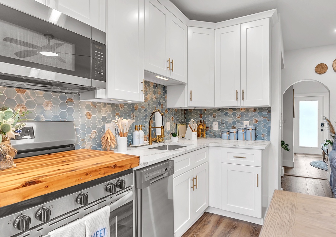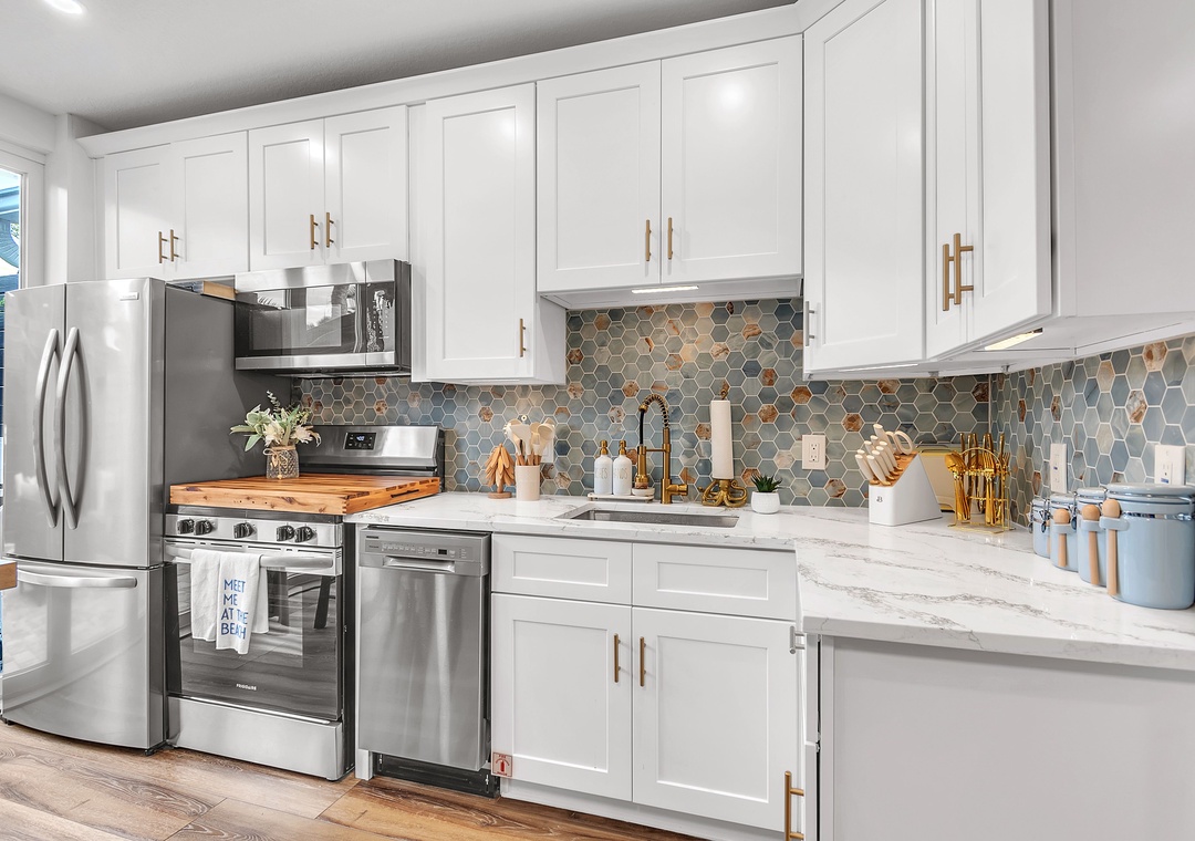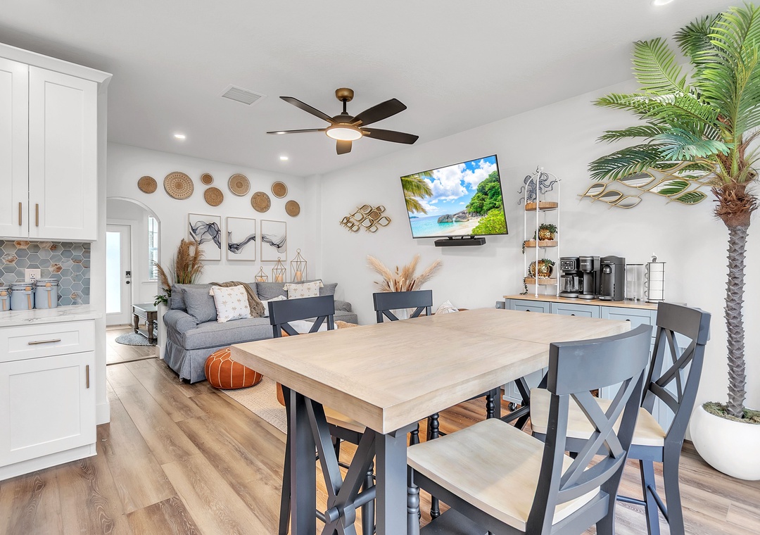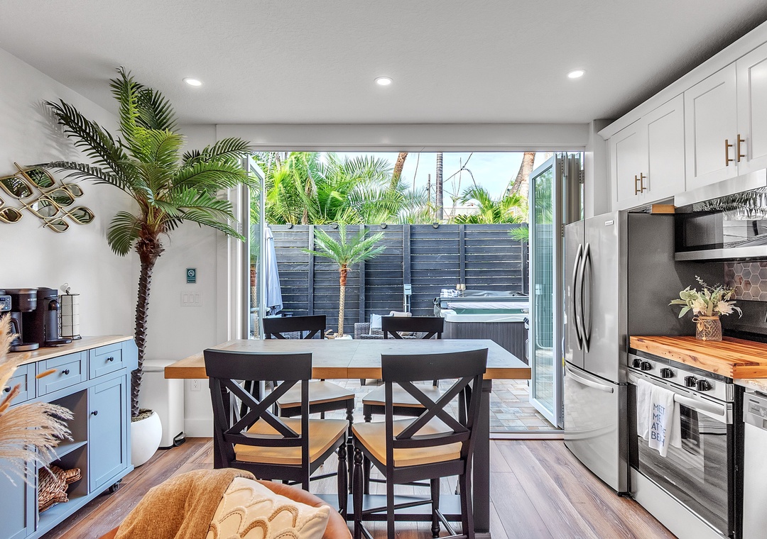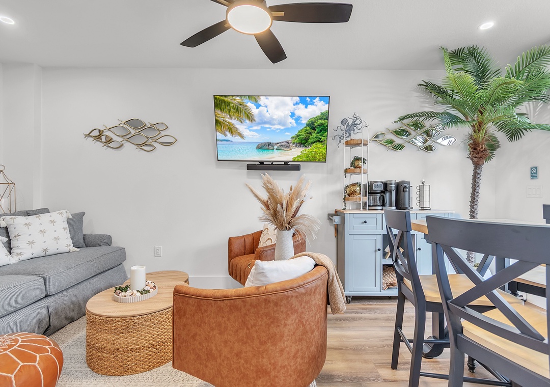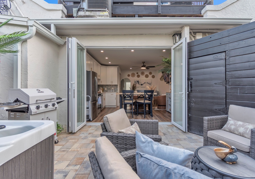 The main living area is bright and comfortable, offering a couch that also converts to a full-size bed, two sitting chairs, and a large-screen TV. This space flows openly into the dining and kitchen areas, creating a welcoming environment for gathering and entertaining. A full-size dining table is perfect for indoor meals or fun nights of board games and cards. The spacious, nicely updated kitchen features new stainless steel appliances, is fully stocked with cookware, dishes, and utensils, and includes a built-in coffee bar. From the living area, the lower-level patio doors open fully across an entire wall, creating an exceptional indoor/outdoor living experience and leading directly to your private patio with comfy seating, a gas grill, and a relaxing hot tub.