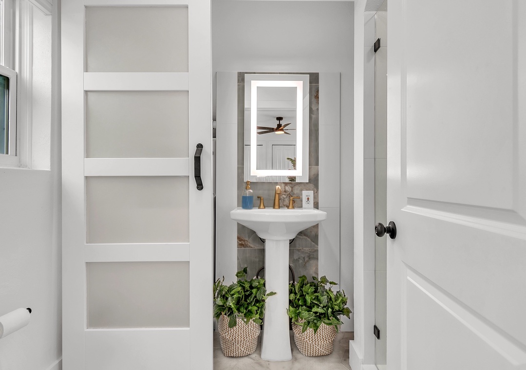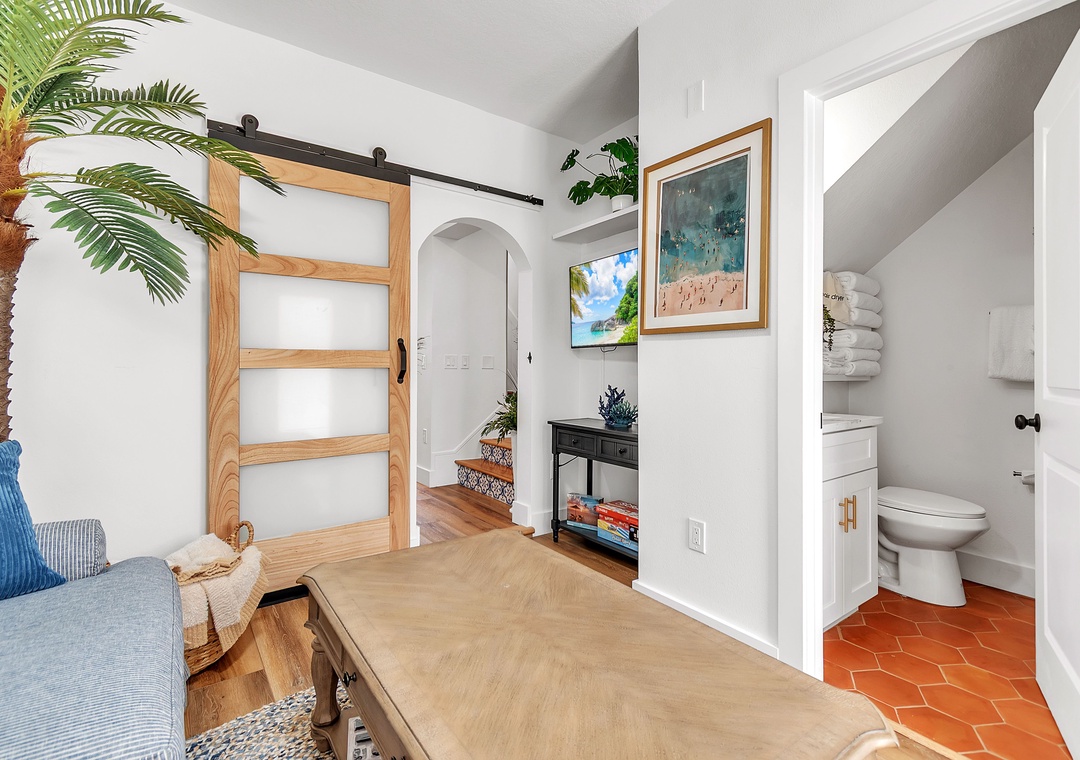 Upon entry, you’ll find a versatile secondary living area that can be closed off for added privacy. This room features a sofa that pulls out to a full-size bed, a Smart TV, and access to the lower-level bathroom, making it ideal as an extra living space or sleeping area. The lower-level bathroom is beautifully updated with elegant tile work, a walk-in shower, and a handheld shower option.